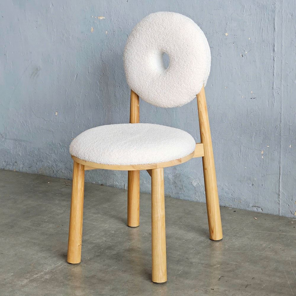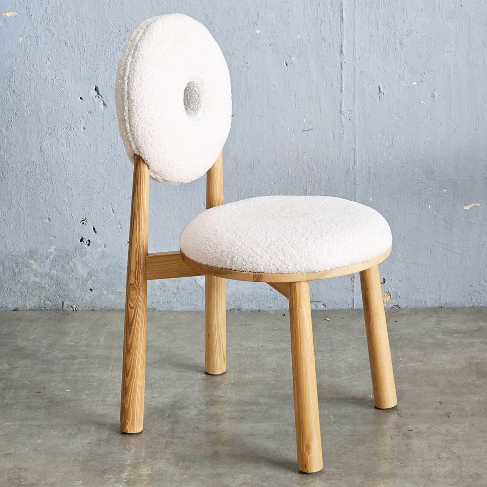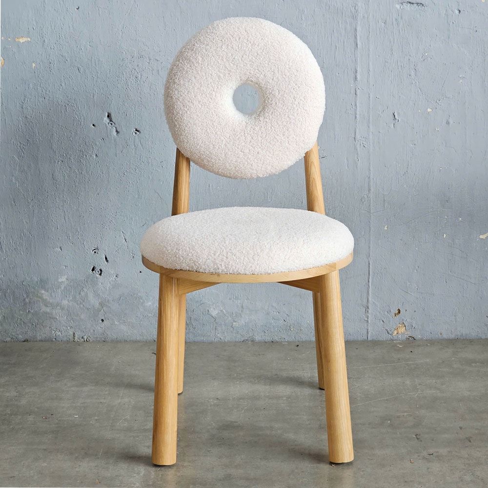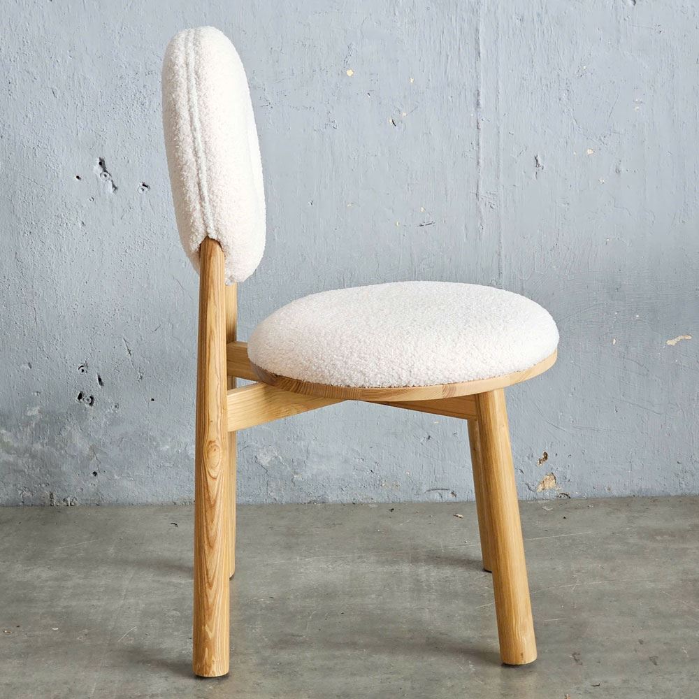 Chân ghế được làm từ gỗ tần bì tự nhiên, với những đường vân gỗ tinh tế hiện lên rõ nét, mang đến vẻ đẹp mộc mạc, gần gũi với thiên nhiên. Màu sắc gỗ tự nhiên ấm áp, hòa quyện cùng màu trắng kem của lớp vải boucle, tạo nên một bảng màu trung tính, dễ dàng phối hợp với nhiều phong cách nội thất khác nhau.