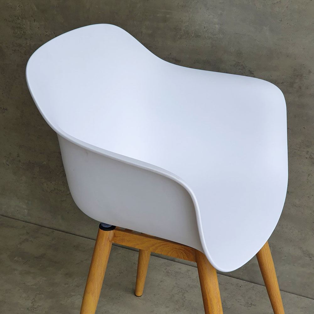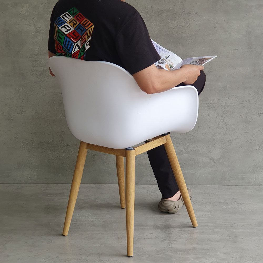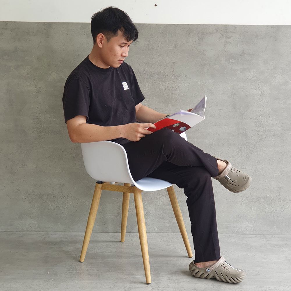 Chất liệu lưng ghế là loại nhựa PC cao cấp, đảm bảo độ cứng cáp và bền bỉ trong quá trình sử dụng. Chân ghế được làm bằng sắc cực kỳ vững chắc, với khả năng chịu lực tốt. Bề mặt chân sắt được phủ lớp sơn giả gỗ giúp mang lại tính thẩm mỹ cao, đồng thời giúp bảo vệ chất sắt không bị gỉ sét bởi tác động từ môi trường.