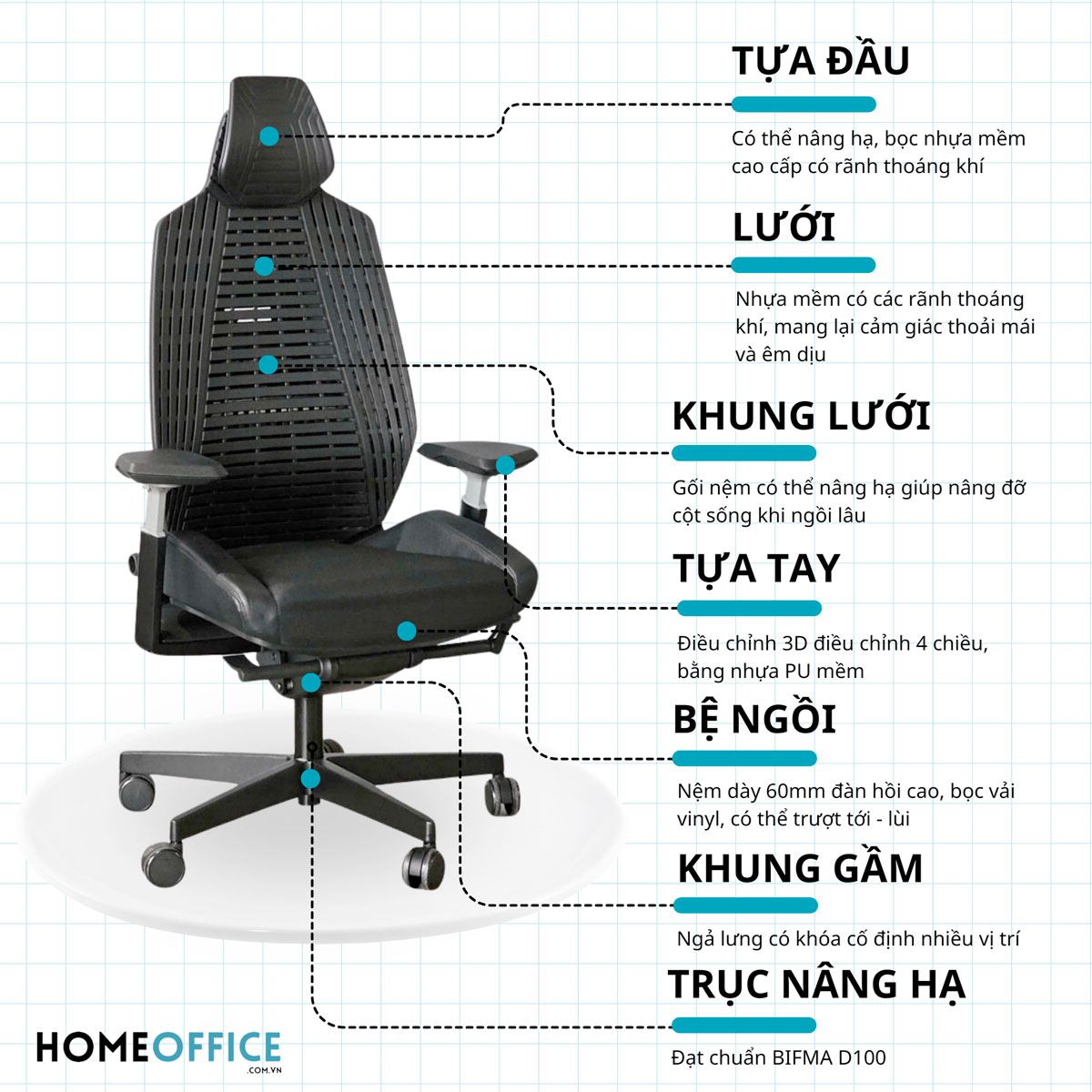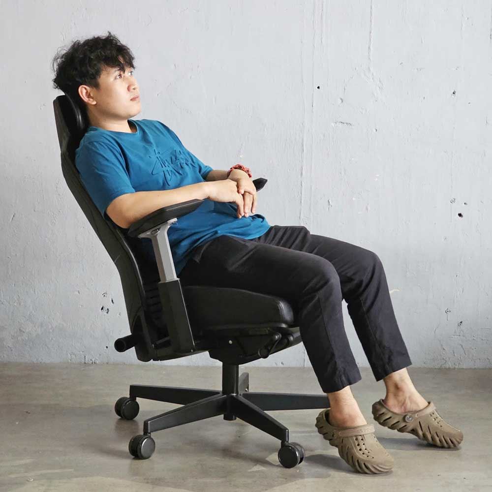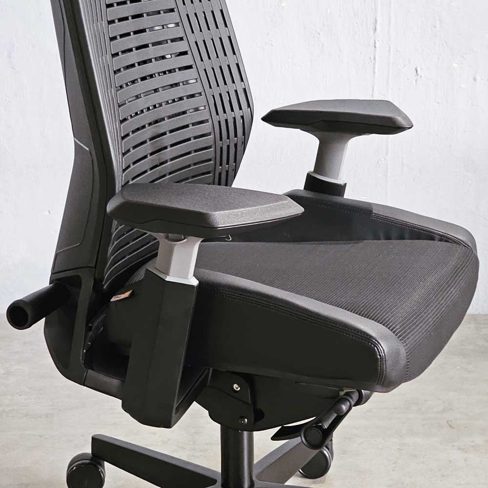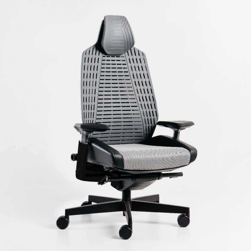 4. Nệm: Nệm ghế lấy cảm hứng từ xe thể thao Bọc nệm lưới polyester sandwich "RIBS" với 4 màu. Có thể điều chỉnh chiều cao 10cm và chiều sâu 5cm.