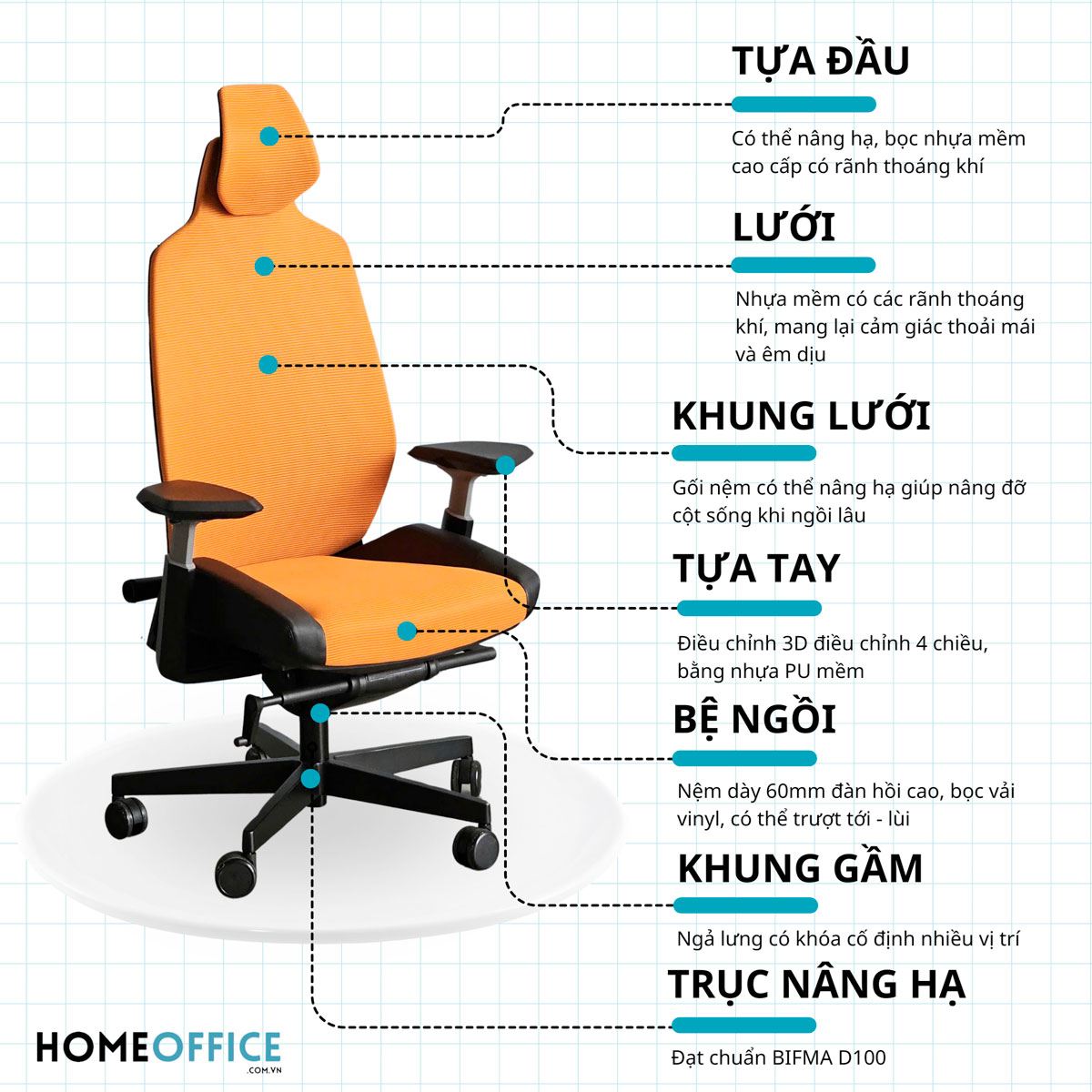 Ghế được làm bằng chất liệu nhựa lưới thoáng khí cùng đệm mút dày dặn mang đến sự thoải mái suốt nhiều giờ. Quạt tản nhiệt tiên tiến giúp luân chuyển không khí, tạo cảm giác mát mẻ, sảng khoái. Tính năng điều chỉnh linh hoạt độ cao, độ nghiêng, gác tay... dễ dàng tùy chỉnh theo sở thích và nhu cầu cá nhân.