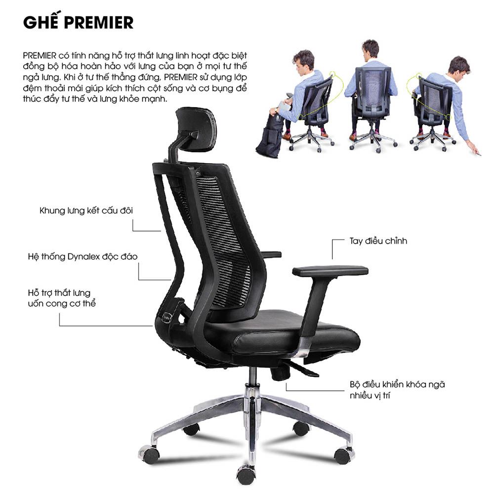 Ghế công thái học Premier - RPB002 mẫu ghế văn phòng cao cấp dành cho lãnh đạo hoặc những người làm việc chuyên nghiệp tại nhà, ngồi thường xuyên trên máy tính với thiết kế ghế công thái học giúp đỡ cột sống, điều chỉnh tư thế ngồi tốt cho sức khỏe, giảm thiểu các bệnh thường gặp cho dân văn phòng. Ghế với tựa đầu tăng giảm chiều cao bọc da với khung lưng ghế bọc lưới thiết kế hỗ trợ cột sống, tay ghế điều chỉnh 4 chiều và nệm ngồi đàn hồi cao cấp. Ghế sử dụng bộ điều khiển cao cấp đa chức năng và khung chân ghế đường kính lớn rất vững chãi.