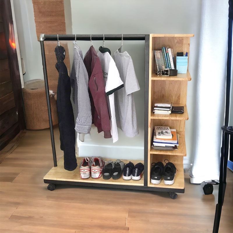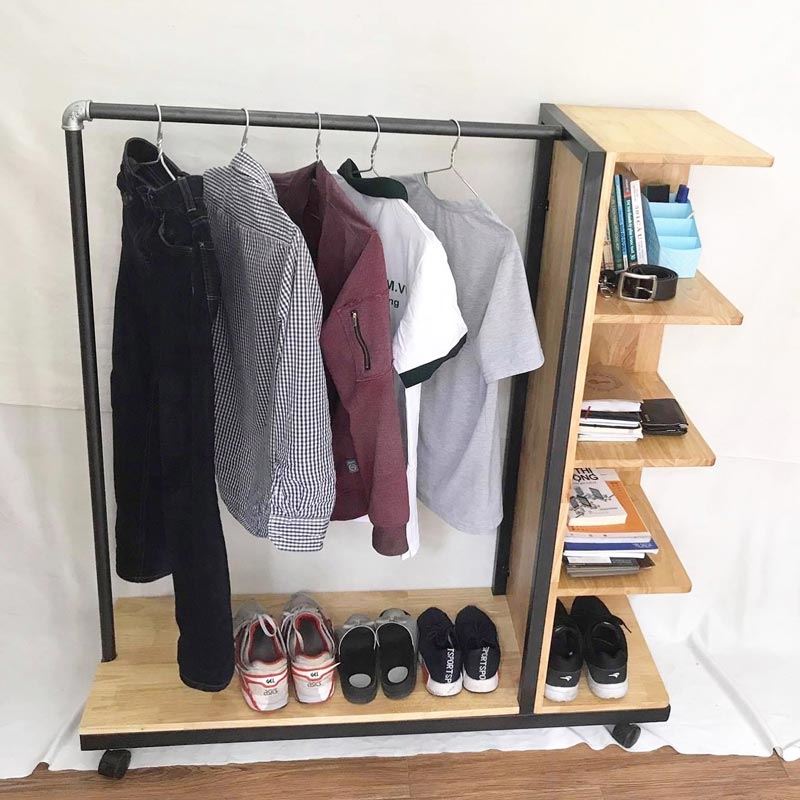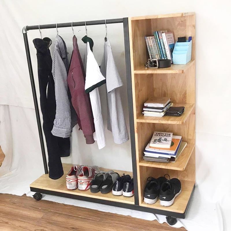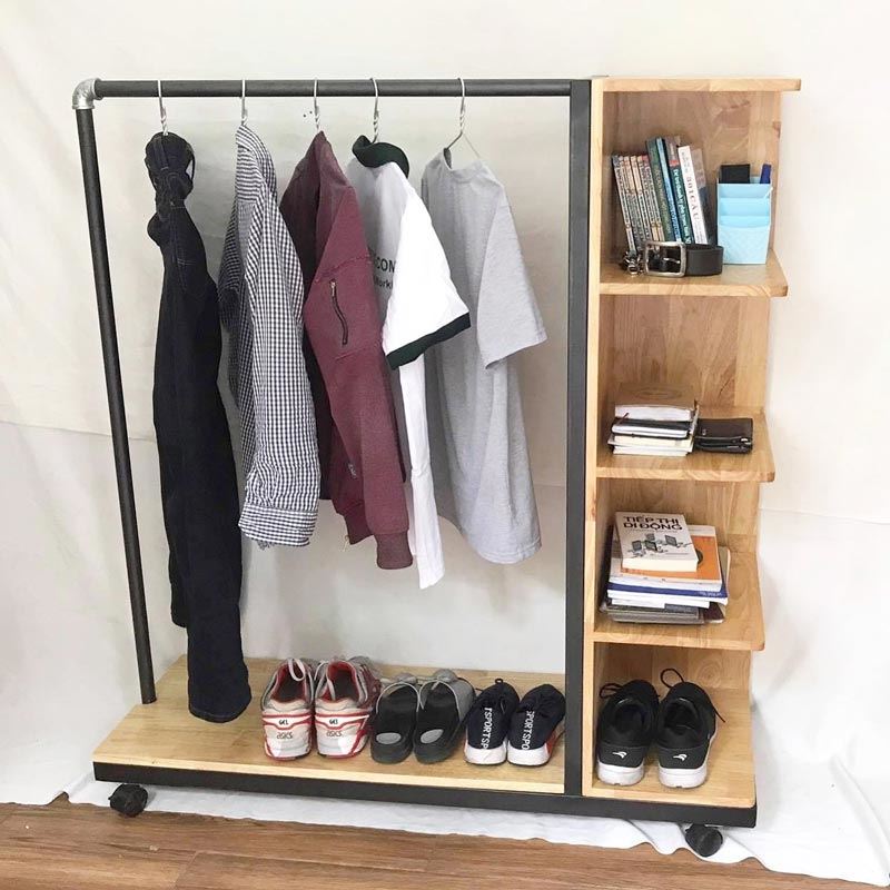 Kệ treo quần áo ống nước gỗ tự nhiên KTD68004 có thiết kế độc đáo và tiện lợi với 2 phần là kệ treo quần áo bằng ống nước và kệ gỗ để đồ. Kệ ống nước chiều dài 90cm giúp treo quần áo được gọn gàng, ngăn nắp và phía bên dưới là tấm gỗ bạn có để giày dép hay các món đồ thường sử dụng. Phía bên phải là kệ gỗ chia thành 4 tầng để được nhiều món vật dụng hay trưng bày đồ trang trí. Bên cạnh đó, dưới chân kệ gắn bánh xe có khoá tăng độ linh hoạt, giúp việc di chuyển dễ dàng hơn.