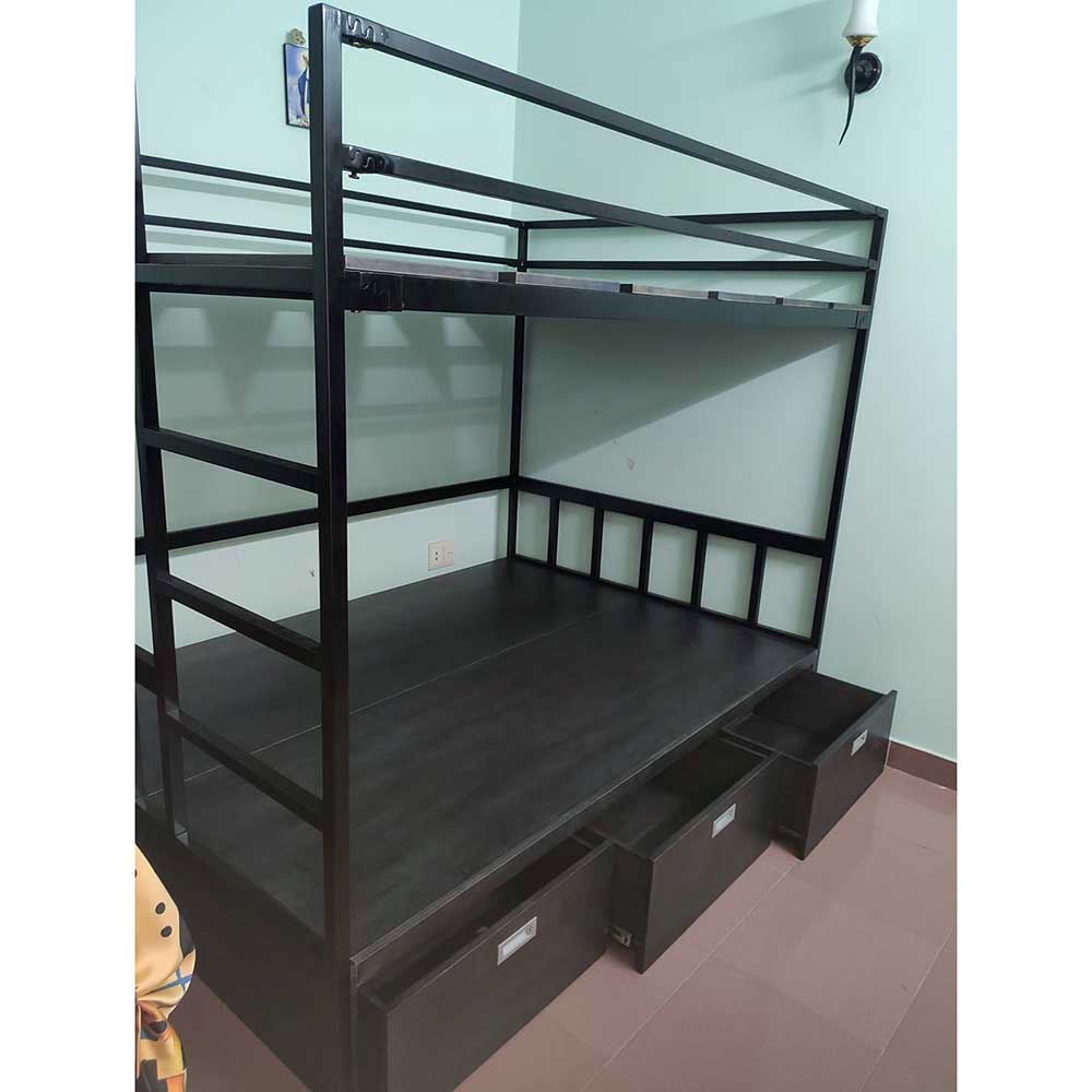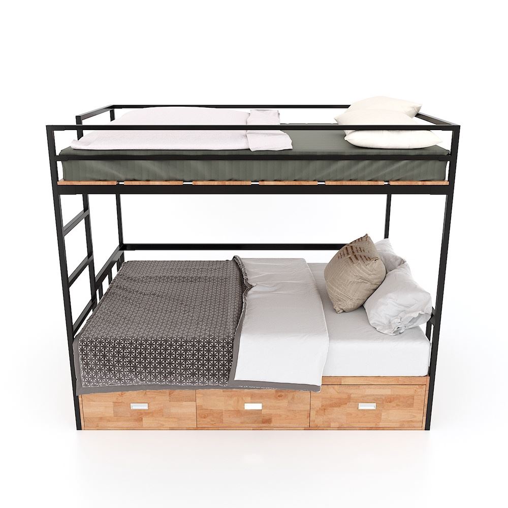 Giường tầng 140x200cm kết hợp hộc tủ GT007 với hệ khung sắt lắp ráp sơn tĩnh điện vô cùng chắc chắn và khoa học kết hợp với gỗ cao su tiêu chuẩn AA sơn Pu hoàn thiện với hai màu chính là gỗ tự nhiên và màu nâu lau, mặt gỗ đẹp có thể nằm với chiếu hoặc nệm đều được. Đặc biệt với thiết kế độc đáo và tiện ích cao khi kết hợp hộc tủ 3 ngăn kéo tăng tối đa khả năng lưu trữ giúp phòng ngủ luôn gọn gàng, ngăn nắp mang đến không gian thoáng đáng. Đây chắc chắn là sự lựa chọn tuyệt vời cho phòng ngủ có diện tích khiêm tốn, phù hợp với các chung cư - căn hộ hiện nay.