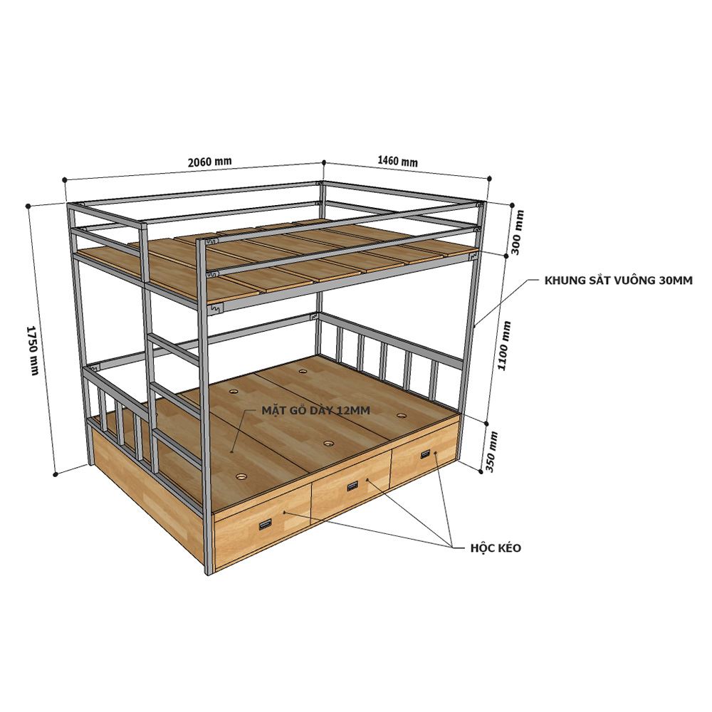Kích thước giường tầng kết hợp hộc tủ GT007