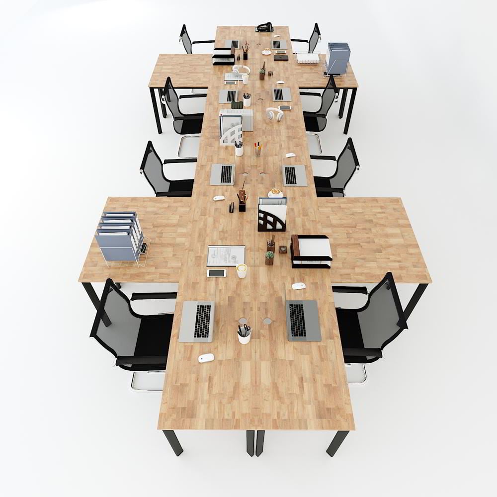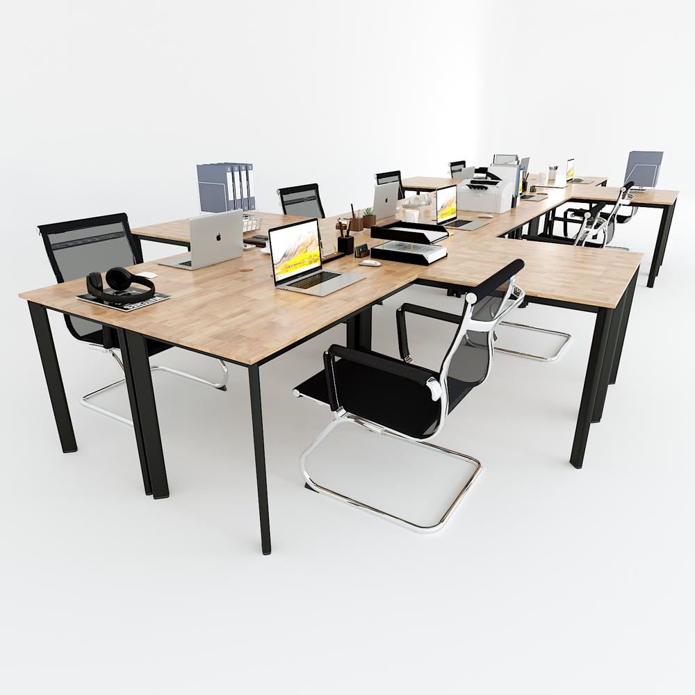 HBOV030 - Bàn cụm 8 góc chữ L nối tiếp hệ Oval Concept điểm khác biệt của hệ bàn nằm ở chất liệu mặt bàn là Gỗ Cao Su ghép tiêu chuẩn AA dày 17mm sơn PU hoàn thiện với 5 màu sắc lựa chọn, gỗ cao su siêu bền không sợ nước bản thân là gỗ tự nhiên chắc chắn sẽ làm bạn hài lòng ngay từ cái nhìn đầu tiên, cụm 8 góc chữ L nối tiếp là tập hợp của 8 bàn góc chữ L kích thước 160x140cm với mặt bàn chính 60x160cm và mặt bàn phụ 80x50cm sắp xếp theo kiểu nôi tiếp và người dùng ngồi đối diện với nhau tao nên hệ dài 6.4m thích hợp cho các không gian văn phòng rộng rãi.