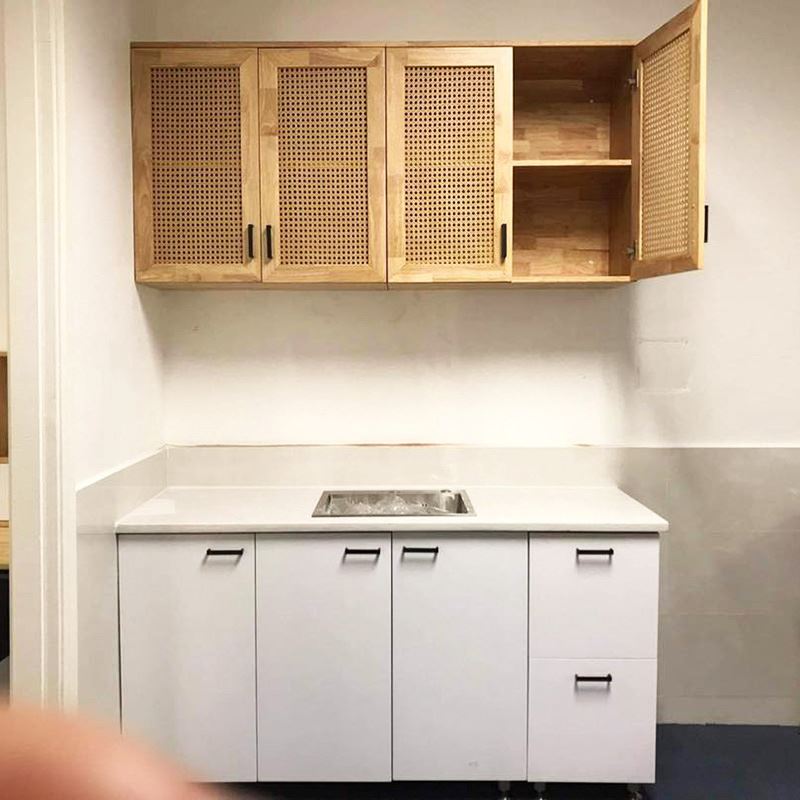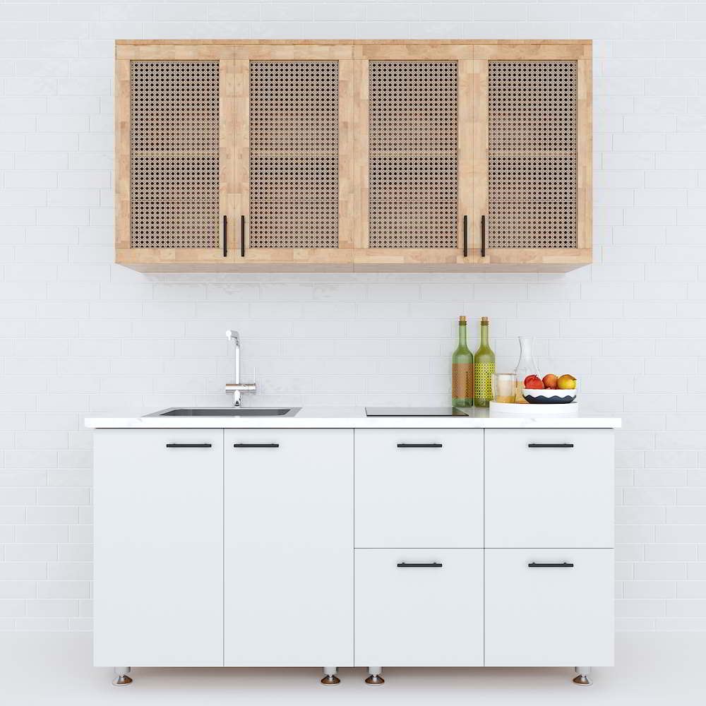 Cửa tủ bếp trên với vật liệu lưới mây mắt cáo mang đến sự mới lạ, độc đáo cho không gian bếp của bạn.