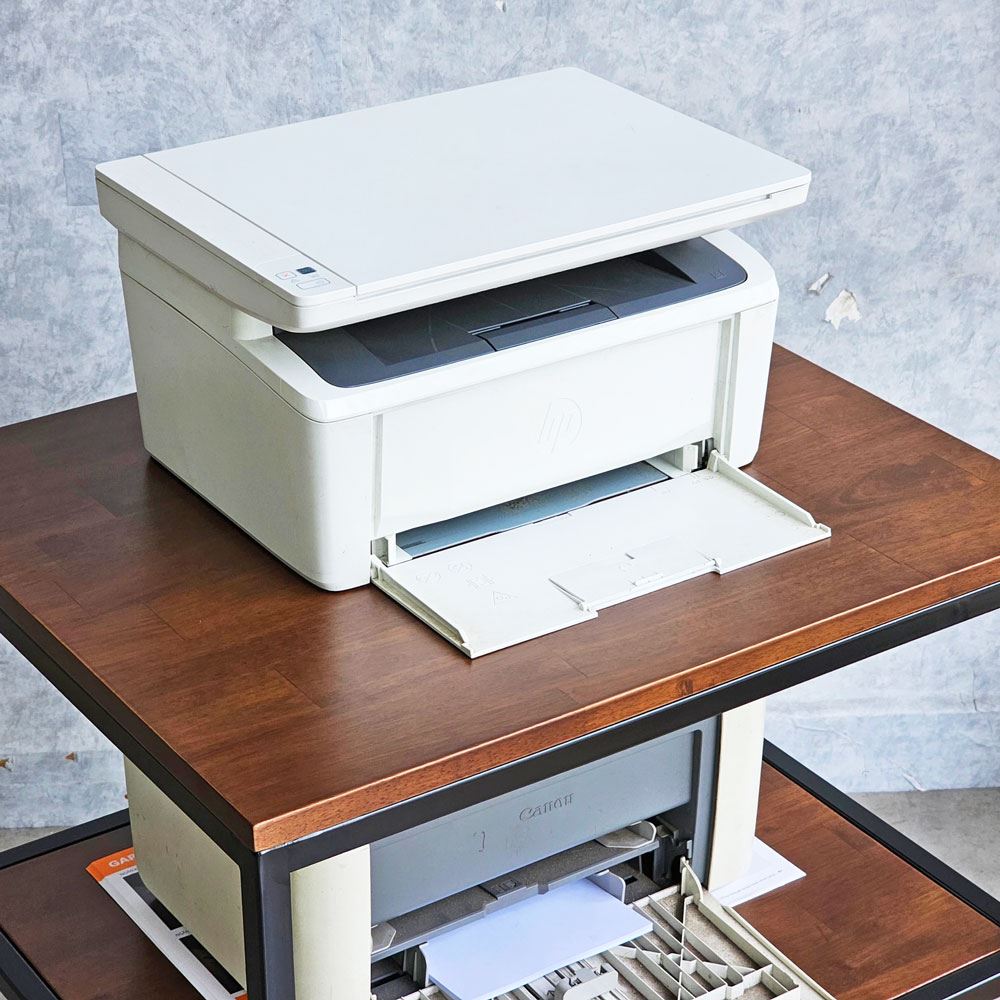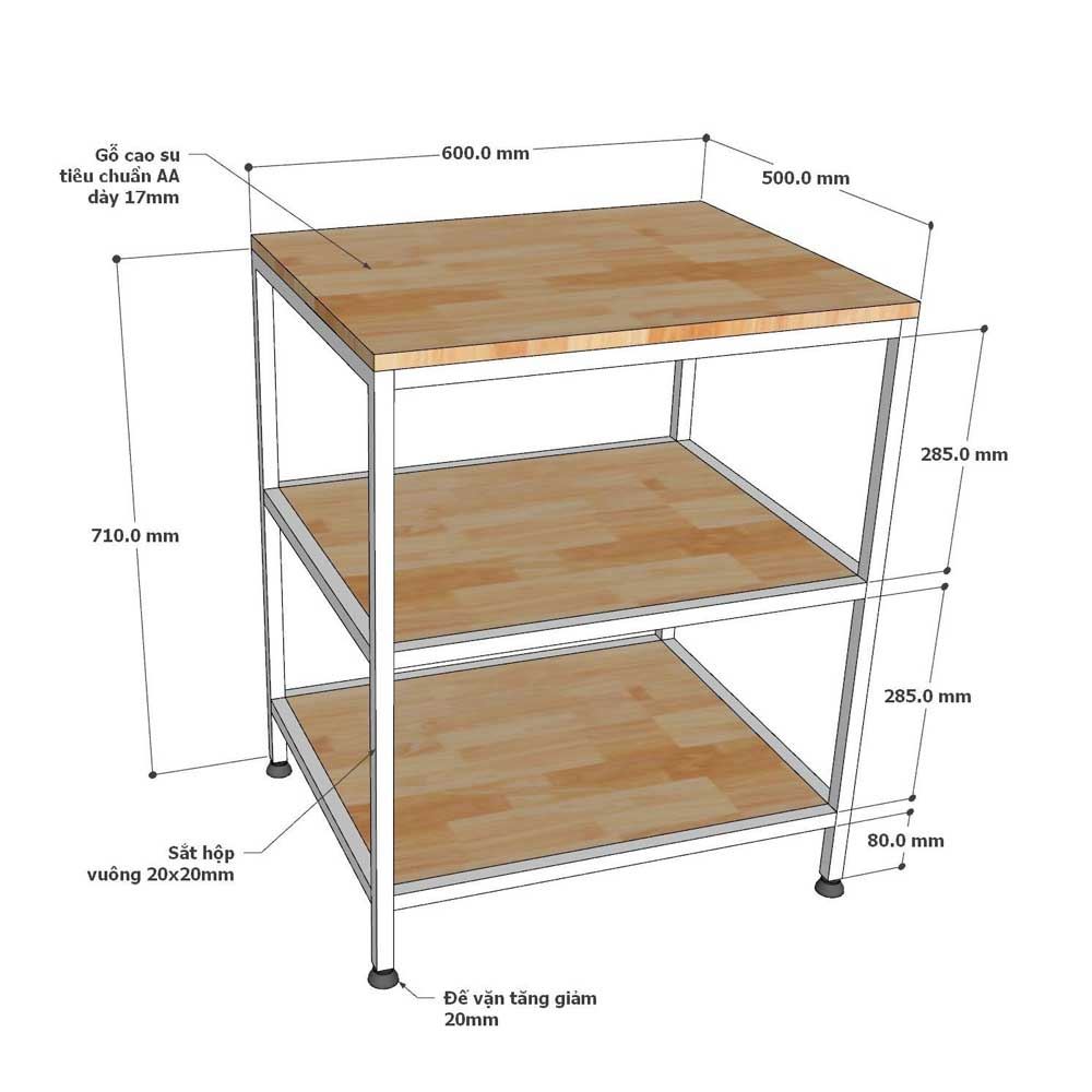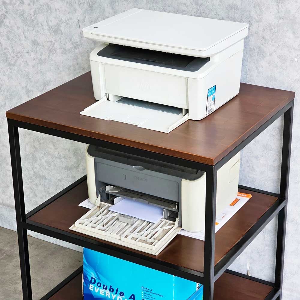 Khung kệ máy in được làm bằng sắt hộp 20x20mm loại dày 1,2 ly chắc chắn, bề mặt phủ sơn tĩnh điện chống gỉ sét và trầy xước. Các tầng kệ được làm bằng gỗ cao su AA, chuẩn xuất khẩu, đã xử lý chà nhám và chống thấm, đảm bảo độ bền và an toàn trong quá trình sử dụng.