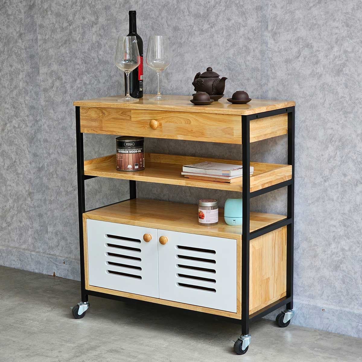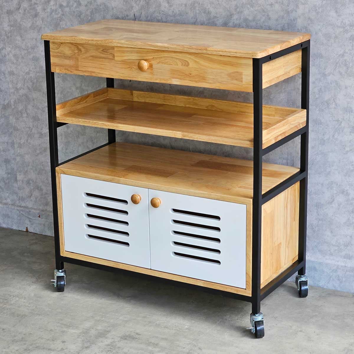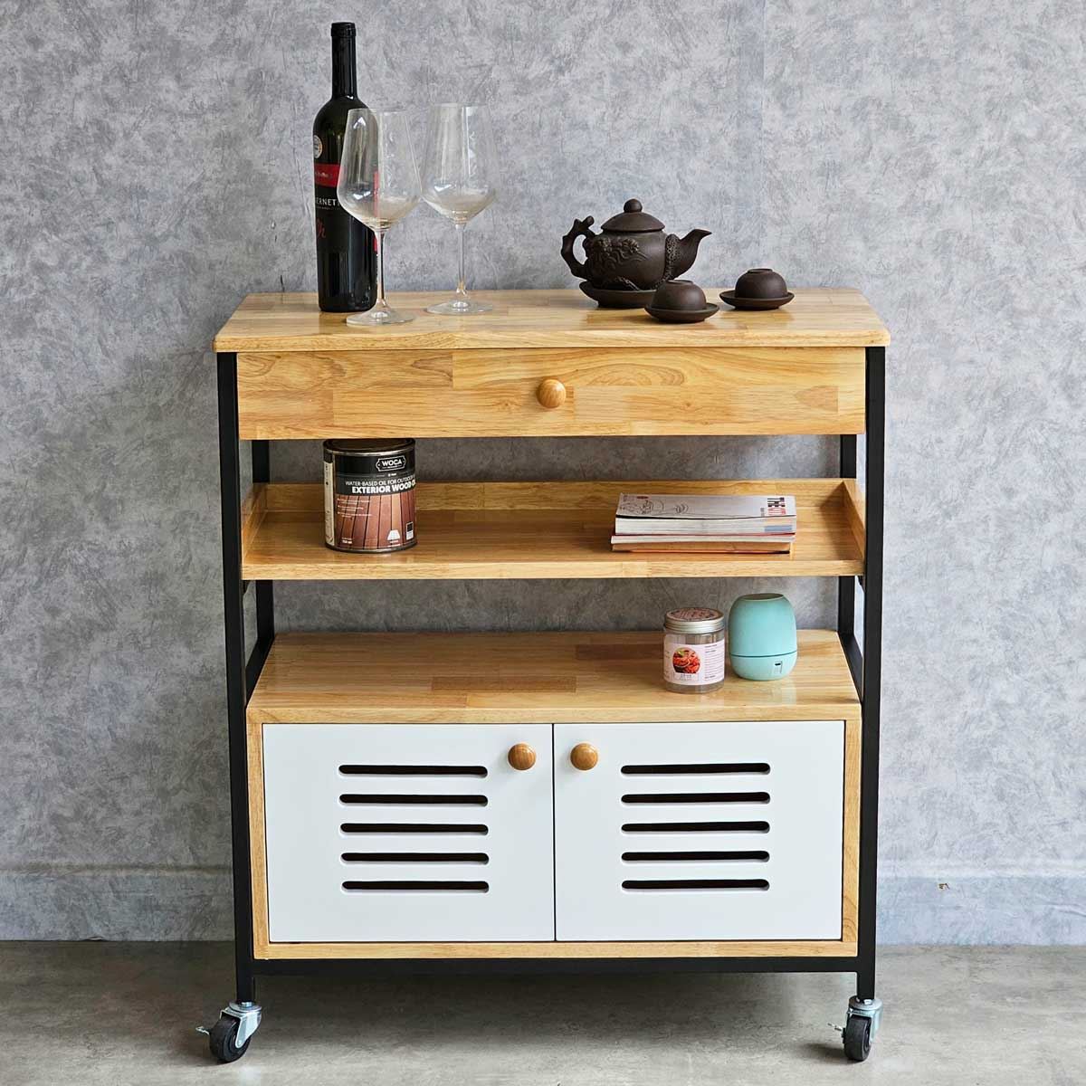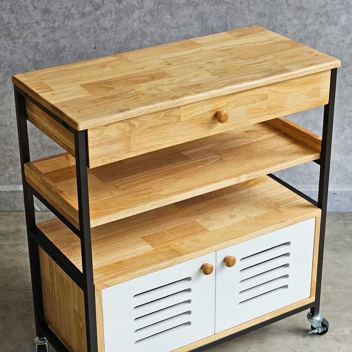 Kệ nhà bếp di động KB68044 sử dụng chất liệu là gỗ cao su tiêu chuẩn AA được xử lý và hoàn thiện chống thấm nước, chống cong vênh đảm bảo độ bền cao, gỗ sơn PU 4 màu sắc khác nhau tuỳ chọn. Chân sắt sơn tĩnh điện chống rỉ sét đảm bảo độ bền cao cũng như tính thẩm mỹ cho sản phẩm. Với kiểu dáng hiện đại, kích thước nhỏ gọn phù hợp với không gian nhà ăn, phòng bếp có diện tích vừa và nhỏ.
