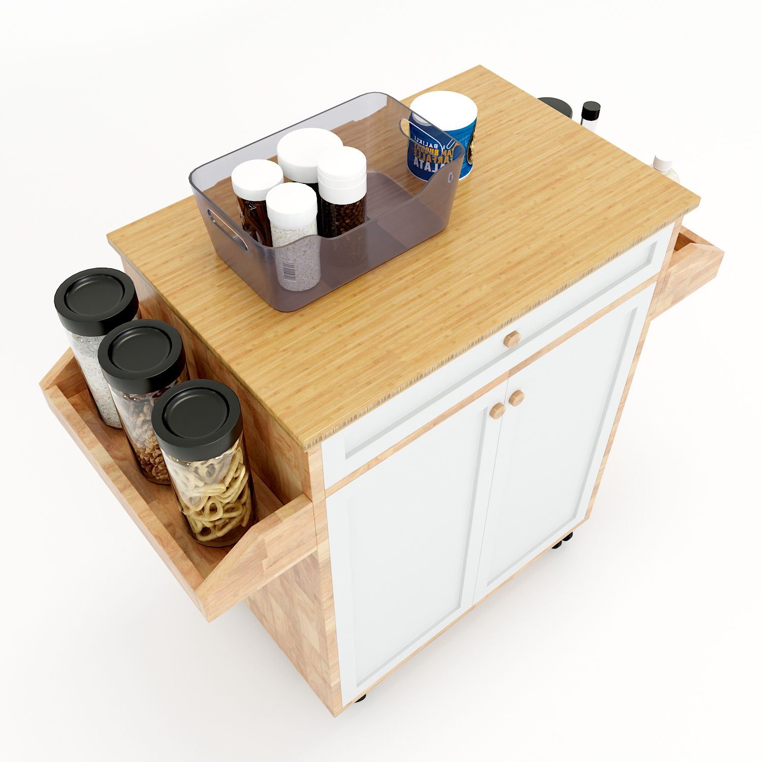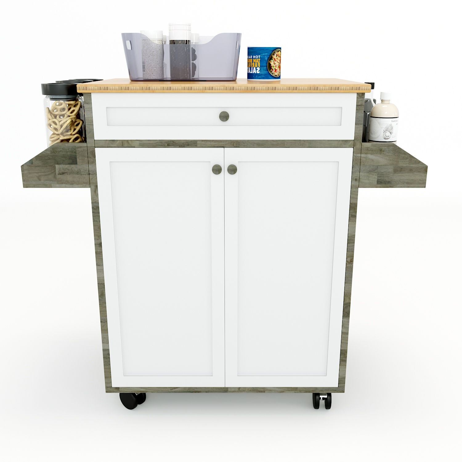 KB68012 - Kệ bếp di động đa năng KONA mặt gỗ tre (90x40x80cm) với thiết kế nhỏ nhắn và hiện đại cùng điểm nhấn mặt trên bằng gỗ tre ép 3 lớp dày 18mm siêu cứng và đẹp mắt kết hợp với gỗ cao su tiêu chuẩn AA dày 17mm sơn Pu hoàn thiện với hai màu chủ đạo kết hợp với hệ hộc kéo và cửa sơn trắng. Kệ bếp di động KONA với hai khay hai bên để gia vị hay các chai lọ rất tiện lợi, hệ với bánh xe chất lượng cao dễ dàng di chuyển với hệ hộc kéo phía trên và tủ phía dưới giúp lưu trữ gọn gàng hơn