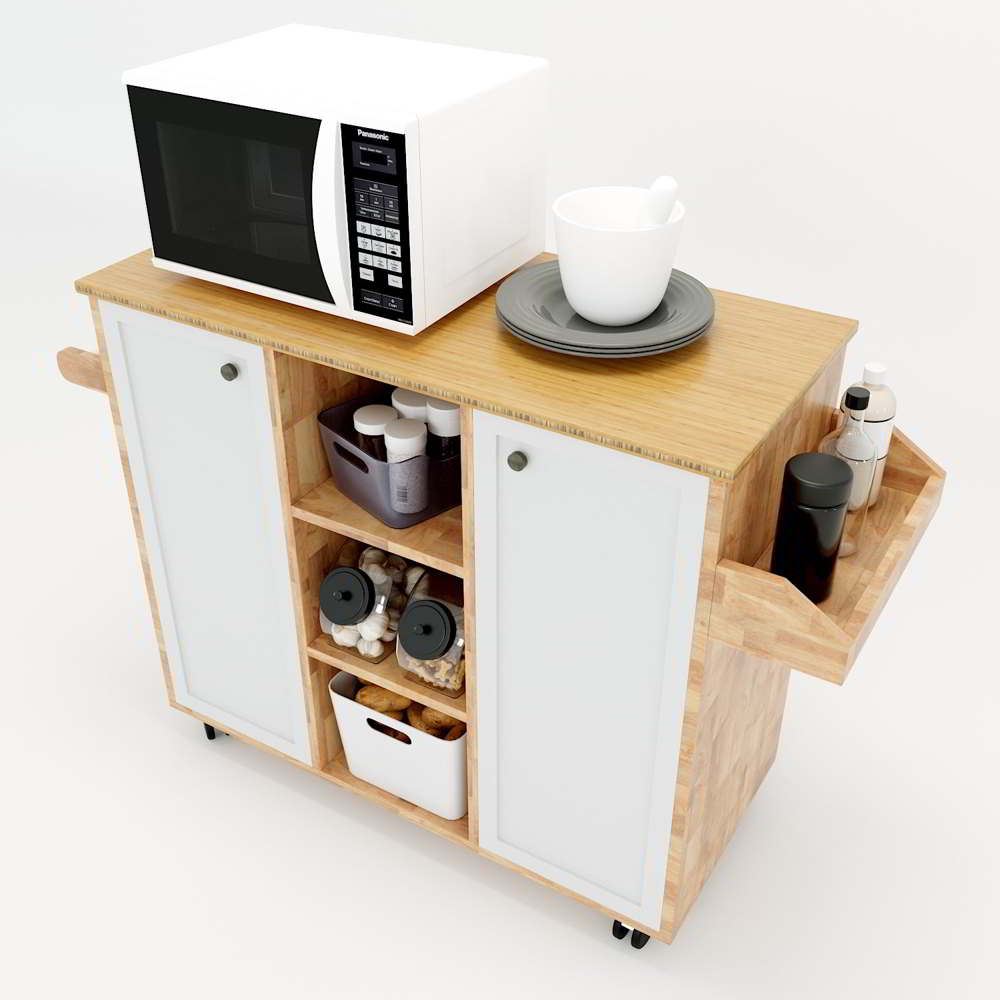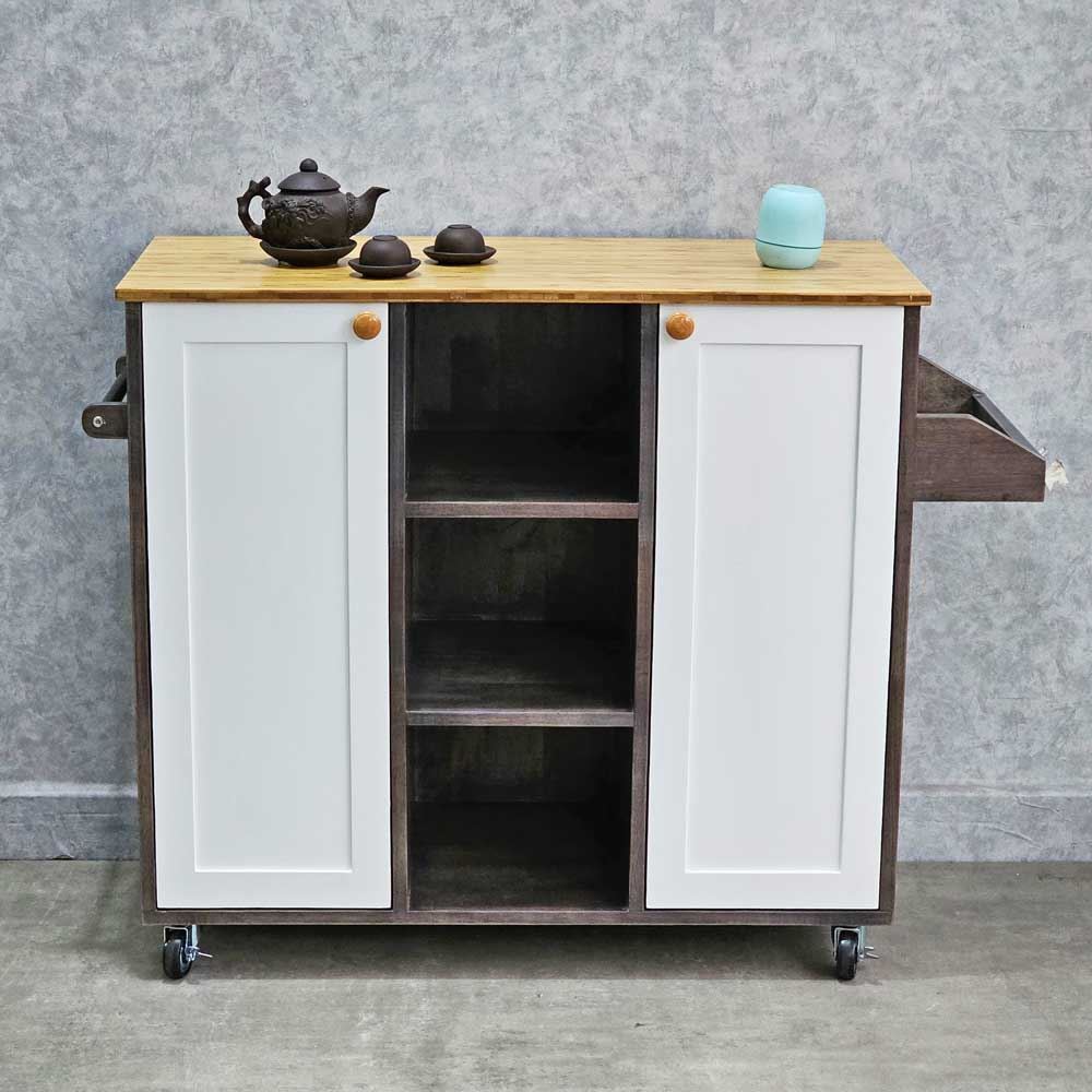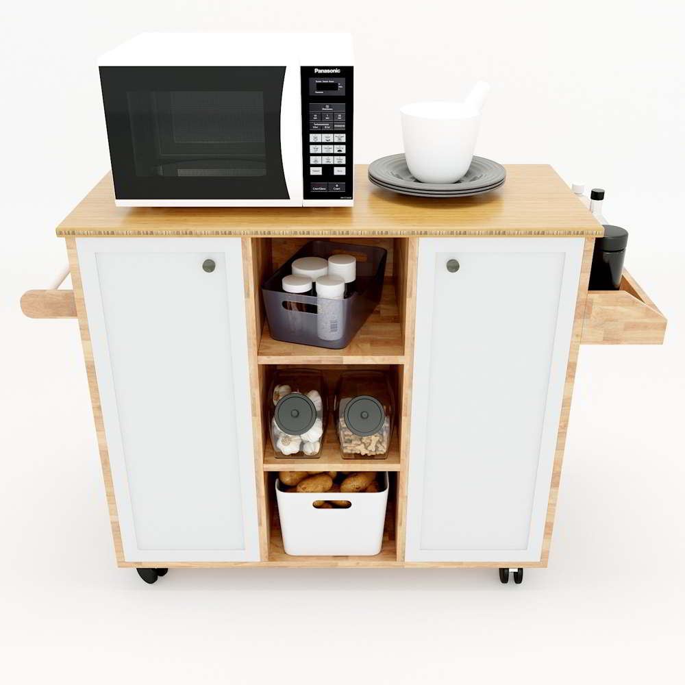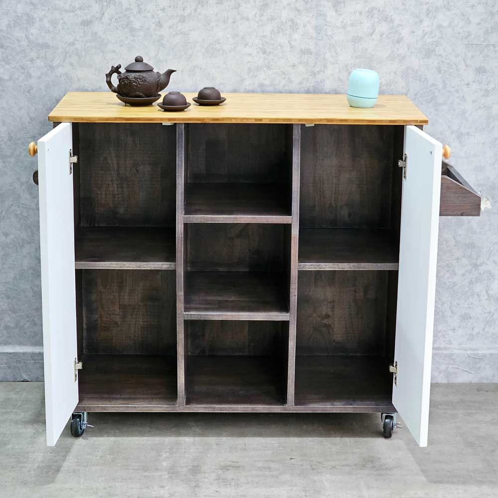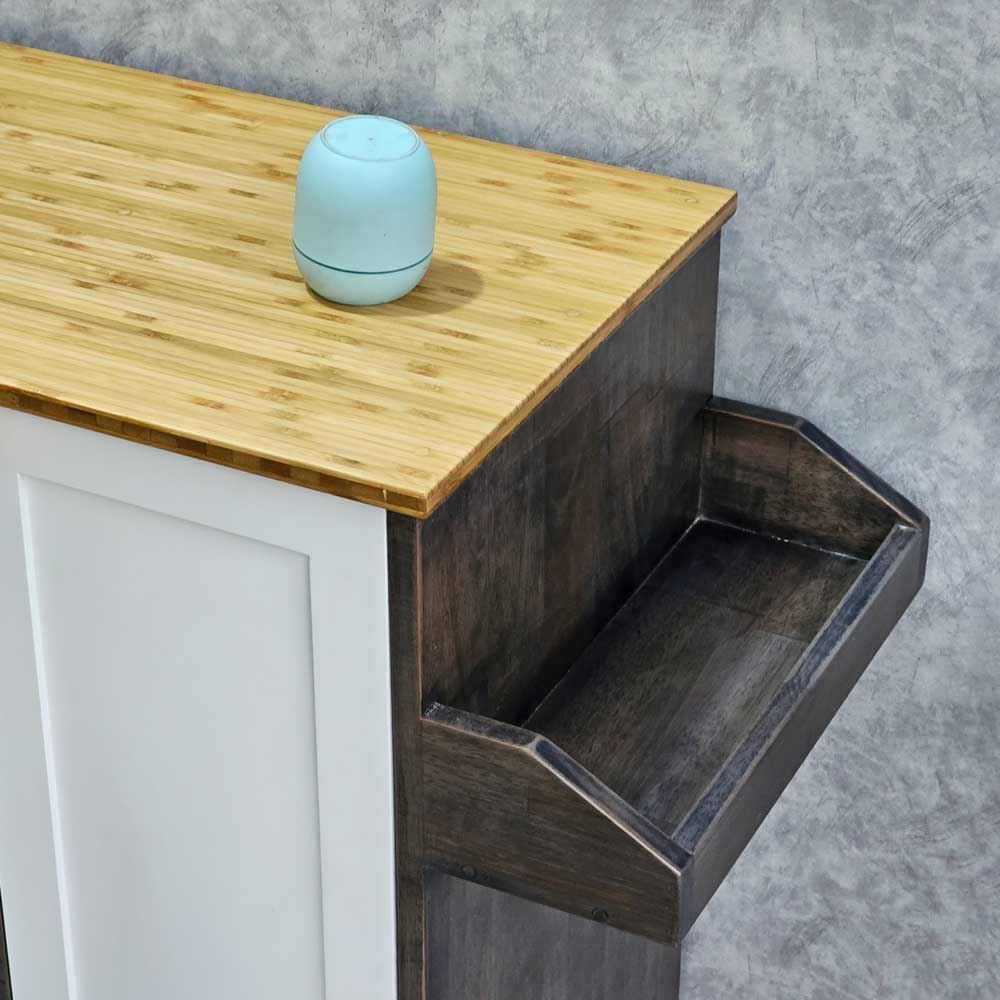 Kệ bếp di động KONA4 mặt gỗ tre (90x40x80cm) KB68019 với thiết kế nhỏ nhắn và hiện đại cùng điểm nhấn mặt trên bằng gỗ tre ép 3 lớp dày 18mm siêu cứng và đẹp mắt kết hợp với gỗ cao su tiêu chuẩn AA dày 17mm sơn Pu hoàn thiện với hai màu chủ đạo kết hợp với hệ hộc kéo và cửa sơn trắng. Kệ bếp di động KONA3 với hai khay hai bên để gia vị hay các chai lọ rất tiện lợi, hệ với bánh xe chất lượng cao dễ dàng di chuyển với hệ hộc kéo phía trên và tủ phía dưới giúp lưu trữ gọn gàng hơn.