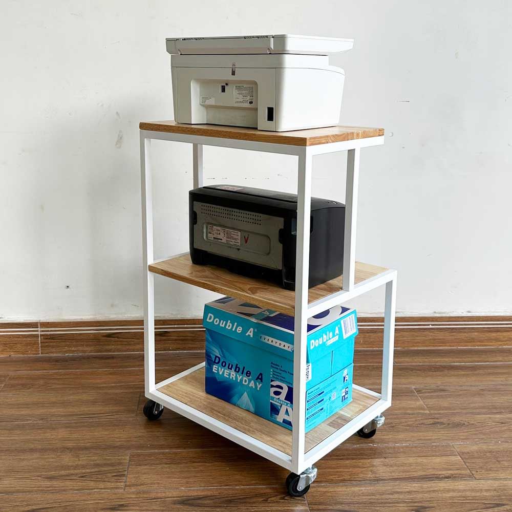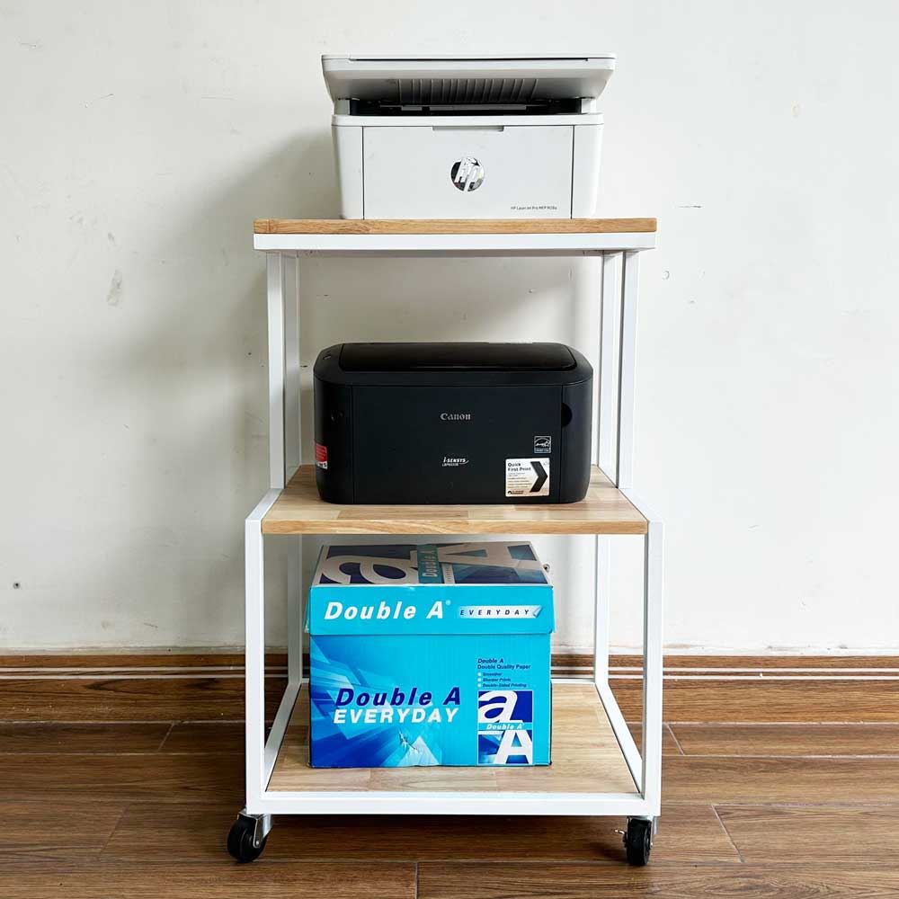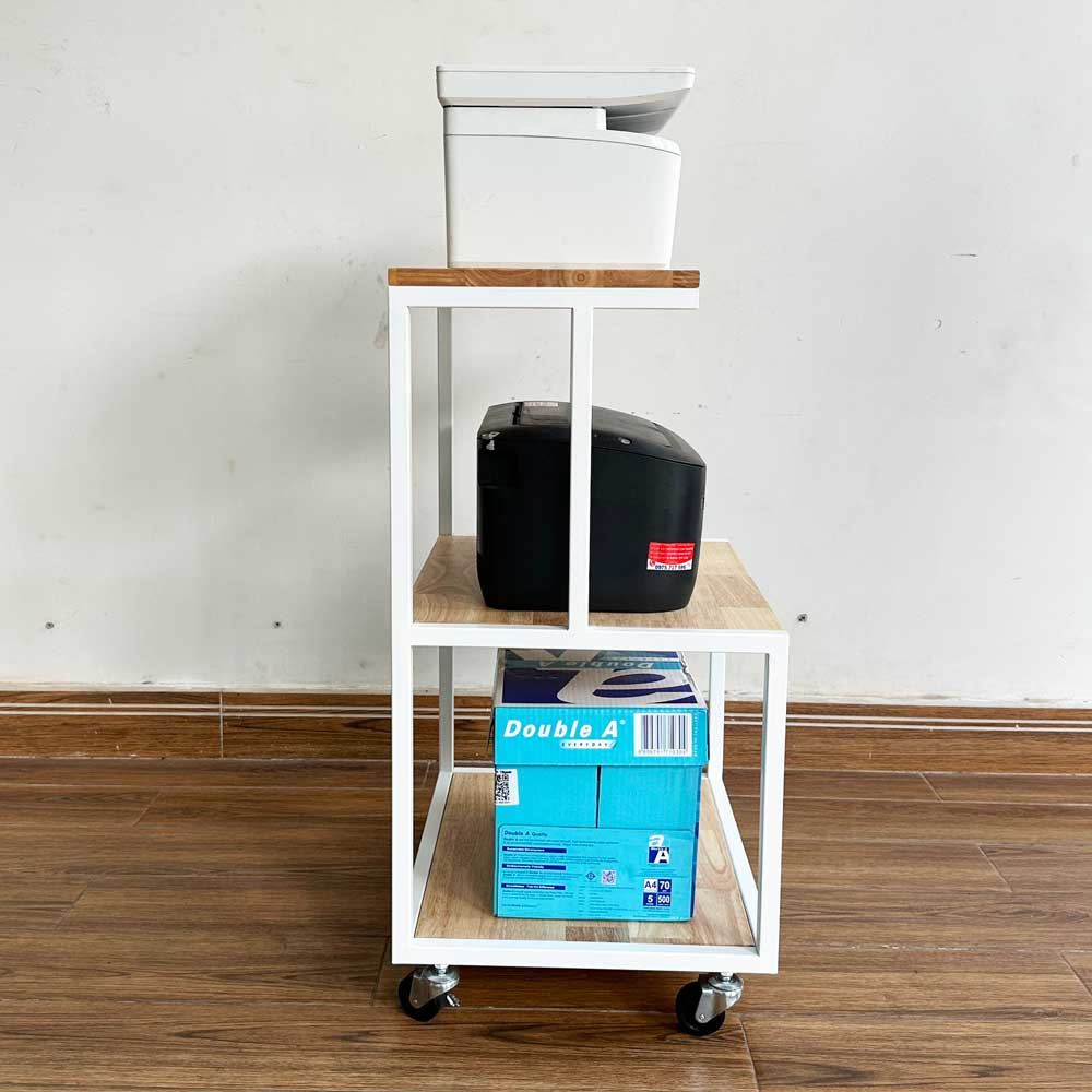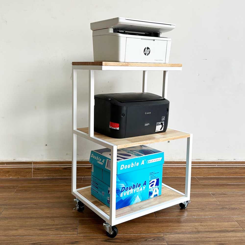 Kệ để máy in gỗ tự nhiên khung sắt KCPU68011 là sản phẩm thuộc dòng kệ hỗ trợ quá trình làm việc thuận lợi hơn với thiết kế nhỏ gọn, 3 tầng để được máy in, máy fax và 1 tầng để đồ tiện lợi. Chất liệu chính là gỗ cao su dày 17mm sơn PU hoàn thiện chống thấm nước, chống cong vênh đảm bảo độ bền cao kết hợp khung sắt sơn tĩnh điện chắc chắn.
