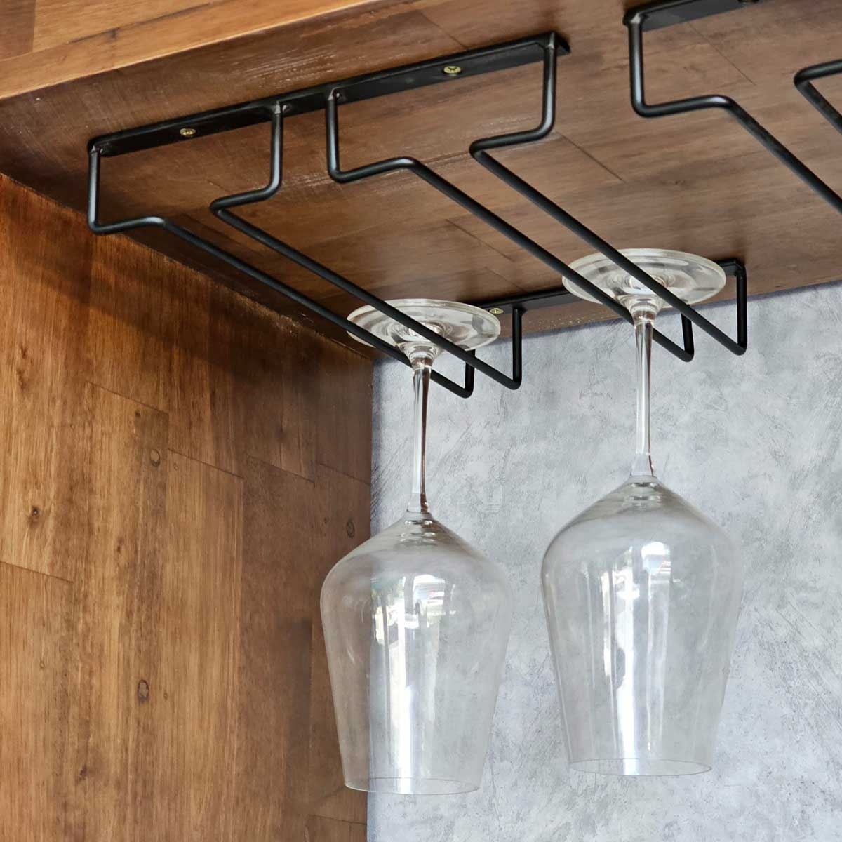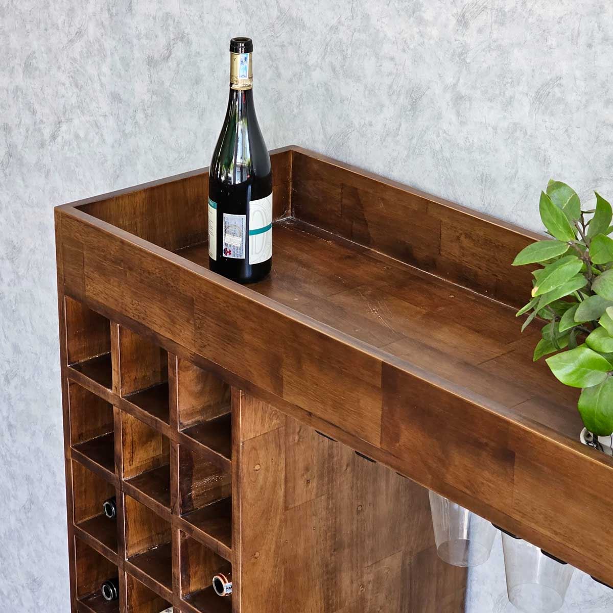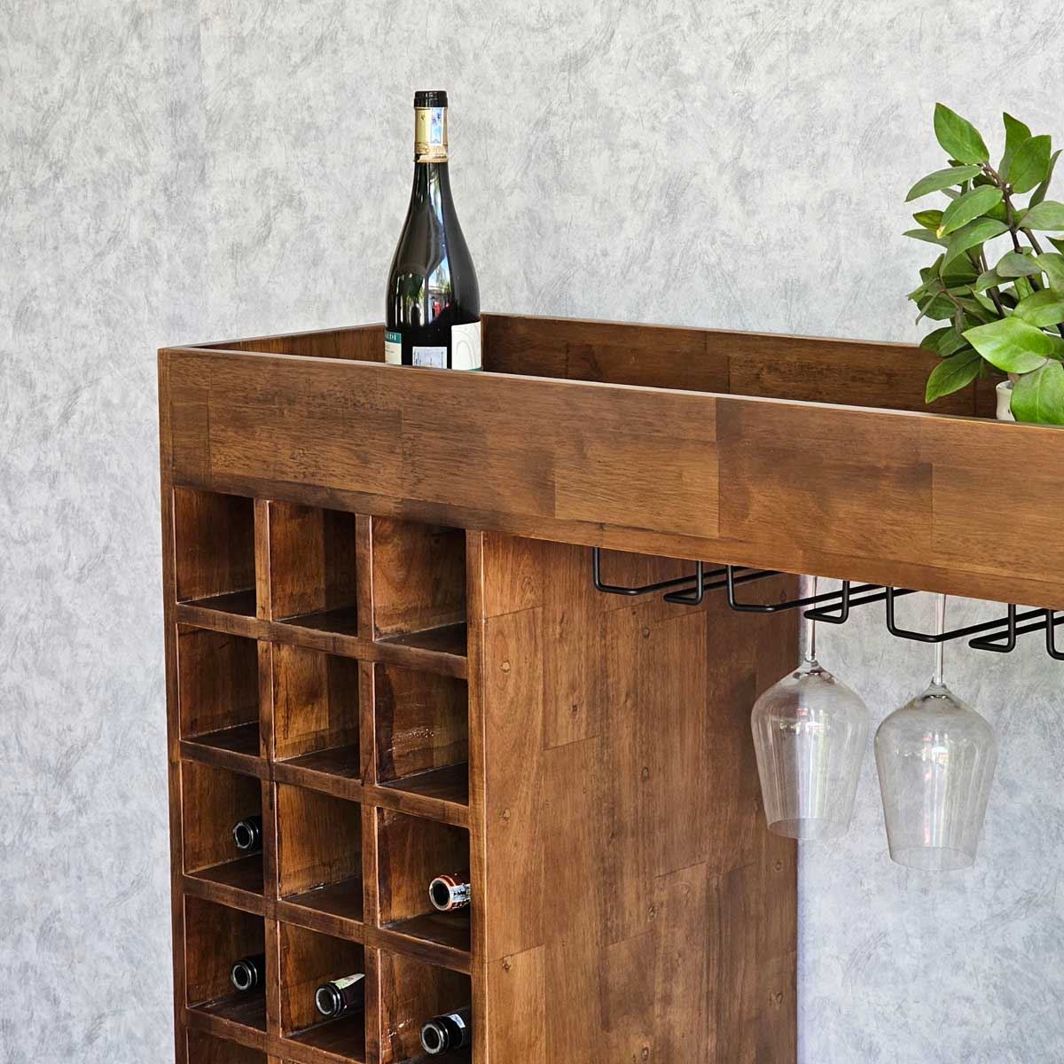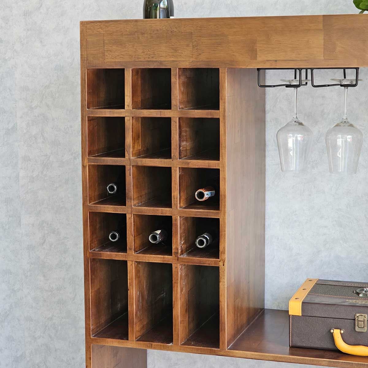 Kệ có ngăn rượu rộng rãi, một ngăn treo ly hiện đại và tầng để chum rượu bên dưới
