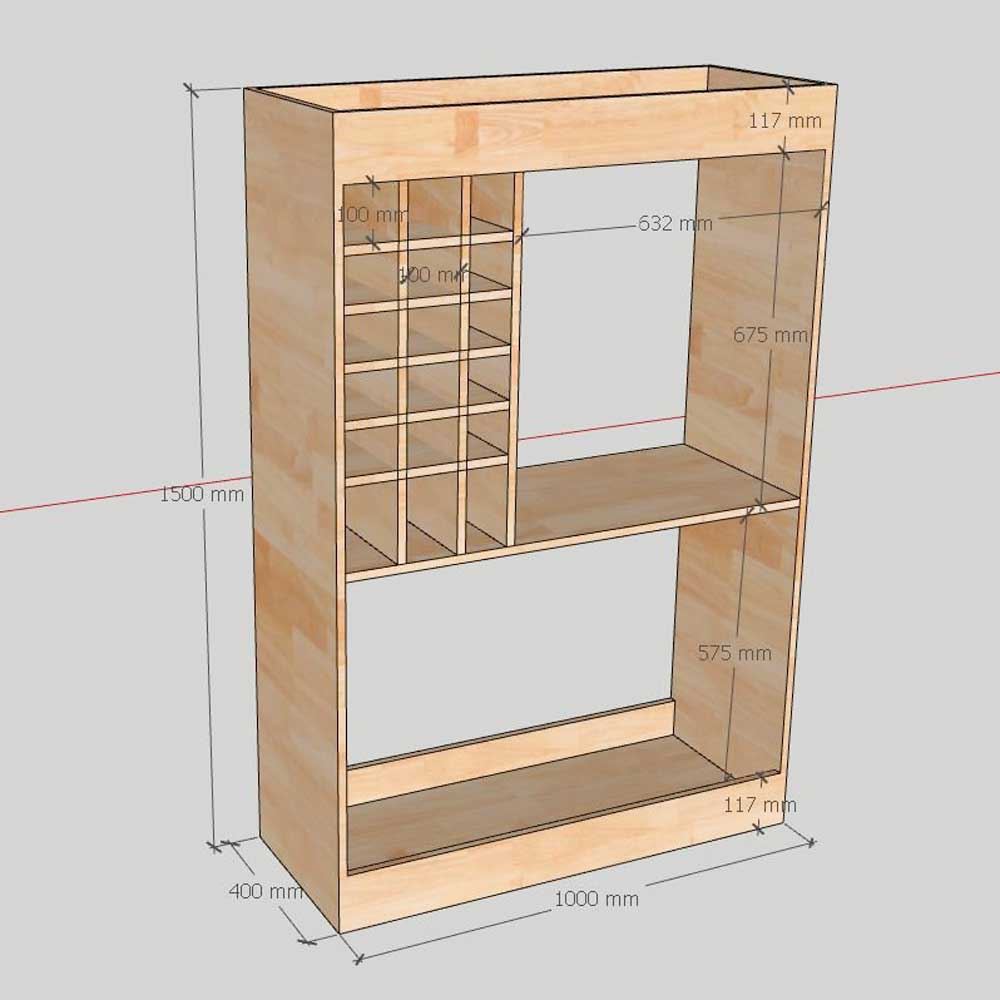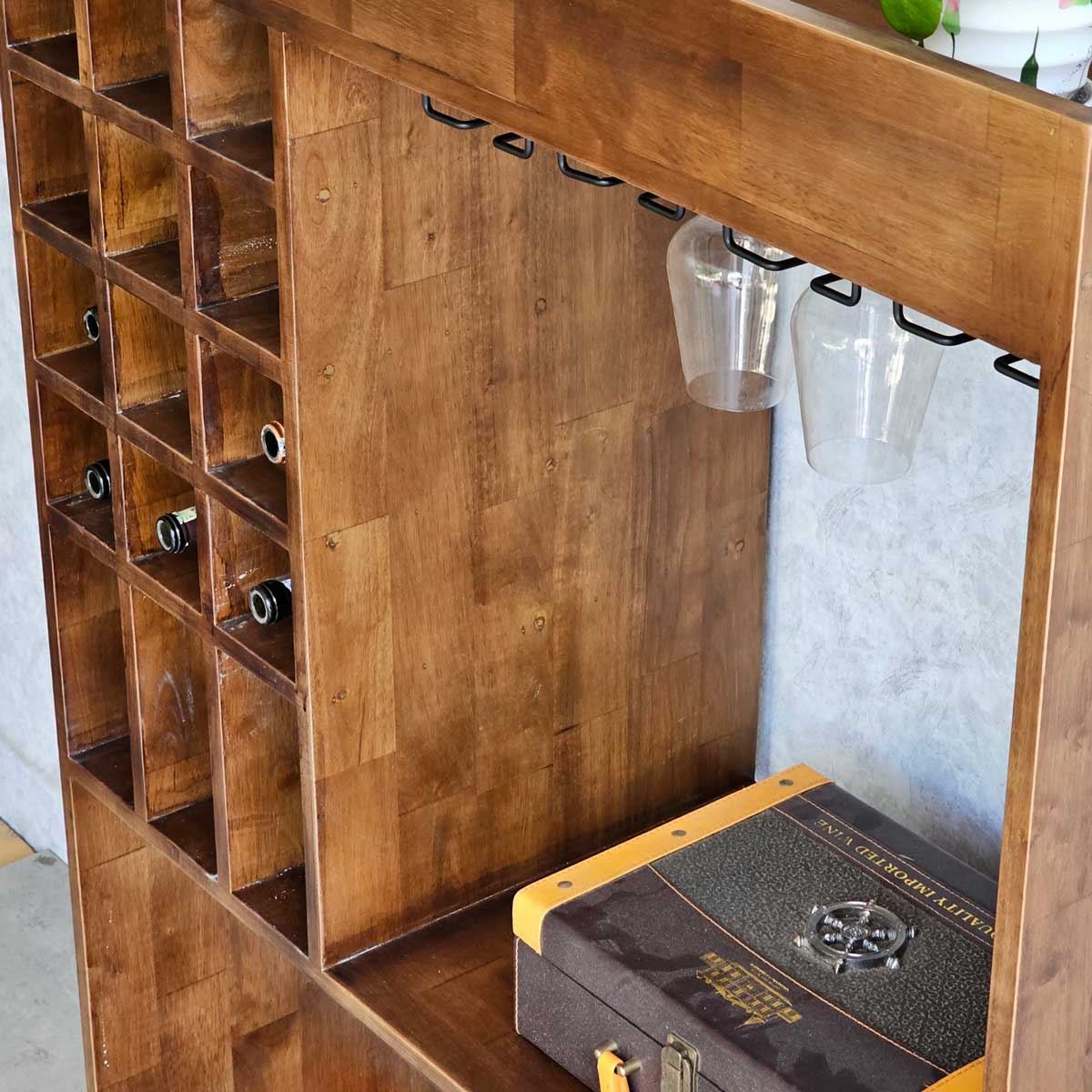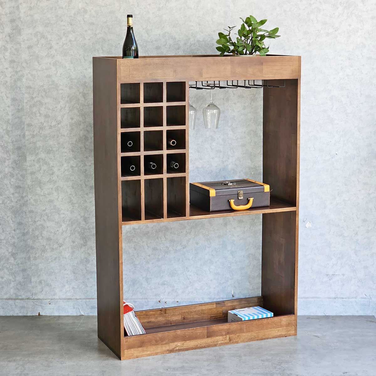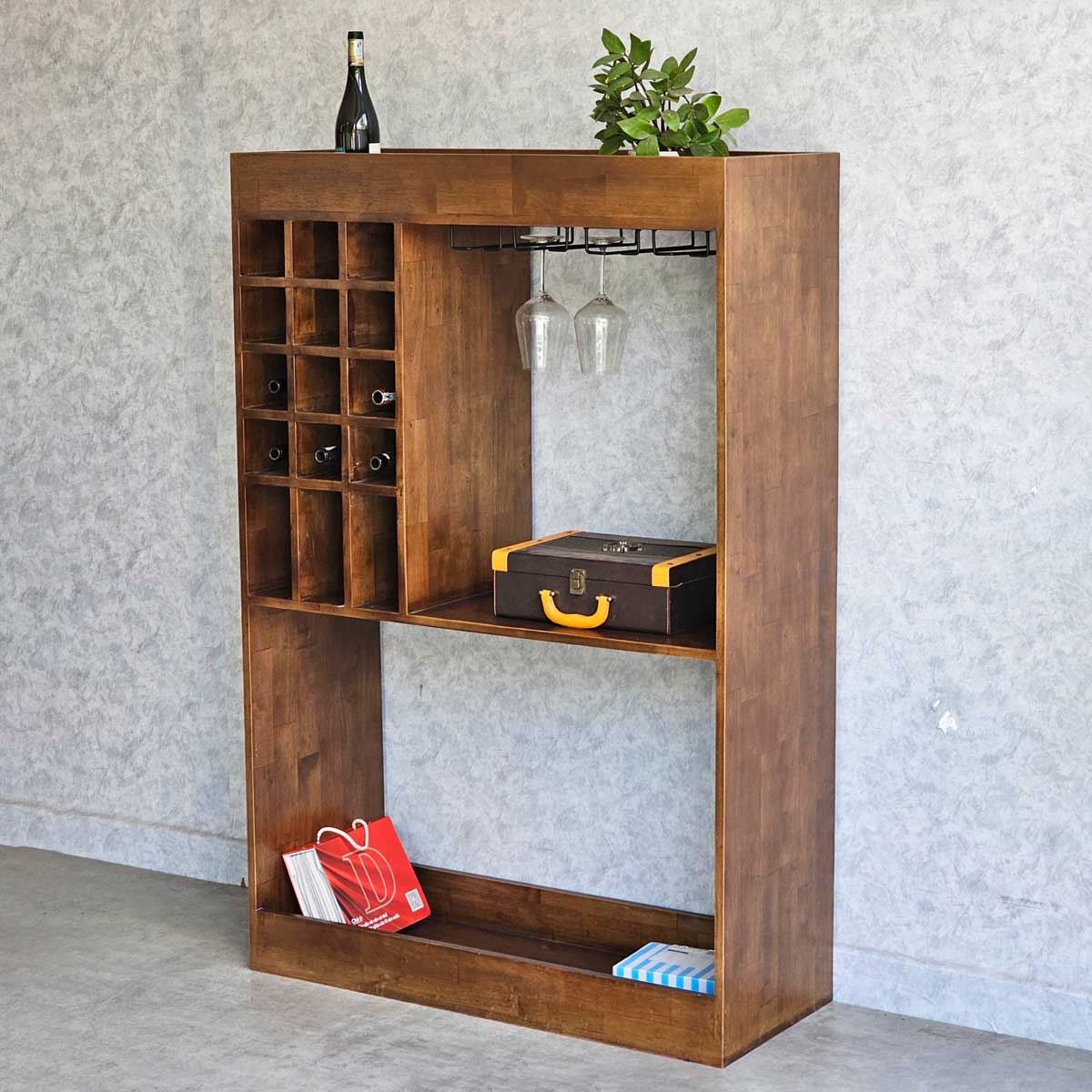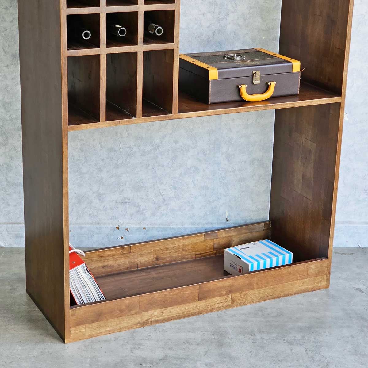 Kệ được chia thành nhiều ngăn chức năng với kích thước linh hoạt, giúp bạn dễ dàng sắp xếp và trưng bày các loại rượu vang, ly tách, đồ trang trí một cách khoa học và gọn gàng. Tầng trên cùng thích hợp để đặt những chai rượu vang mini, đồ trang trí hoặc các vật dụng nhỏ. Ngăn giữa được thiết kế để lưu trữ các chai rượu vang cỡ lớn. Tầng dưới cùng rộng rãi, đáp ứng nhu cầu cất giữ những chum rượu lớn hoặc các vật dụng có kích thước cồng kềnh.