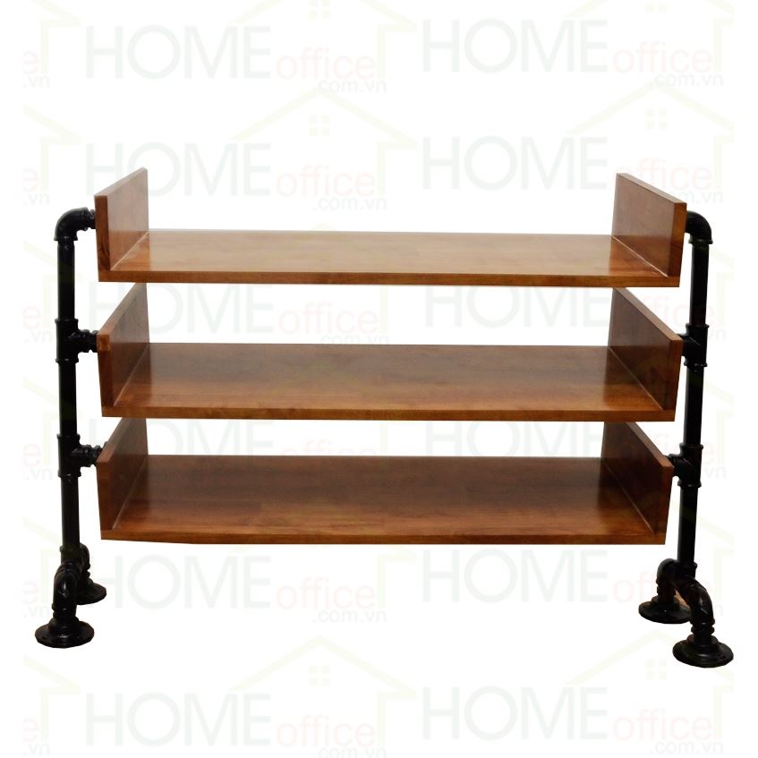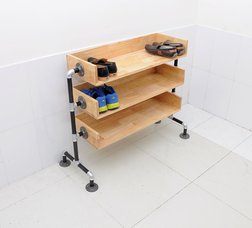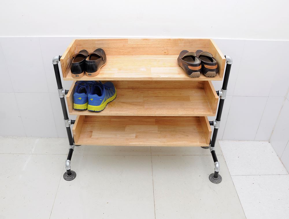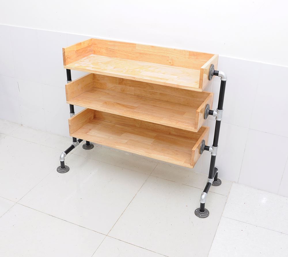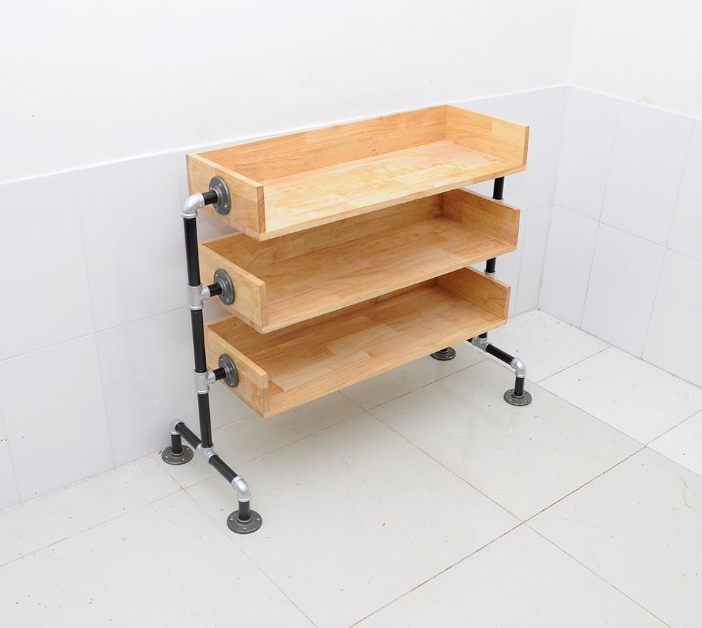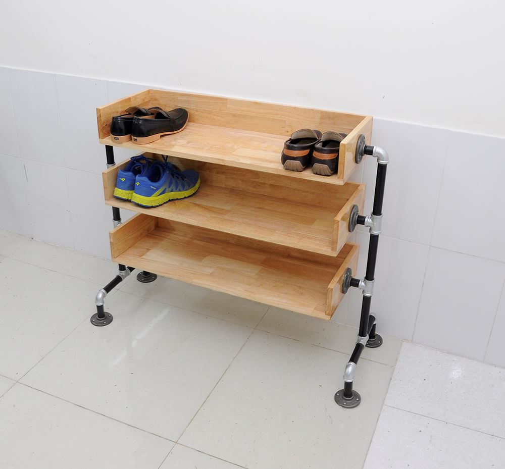Kệ giày bằng ống nước KG68001 được làm bằng gỗ cao su tự nhiên đã được xử lý chống cong vênh, chống mối mọt, bên ngoài được bảo vệ bởi một lớp PU chống thấm và phủ 2K chống trầy xước đảm bảo độ bền cho sản phẩm. Khung kệ làm bằng ống nước phi 27 sơn tĩnh điện được nối với nhau bằng co rất chắc chắn, đế kệ được gắn các mặt bích làm bằng gang trông rất có thẩm mỹ. Kích thước kệ giày bằng ống nước rộng 80cm sâu 30cm, cao 80cm và được chia thành 3 tầng.