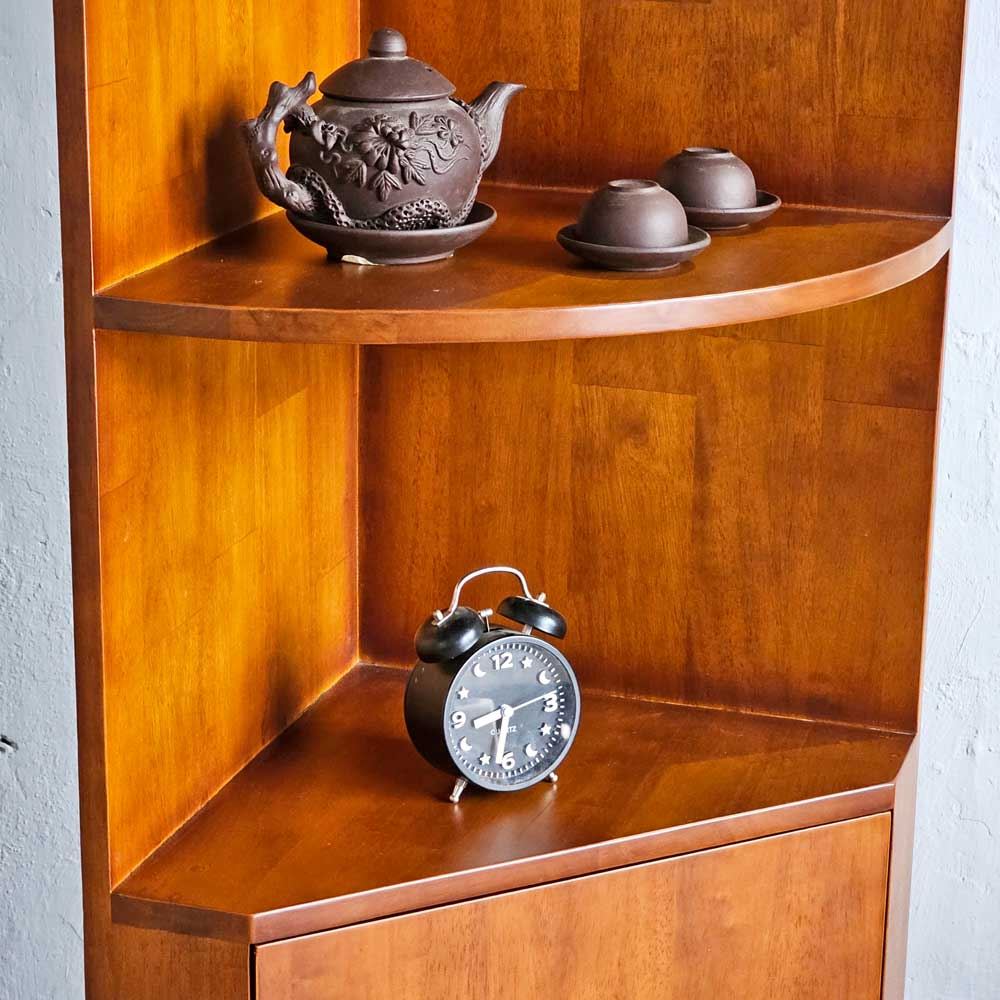 Kệ góc tường được làm từ gỗ cao su AA chuẩn xuất khẩu, đã qua xử lý chà nhám mịn màng và phủ lớp chống thấm nước giúp mang lại độ bền bỉ cao. Chất liệu gỗ cao su tự nhiên có độ bền cao, khả năng chịu lực tốt, đồng thời mang đến vẻ đẹp mộc mạc, ấm áp cho không gian nội thất.