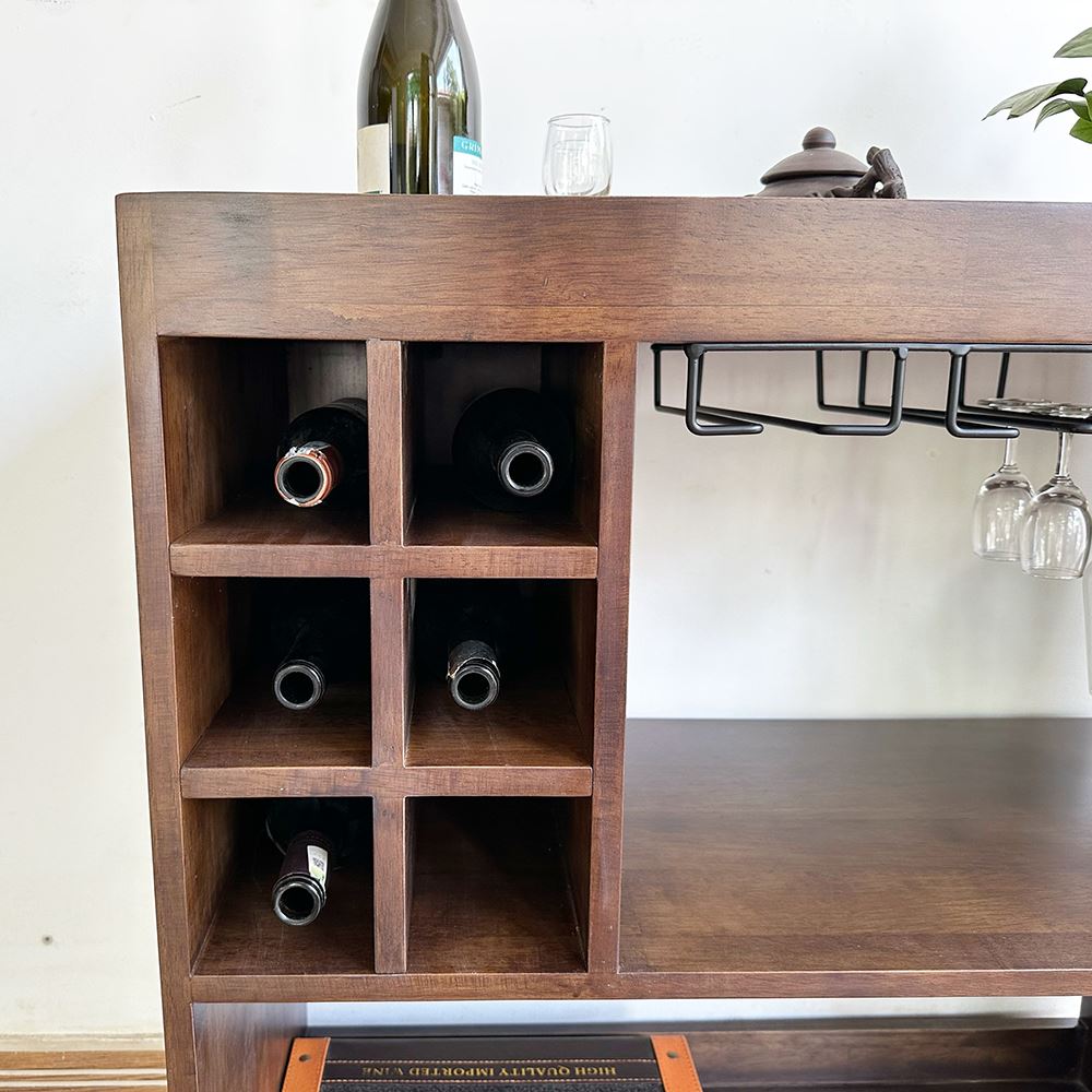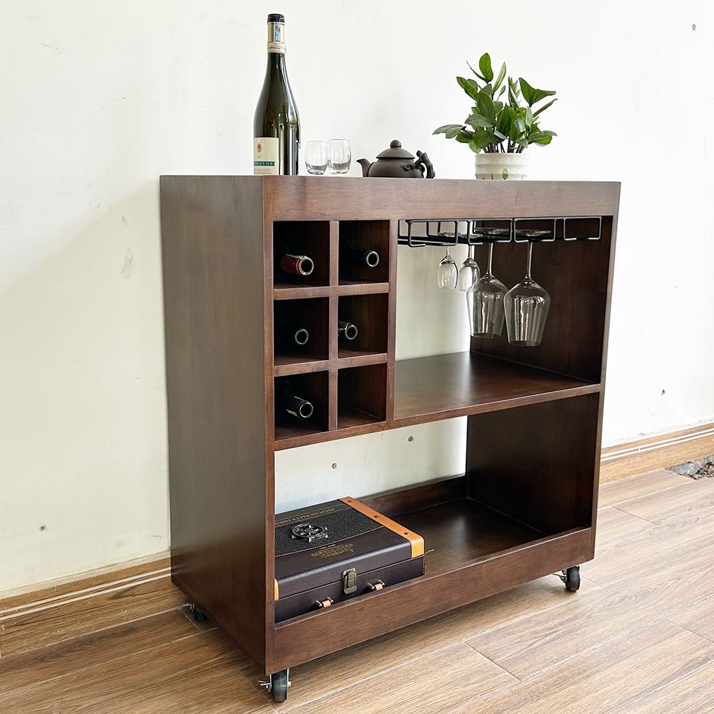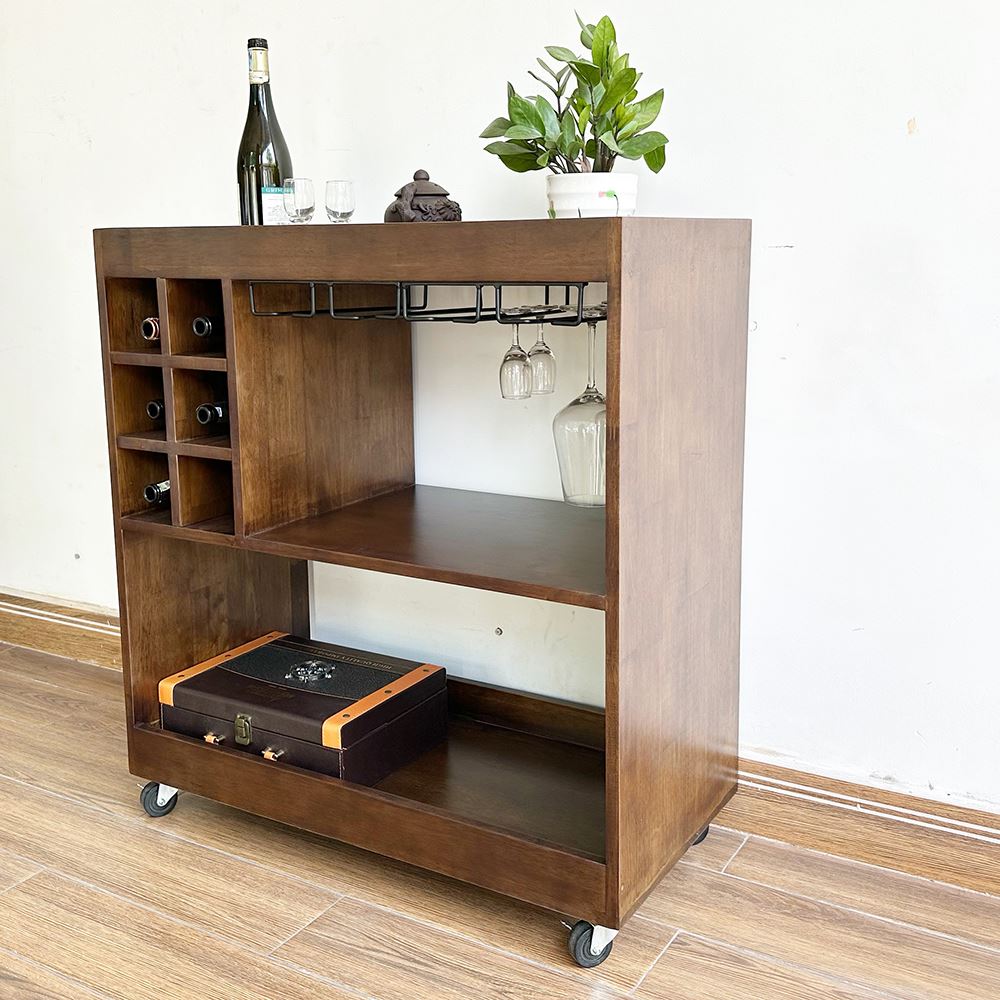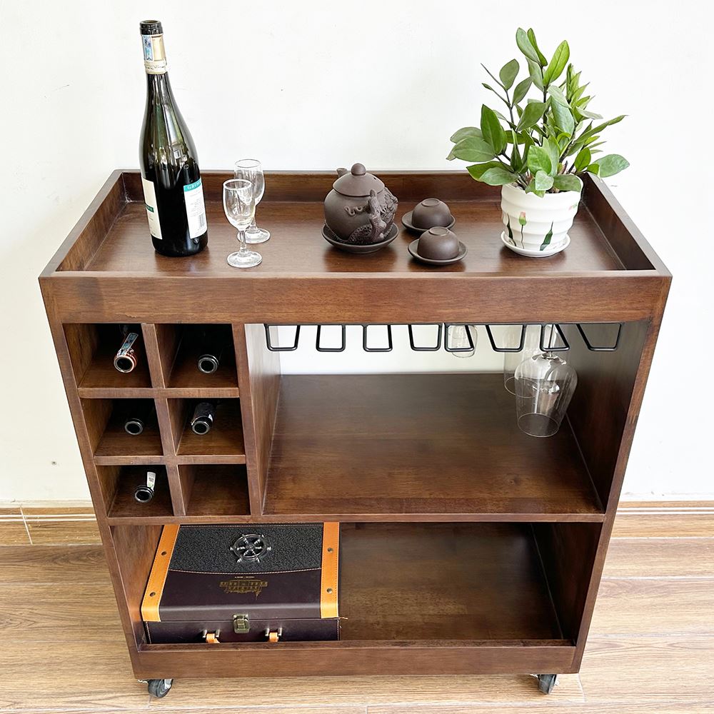 Kệ Rượu di động gỗ tự nhiên KR68001 với thiết kế đơn giản và kích thước vừa vặn phù hợp với mọi không gian trong phòng khách hay nhà bếp, có thể để sát bên bàn ăn rất tiện lợi, bán xe tải trọng cao di chuyển nhẹ hàng. Mẫu kệ có các khay để rựu vang và các tầng treo ly, tầng để đồ ăn rất tiện lợi. Với chất liệu Gỗ cao Su tiêu chuẩn AA sơn Pu hoàn thiện rất đẹp mắt và thân thiện. Gỗ cao su có thể sơn nhiều màu sắc khác nhau để phù hợp với không gian.
