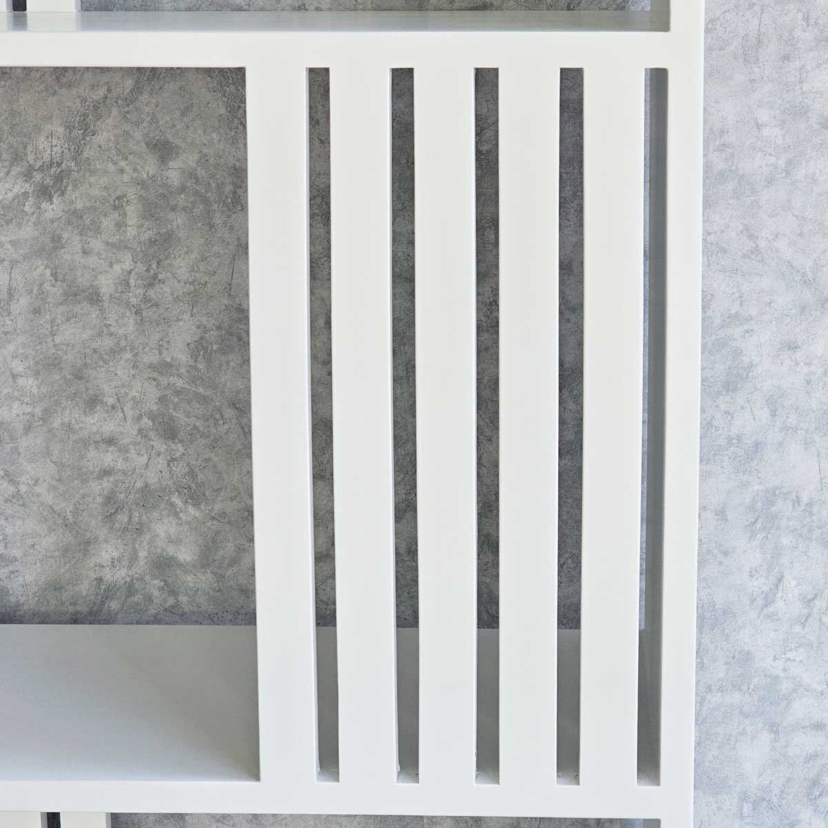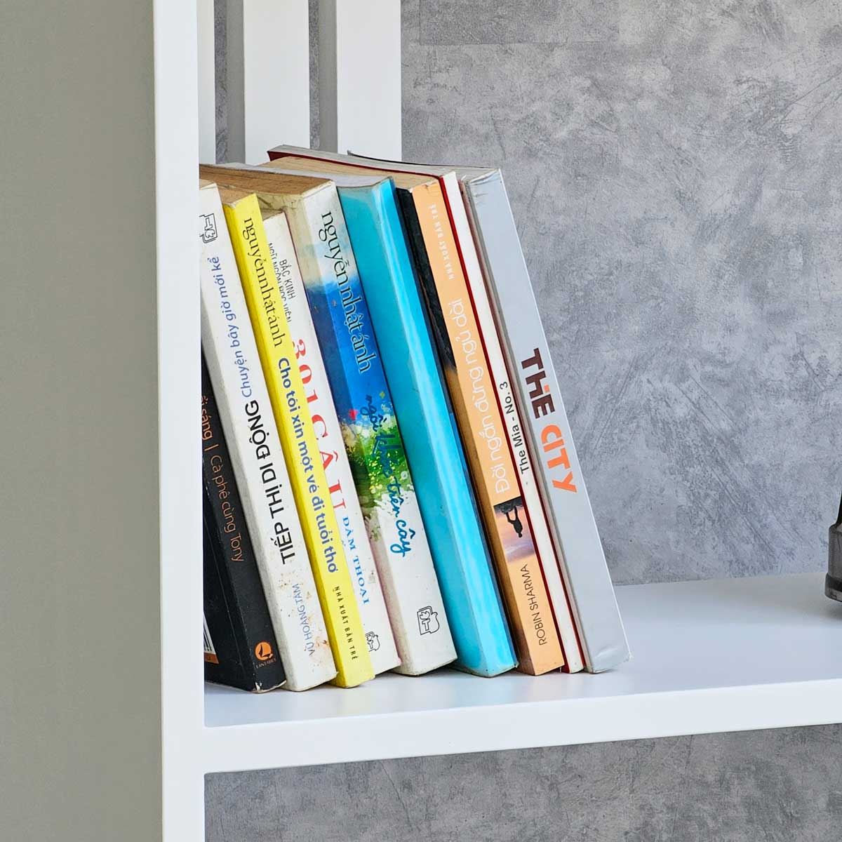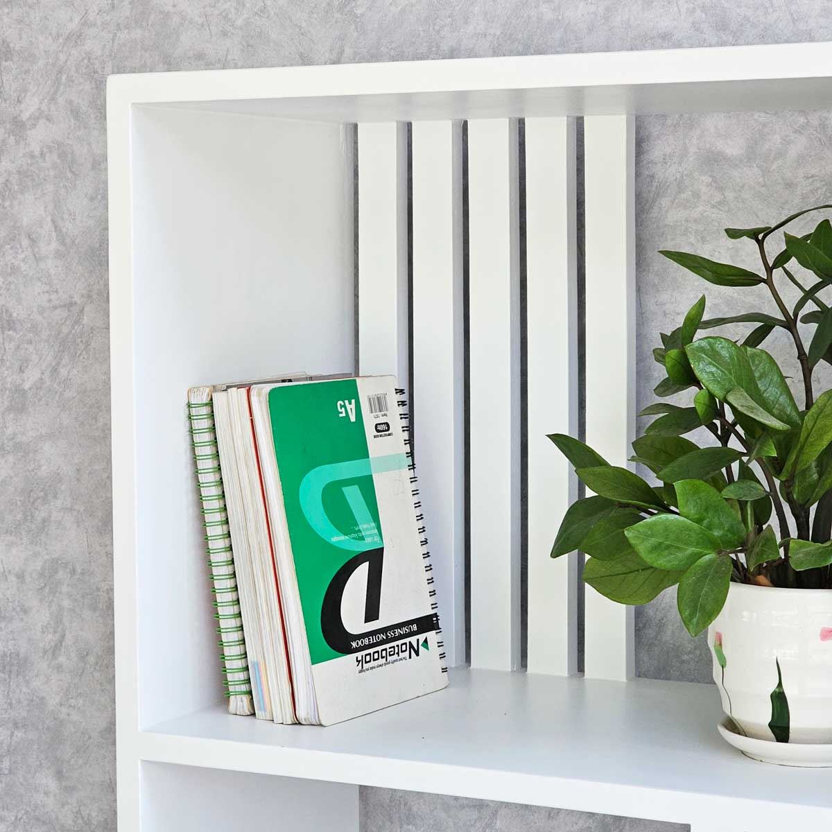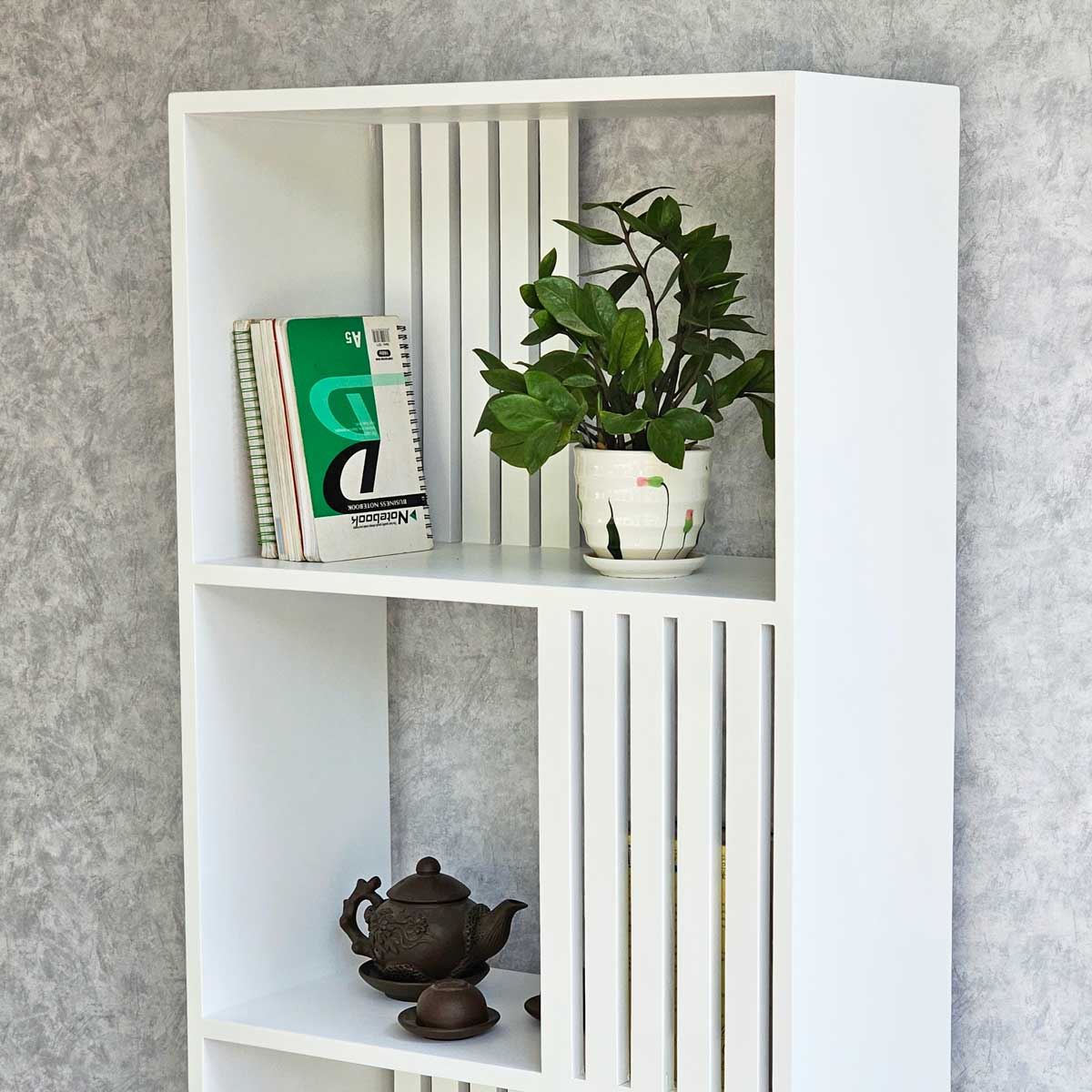 Mặt sau của kệ sách được làm từ các thanh gỗ dọc, tạo ra một phong cách hiện đại và độc đáo. Điều này không chỉ làm cho kệ sách trở nên hấp dẫn từ phía trước mà còn tạo ra một góc nhìn thú vị từ phía sau.