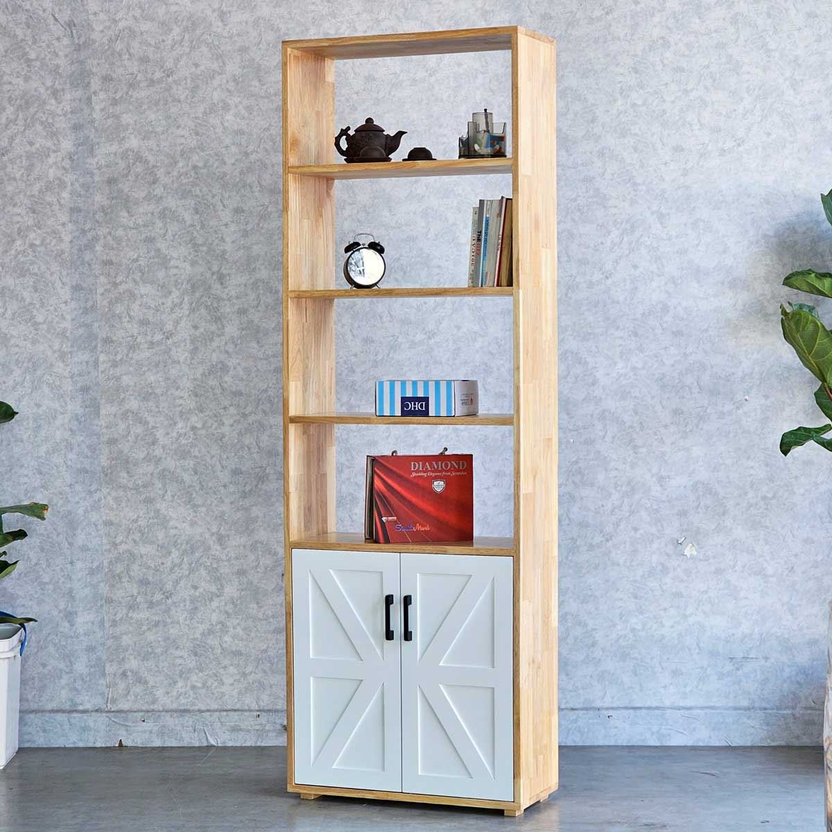 Điểm nhấn độc đáo của kệ sách chính là phần cửa tủ được ốp gỗ tạo hiệu ứng trang trí ấn tượng, góp phần tô điểm thêm nét đẹp cho căn phòng. Hệ tầng kệ mở bên trên giúp bạn dễ dàng lấy sách và trưng bày đồ trang trí yêu thích. Chắc chắn, mẫu kệ này sẽ mang đến sự hài hòa và sang trọng cho không gian phòng khách, phòng làm việc hay phòng ngủ của bạn.