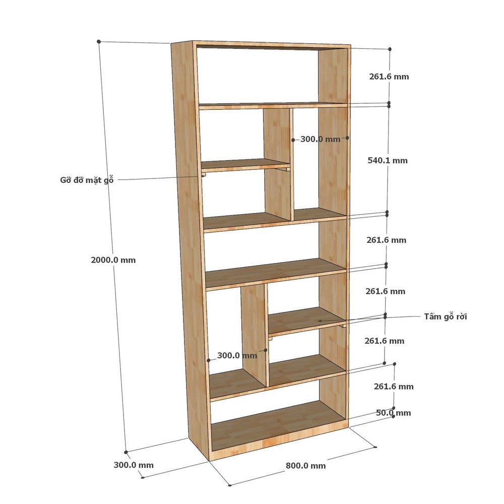Kệ sách có 7 tầng kệ được sắp xếp đều đặn và lệch tầng, tạo nên sự độc đáo và thu hút. Các tầng kệ có kích thước phù hợp để chứa sách, tạp chí, đồ trang trí và các vật dụng khác. Kệ sách cũng có 2 tầng kệ rời có thể tháo lắp dễ dàng, giúp bạn linh hoạt sắp xếp đồ đạc theo nhu cầu sử dụng.
