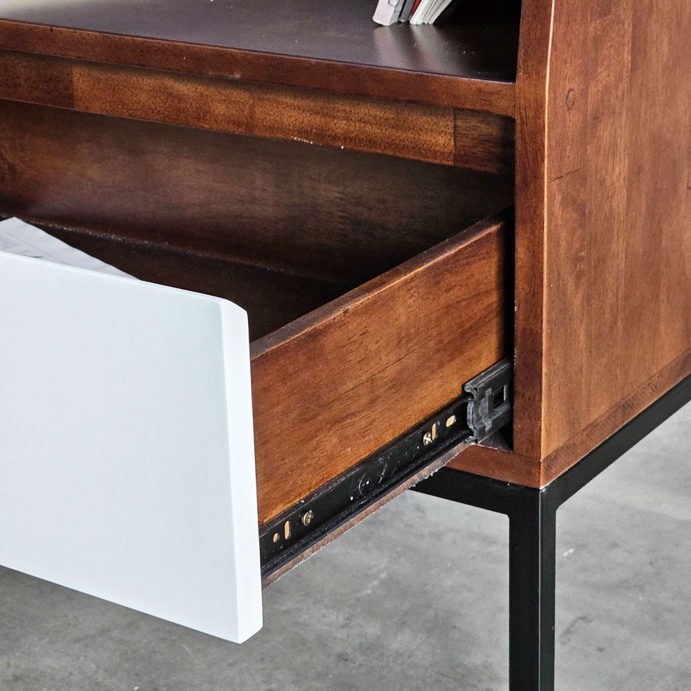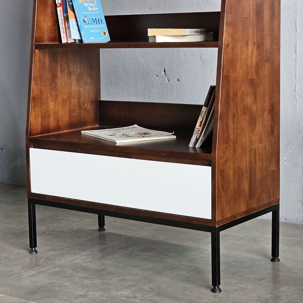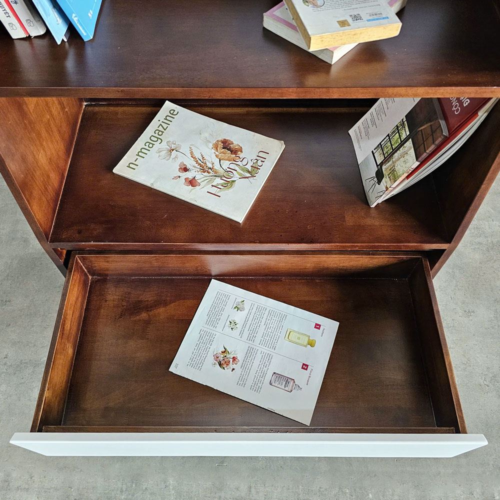 Ngăn kéo rộng rãi phía dưới kệ là một điểm cộng tuyệt vời. Nó cung cấp thêm không gian lưu trữ kín đáo cho những vật dụng cá nhân, giúp không gian sống của bạn luôn gọn gàng và ngăn nắp. Thay vì sử dụng tay nắm lồi thông thường, ngăn kéo của kệ sách được thiết kế với tay nắm cắt vát tinh tế, tạo điểm nhấn sang trọng và hiện đại cho sản phẩm.