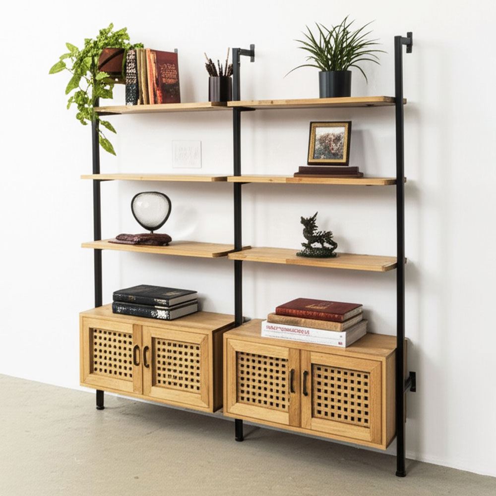 Kệ áp tường KS68271 là một sự kết hợp hoàn hảo giữa tính thẩm mỹ và công năng. Thiết kế độc đáo với 2 gian nối tiếp và ngăn tủ dưới sử dụng cửa tủ bằng chất liệu lưới mây mặt cáo mang đến vẻ đẹp tinh tế, góp phần tạo nên điểm nhấn ấn tượng cho không gian sống. Điểm đặc biệt của sản phẩm này nằm ở phần "chân" vững chắc, giúp phân tán đều trọng lượng lên sàn, giảm thiểu áp lực lên tường. Điều này không chỉ tăng độ bền cho kệ mà còn đảm bảo an toàn cho người sử dụng.