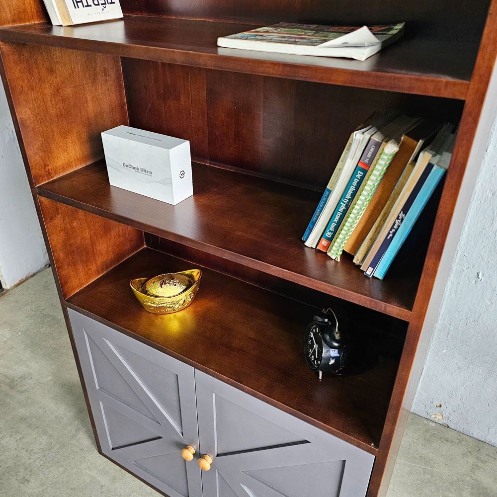 Kệ sách được chia thành hai phần rõ rệt: phần trên là 4 tầng kệ mở rộng rãi, phần dưới là ngăn tủ 2 tầng kín đáo. Với 4 tầng kệ mở rộng rãi, bạn có thể thoải mái sắp xếp những cuốn sách yêu thích của mình, tạo nên một "thư viện mini" ngay tại nhà. Còn ngăn tủ này là nơi lý tưởng để bạn cất giữ những vật dụng cá nhân, những đồ đạc ít khi sử dụng, hoặc những vật dụng bạn muốn giữ kín đáo, tránh bụi bẩn.