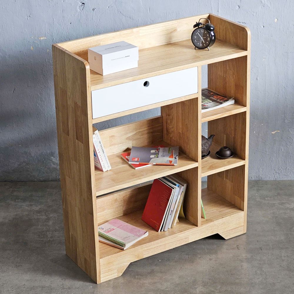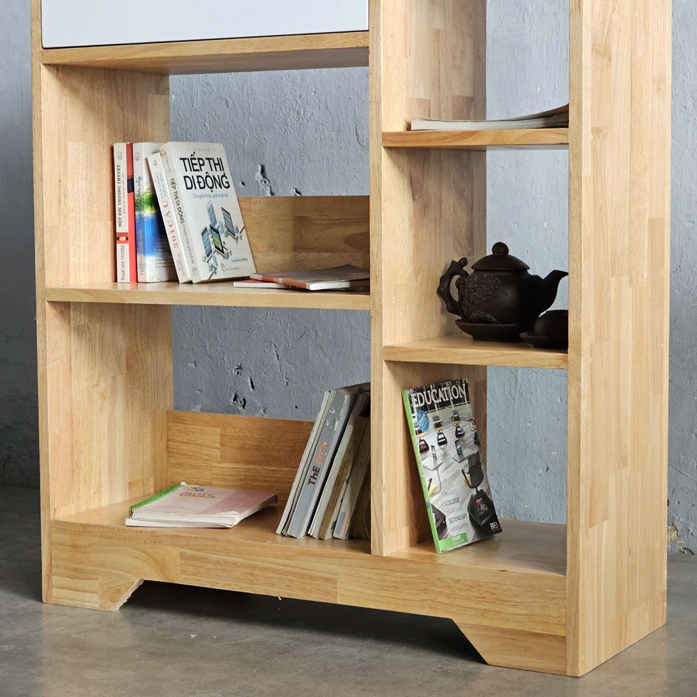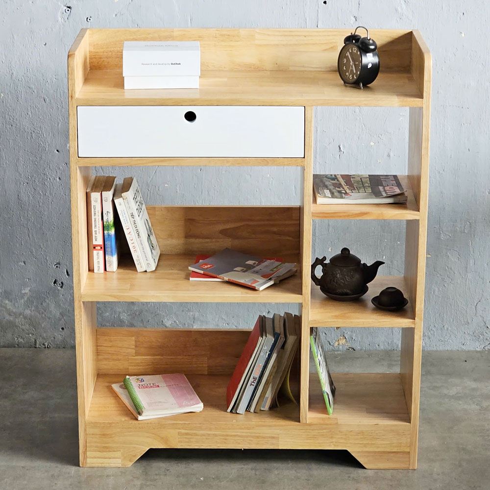 Ngăn kéo bên trên không chỉ cung cấp thêm không gian lưu trữ kín đáo cho những vật dụng cá nhân mà còn tạo điểm nhấn về mặt thị giác, phá vỡ sự đơn điệu. Bên trên cùng của kệ sách được thiết kế với viền gỗ bao quanh, một giải pháp thông minh giúp ngăn chặn những vật dụng bị rơi rớt. Các cạnh của kệ sách được bo tròn mềm mại, giảm thiểu nguy cơ va chạm và trầy xước, đặc biệt quan trọng đối với trẻ em.