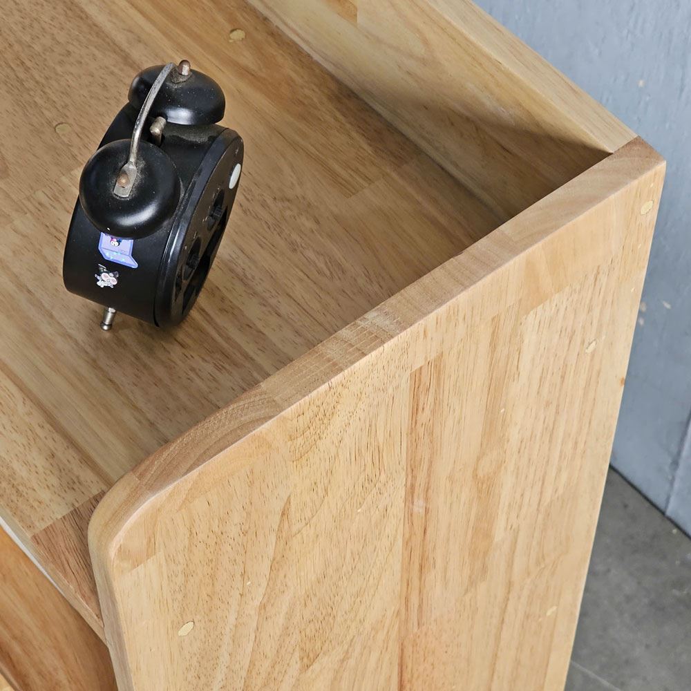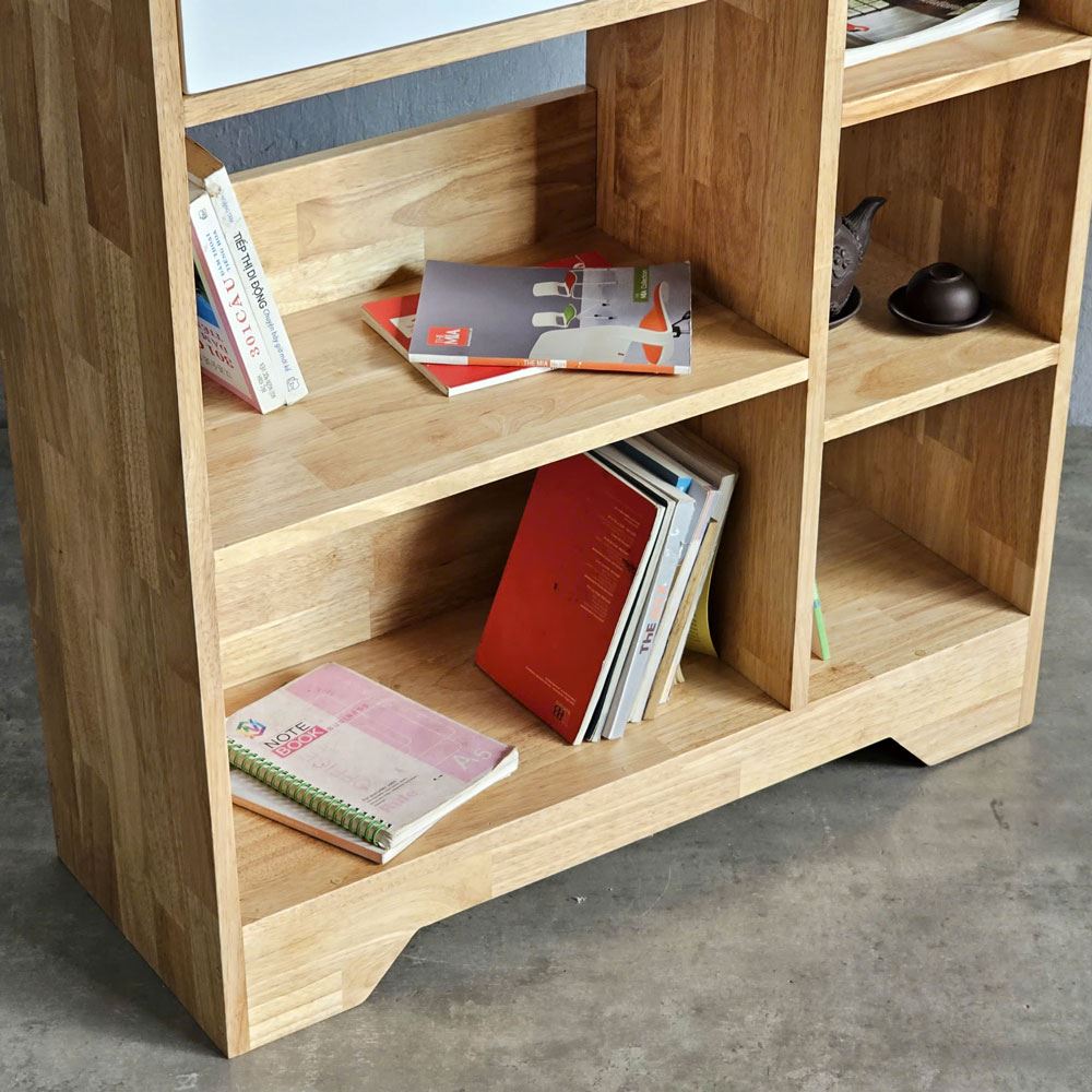 Kệ được làm bằng chất liệu gỗ cao su AA, được tuyển chọn kỹ lưỡng đảm bảo độ cứng cáp và khả năng chịu lực tốt. Bề mặt gỗ đã được xử lý chống thấm và chà nhám kỹ lưỡng, không chỉ giúp chống thấm nước, ẩm mốc mà còn sở hữu bề mặt mịn màng, sáng bóng, mang đến cảm giác thoải mái khi chạm vào. Màu sắc tự nhiên của gỗ cao su mang đến vẻ đẹp ấm áp, gần gũi với thiên nhiên, tạo nên một không gian sống thư thái và dễ chịu. Vân gỗ tự nhiên mềm mại, uyển chuyển như những dòng chảy thời gian, tạo nên một điểm nhấn độc đáo và thu hút.