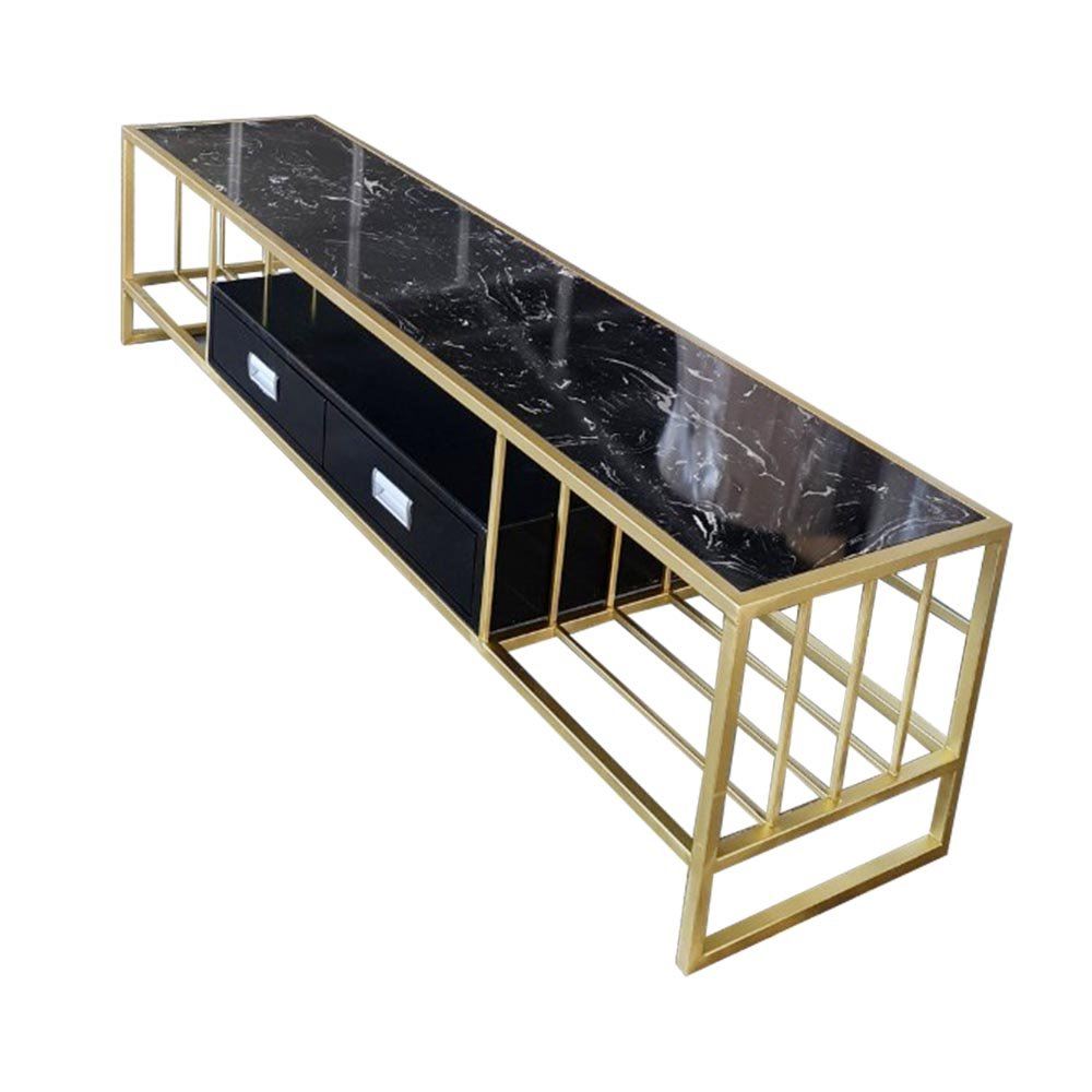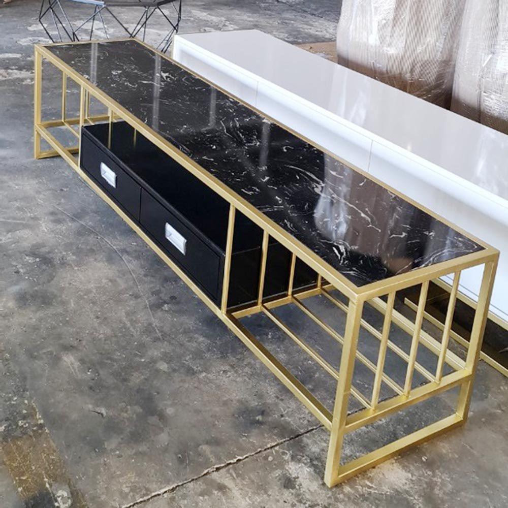 Kệ tivi 2 ngăn kéo mặt đá đen khung màu vàng đồng KTV68064 sở hữu kiểu dáng hiện đại phù hợp với không gian phòng khách sang trọng. Mặt đá đen cao cấp chịu lực tốt, hạn chế trầy xước kết hợp cùng khung sắt sơn màu vàng đồng toát lên vẻ đẹp trang nhã, hút mắt từ ánh nhìn đầu tiên. Bênh cạnh đó, kệ tivi KTV68064 với thiết kế 2 ngăn kéo giúp tăng khả năng lưu trữ, giúp phòng khách của bạn luôn gọn gàng ngăn nắp. Nếu bạn đang tìm kiếm kệ tivi sang trọng, đáp ứng công năng sử dụng thì mẫu kệ KTV68064 chắc chắn là sự lựa chọn không thể bỏ qua.