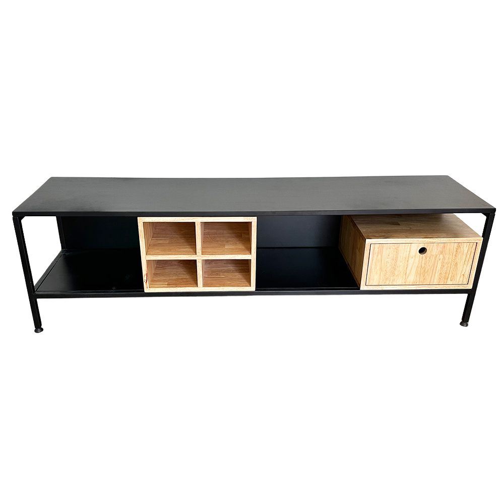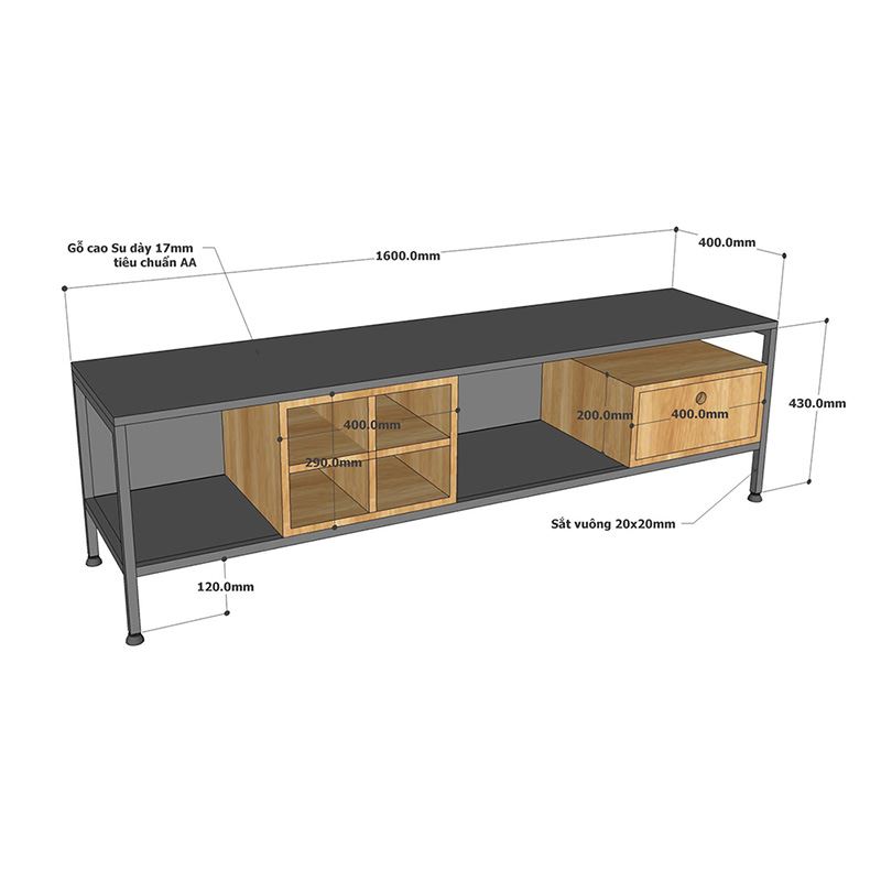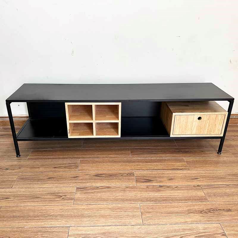 Kệ tivi có ngăn kéo gỗ cao su chân sắt KTV68092 với chiều dài 1.6m phù hợp với đa phần không gian và mọi thiết bị có thể vừa làm kệ tivi vừa làm tủ trang trí đều rất đẹp mắt. Chất liệu chính là gỗ cao su sơn Pu phối hợp giữa màu đen và màu tự nhiên kết hợp cùng khung sắt sơn tĩnh điện vô cùng chắc chắn. Sở hữu kiểu dáng hiện đại, tinh tế kết hợp với thiết kế thông minh chia nhiều ngăn, tầng giúp tăng không gian lưu trữ trong phòng khách.
