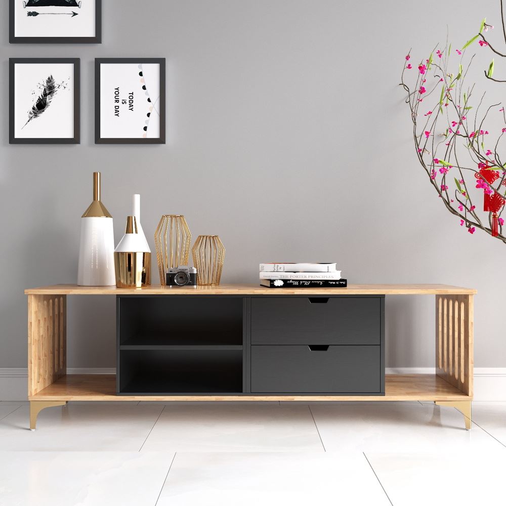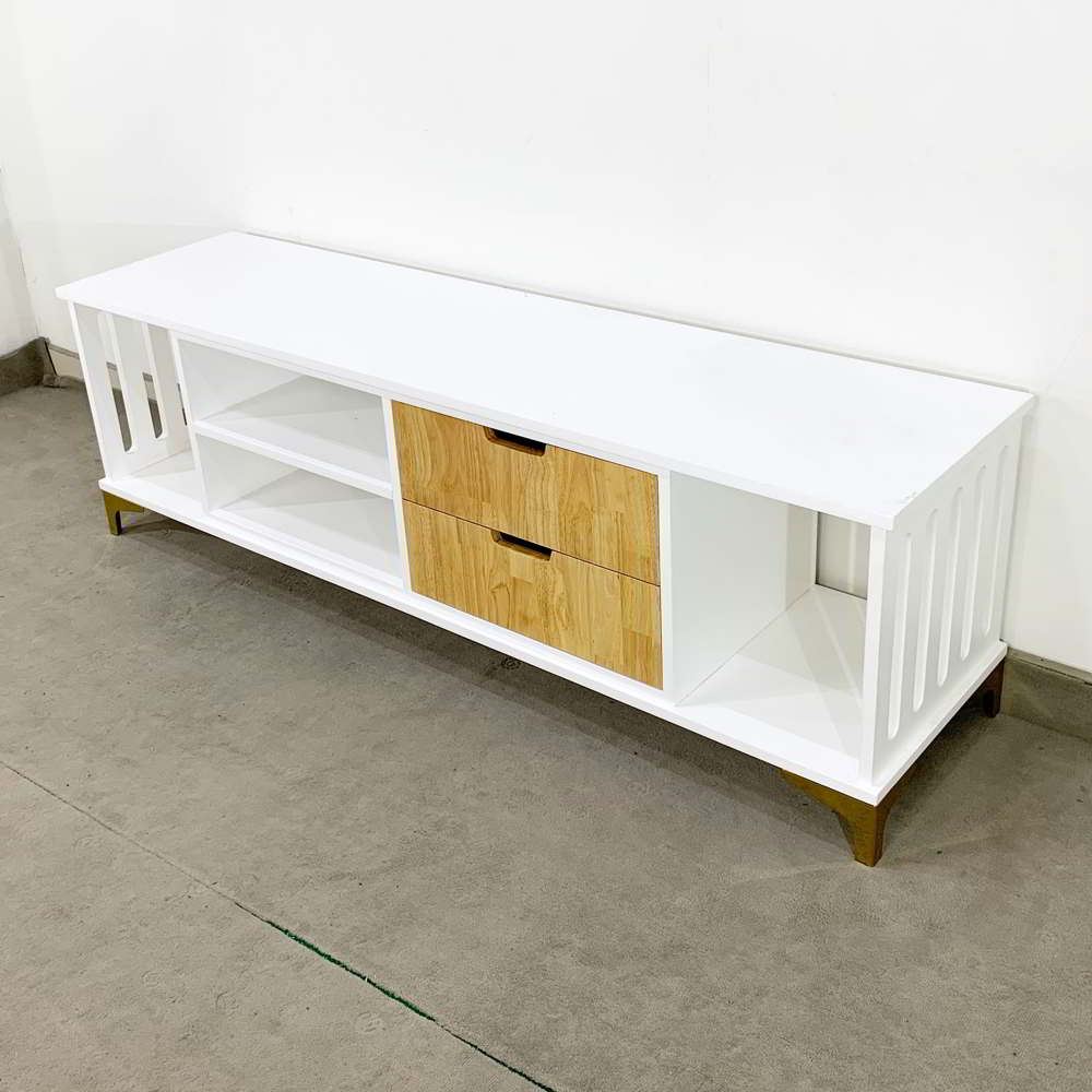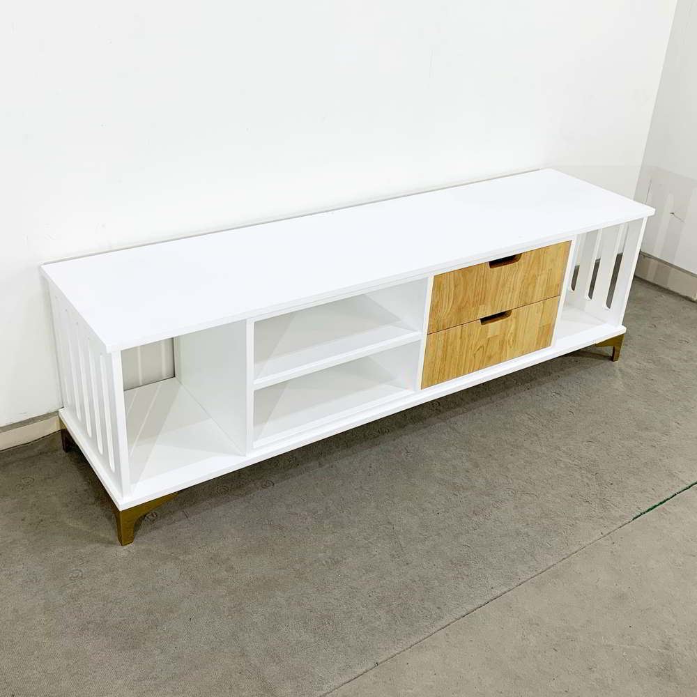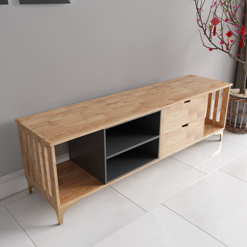 Kệ TV Phòng Khách KTV68041 với phong cách đơn giản mà hiệu quả, được làm từ chất liệu chính là gỗ cao su tự nhiên. Thiết kế phần tầng, chia ngăn hợp lý; cách phân chia ngăn để đồ của kệ TV KTV68041 giúp tạo nên sự mới mẻ cho không gian nội thất phòng khách thêm hiện đại và tiện nghi hơn. Hai bên mặt kệ TV được cắt CNC tạo thành các khe dài ấn tượng và có tạo nên sự thông thoáng hơn. Chân sắt được mạ màu vàng óng tạo thêm điển nhấn sang trọng cho không gian. Bằng chất liệu thép không gỉ, chân sắt mang lại cho bạn cảm giác yên tâm về độ bền bỉ cũng như khả năng chịu lực.