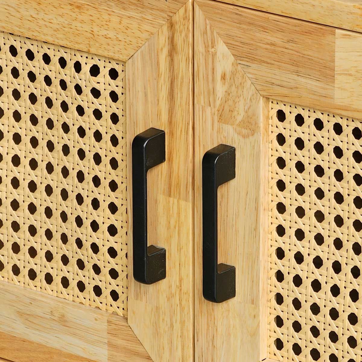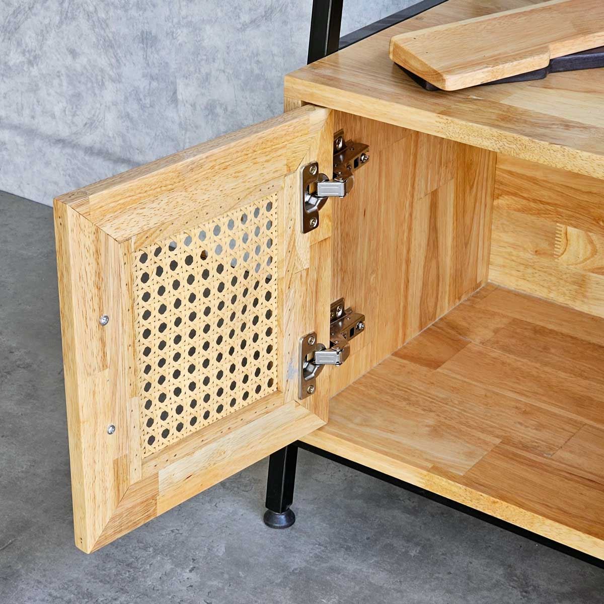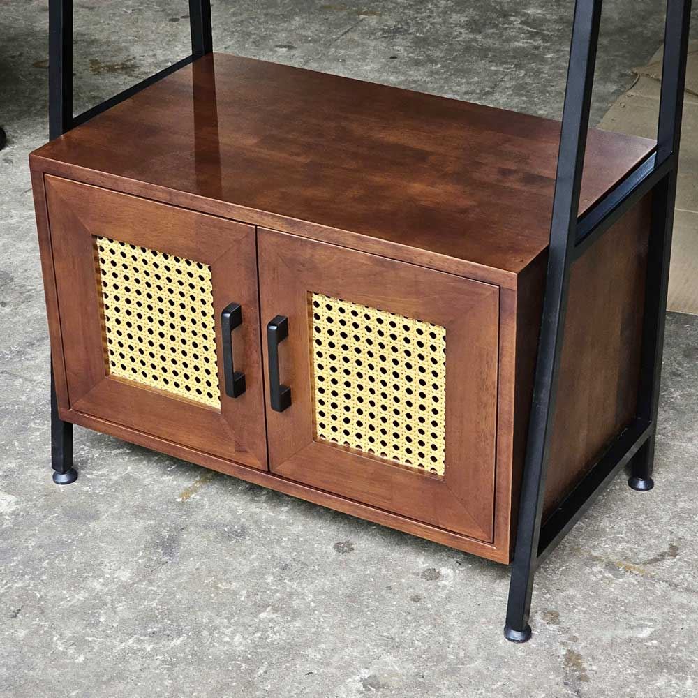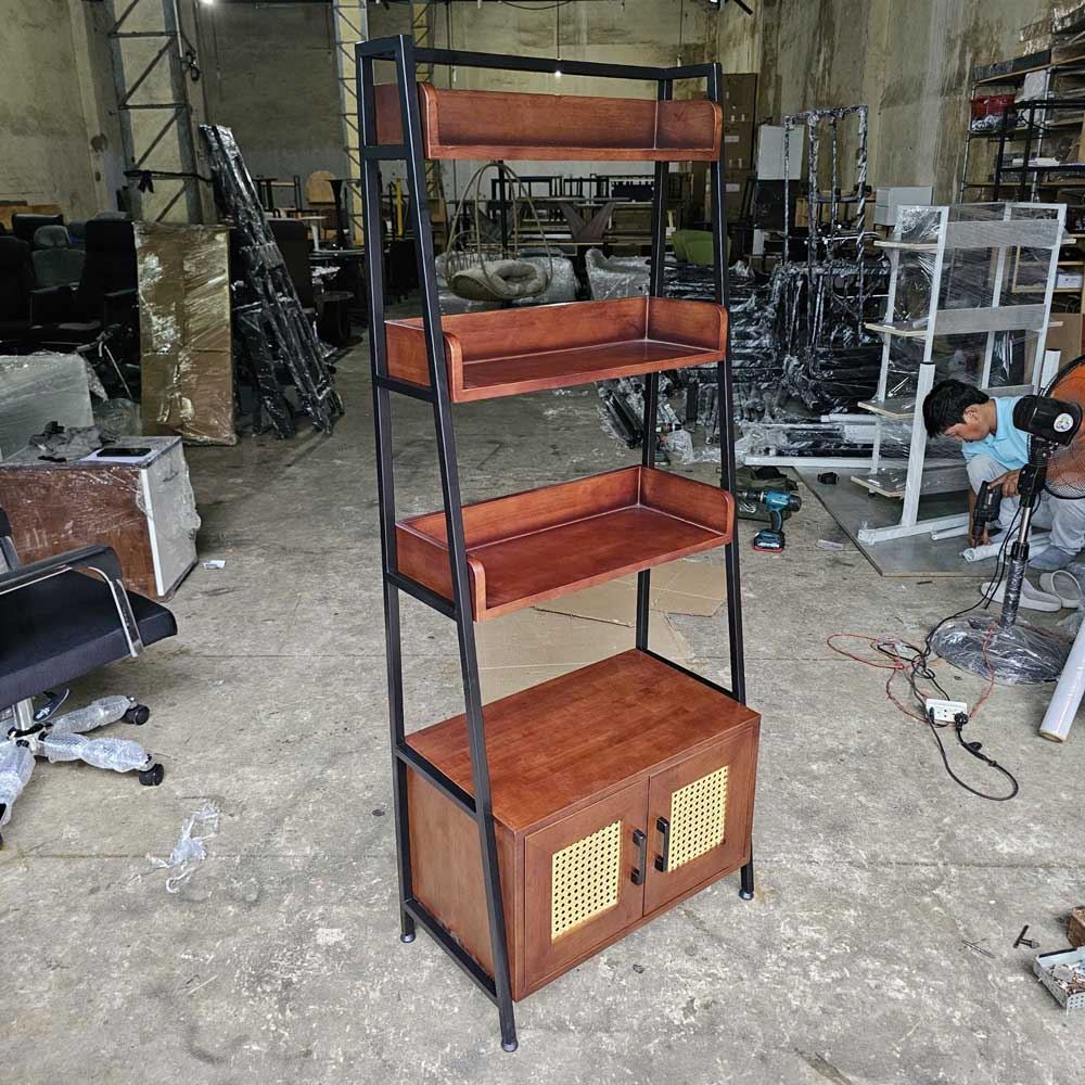 Mặt kệ sử dụng gỗ cao su AA cao cấp, bề mặt phủ sơn mịn màng, sang trọng. Cửa lưới đan bằng mây tạo sự thông thoáng và điểm nhấn độc đáo cho kệ.. Khung kệ được làm từ sắt dày dặn, hàn chắc chắn, đảm bảo khả năng chịu lực tốt và chống gỉ sét nhờ lớp sơn tĩnh điện. Kệ sách khung sắt hình thang là lựa chọn hoàn hảo cho những ai yêu thích phong cách hiện đại, sang trọng và tiện dụng.