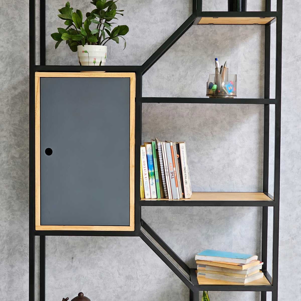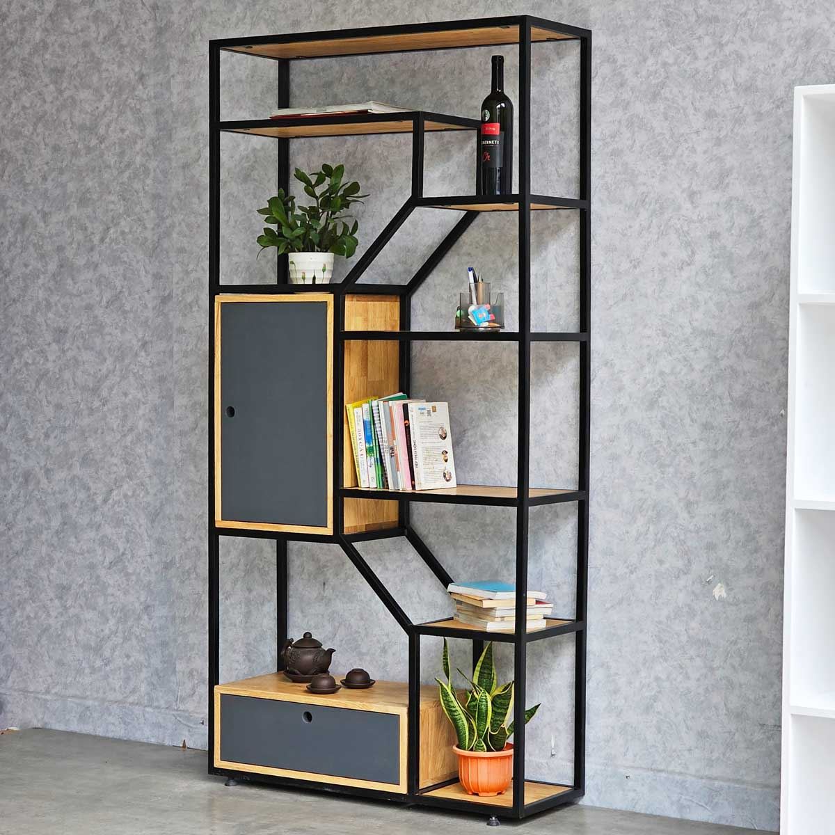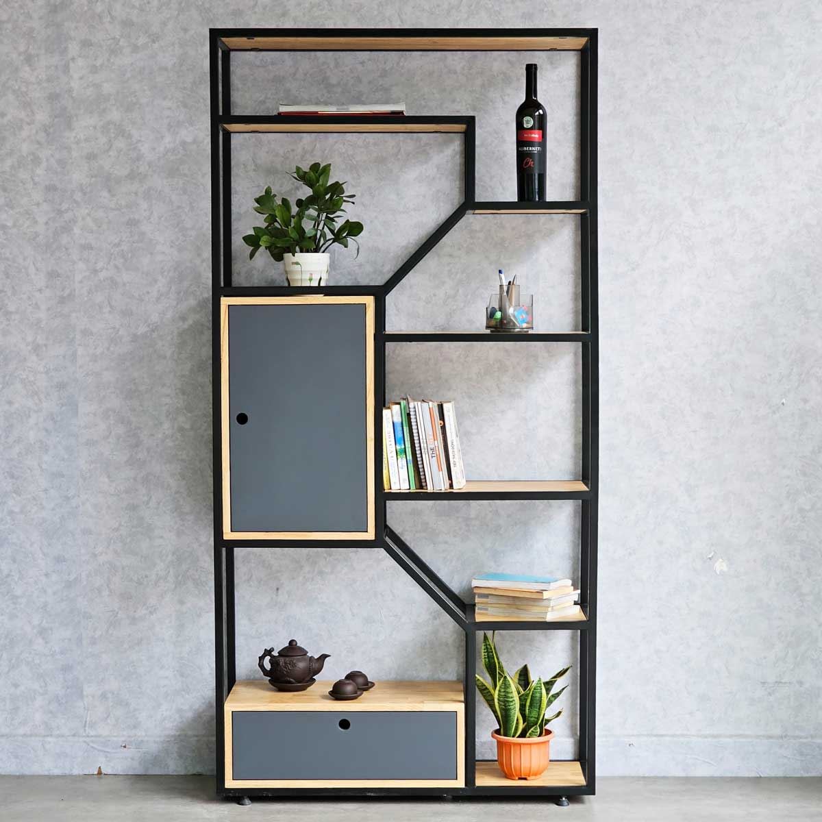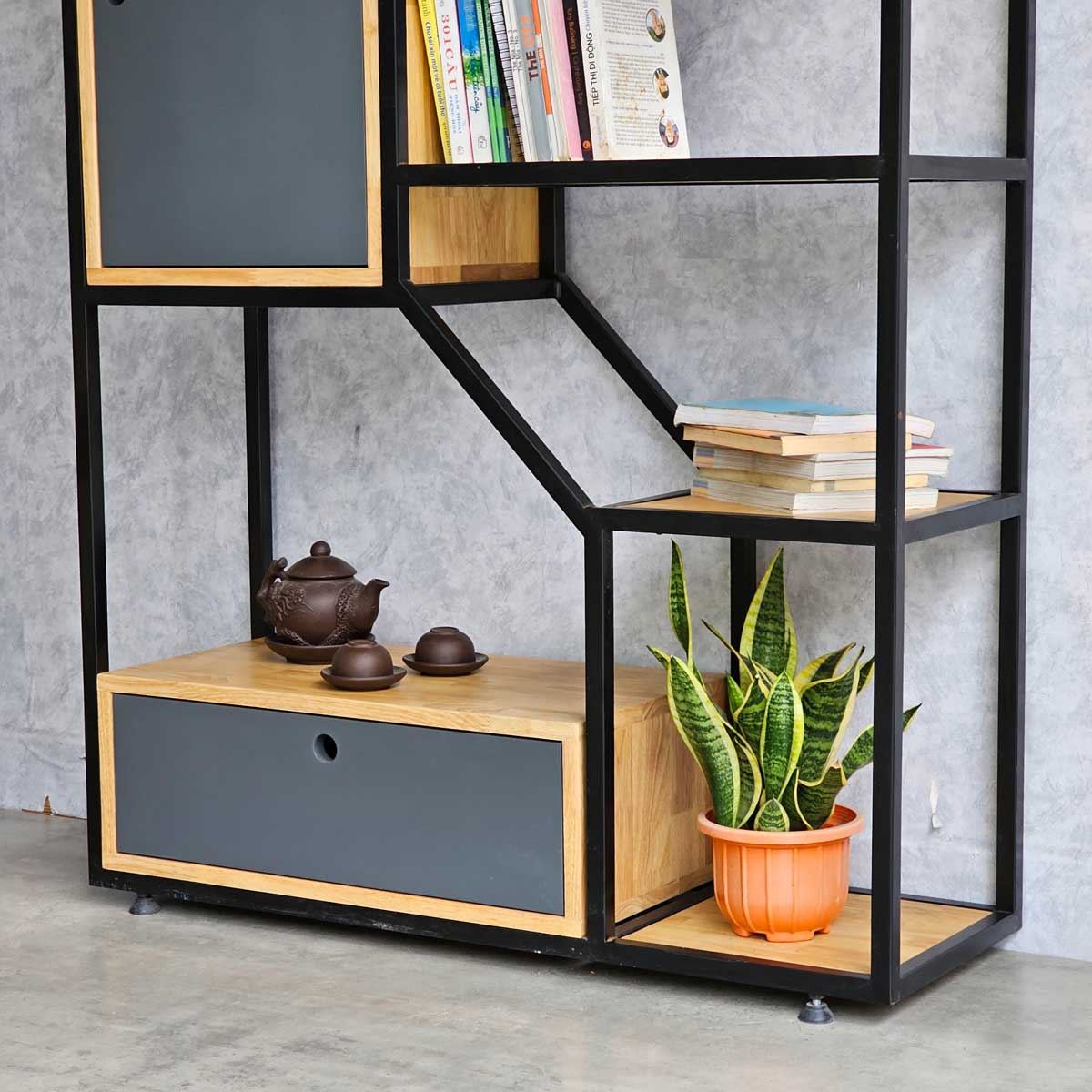 Kệ gỗ khung sắt có khả năng tạo điểm nhấn ấn tượng cho căn phòng