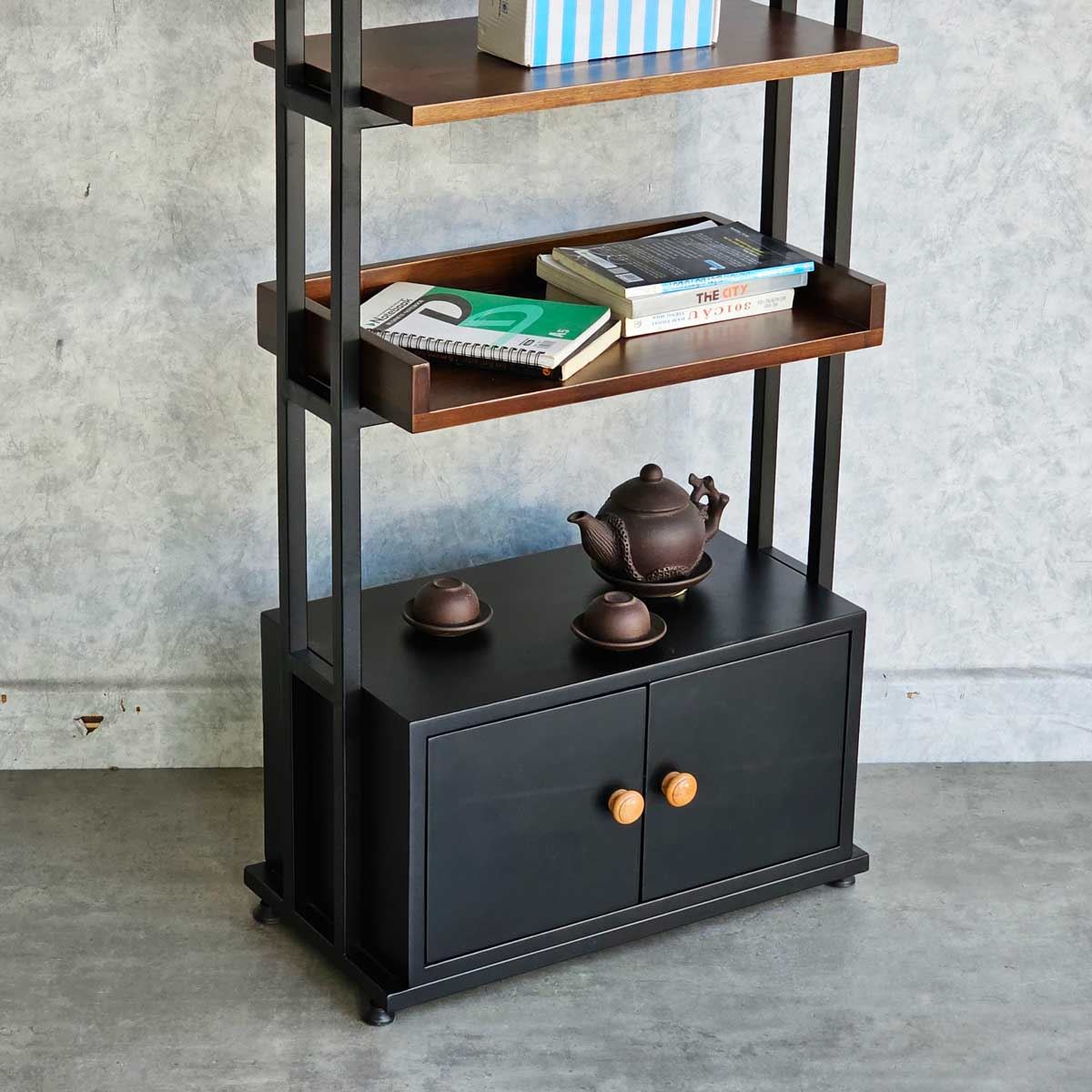 Ngăn tủ bên dưới có màu đen huyền bí, tạo điểm nhấn cho tổng thể kệ