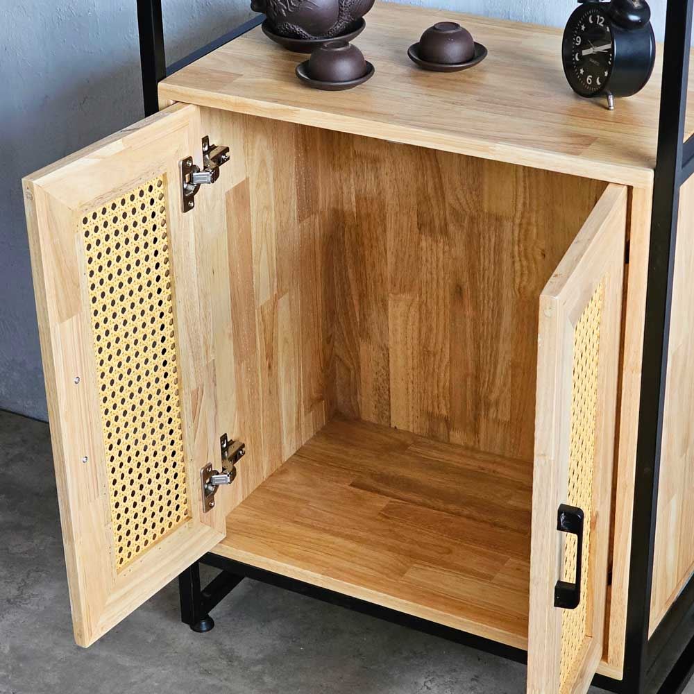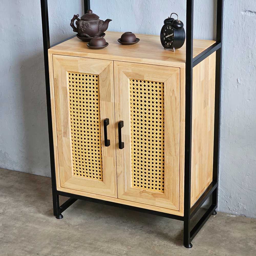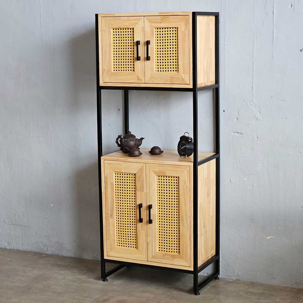 Điểm nhấn của chiếc tủ chính là những cánh cửa làm bằng lưới mây mắt cáo. Hoa văn lục giác đều của lưới mây không chỉ tạo nên hiệu ứng thị giác độc đáo mà còn mang đến sự thông thoáng, gần gũi với thiên nhiên. Màu sắc gỗ tự nhiên, thường là các tông nâu ấm áp, kết hợp với màu đen mạnh mẽ của khung sắt tạo nên một tổng thể hài hòa, sang trọng.