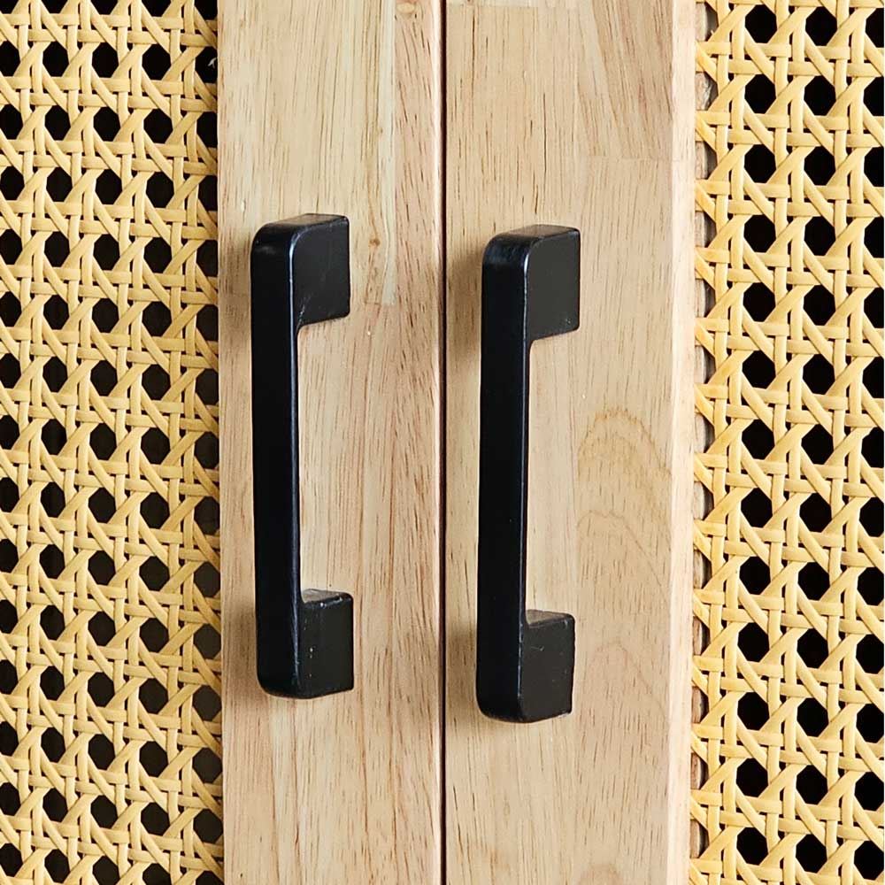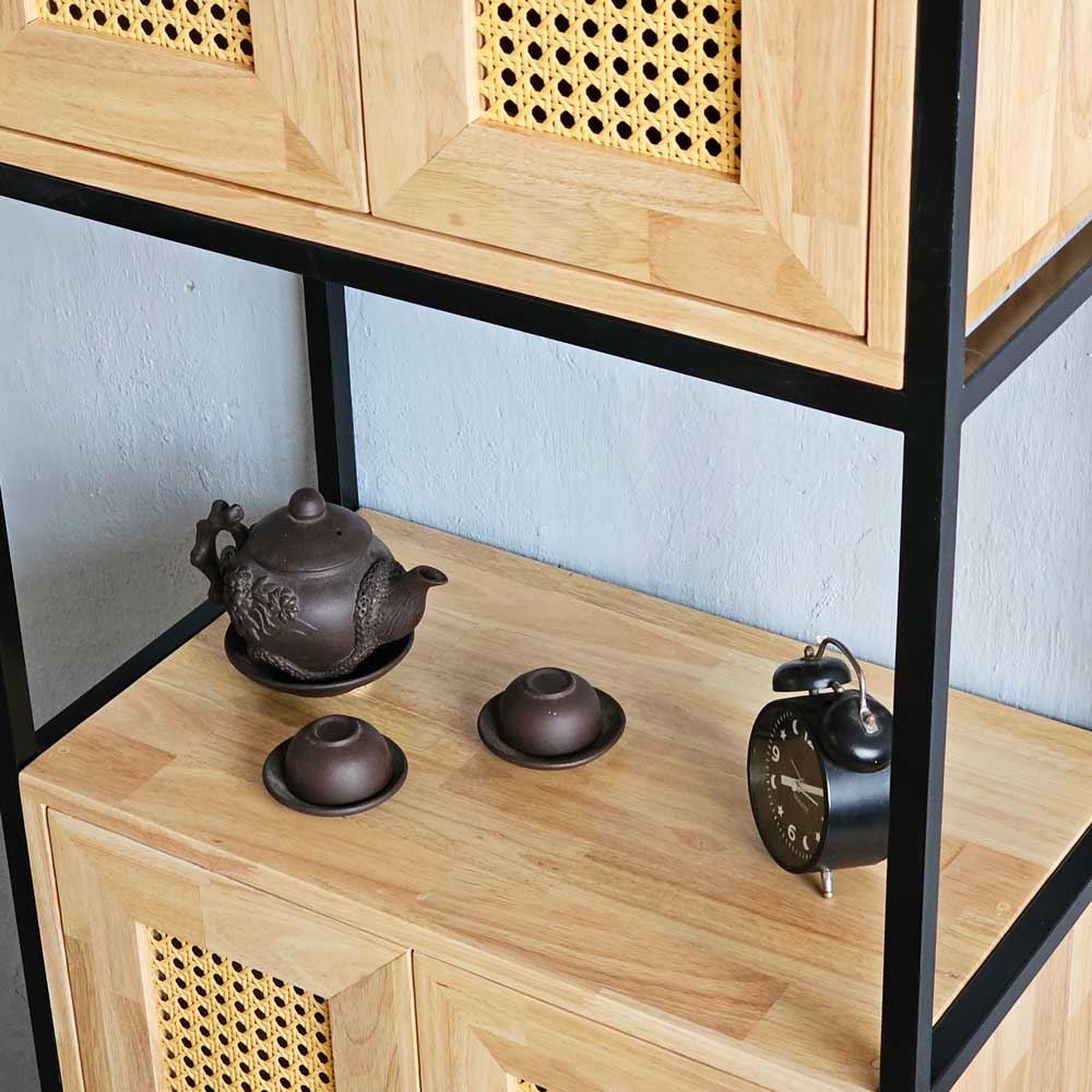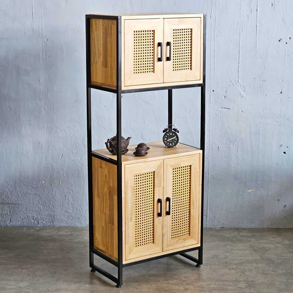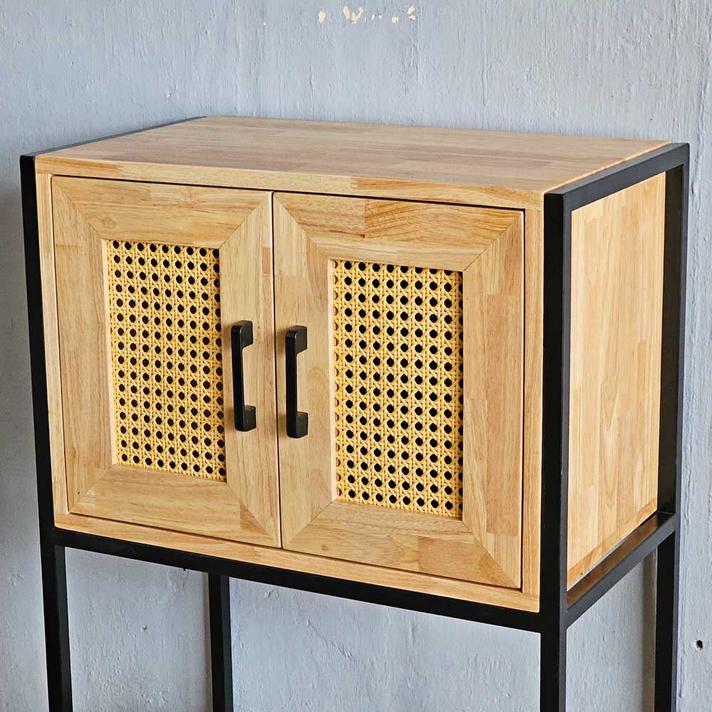 Điểm nhấn của chiếc tủ chính là những cánh cửa làm bằng lưới mây mắt cáo. Hoa văn lục giác đều của lưới mây không chỉ tạo nên hiệu ứng thị giác độc đáo mà còn mang đến sự thông thoáng, gần gũi với thiên nhiên. Màu sắc gỗ tự nhiên, thường là các tông nâu ấm áp, kết hợp với màu đen mạnh mẽ của khung sắt tạo nên một tổng thể hài hòa, sang trọng.