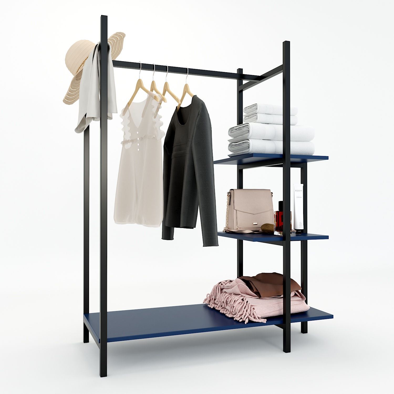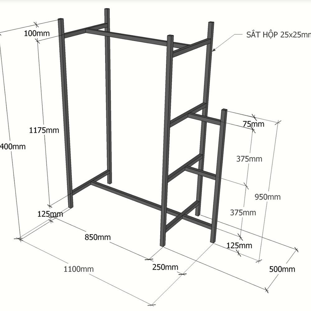 Thiết kế gồm khung bên để treo đồ với móc và hệ kệ 3 tầng giúp để mỹ phẩm hoặc các đồ xếp đẹp mắt, sạch sẽ bên cạnh đó kệ dưới chân giúp để giày đép hoặc đồ sếp thêm đều được