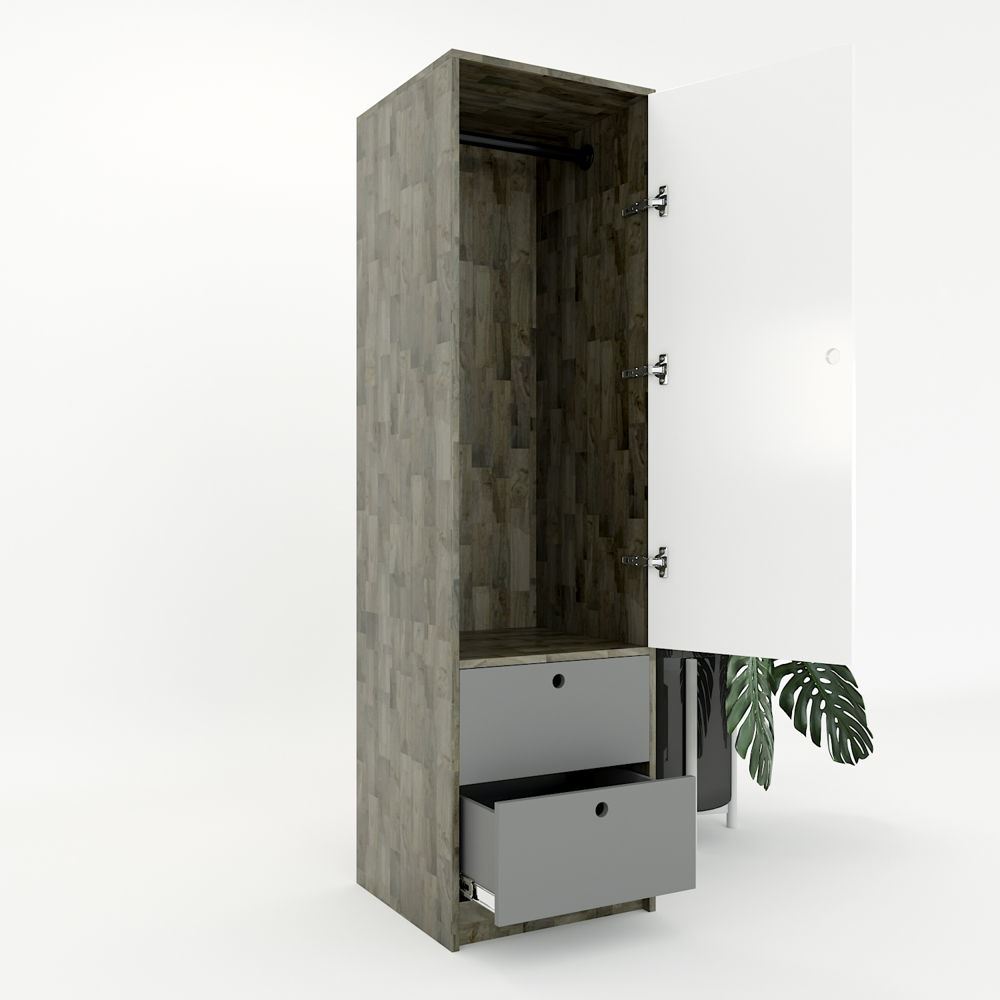 KQA68034 - Tủ quần áo nhỏ 1 cánh 2 hộc kéo gỗ cao su (60x55x180cm) thiết kế đơn giản cho không gian nhỏ với chiều rộng chỉ 60cm thiết kế 1 cửa phía trên để treo đồ và 2 hộc kéo để đồ cá nhân, hệ cửa không có khóa với lỗ tròn để móc cửa mở dơn giản, hệ khung và hộc kéo gỗ cao su tiêu chuẩn AA siêu bền chắc với 5 màu sắc lựa chọn, cửa mở bằng gỗ MDF chống ẩm sơn Pu màu sắc tùy chọn như ảnh đẹp mắt.