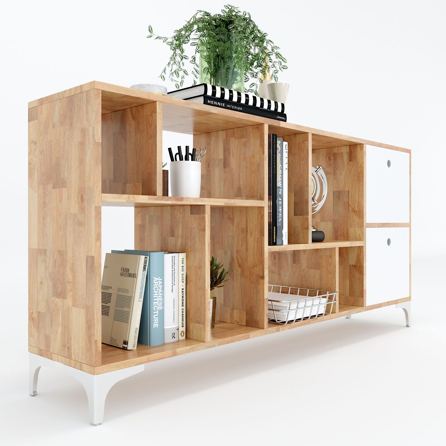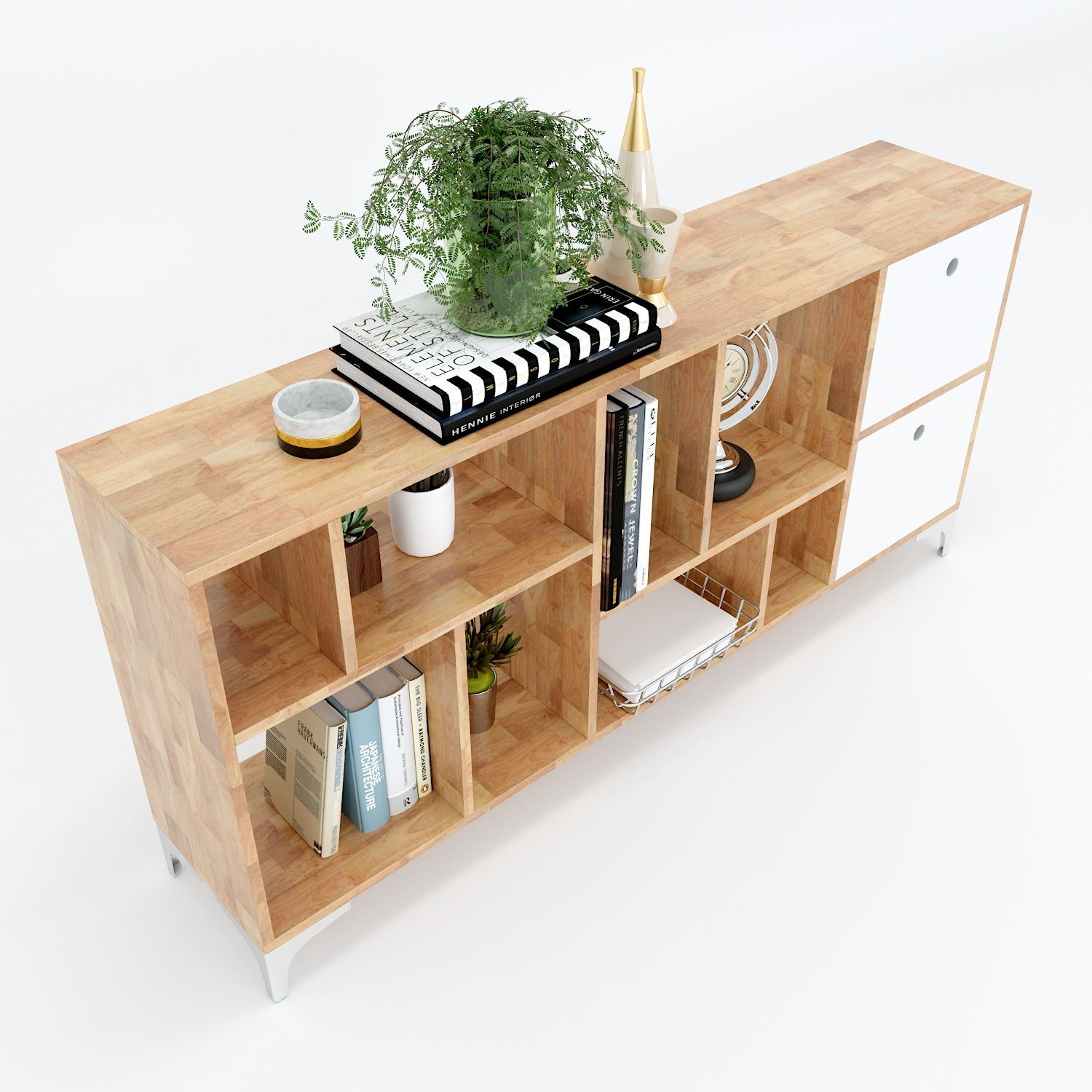 Kệ sách trang trí FUZZE gỗ cao su KTB68064 thiết kế hiện đại với chất liệu gỗ cao su tiêu chuẩn AA dày 17mm sơn Pu hoàn thiện với 2 màu gỗ tự nhiên và màu nâu lau cực đẹp, bên cạnh đó khách hàng có thể chọn màu sơn theo yêu cầu, với 4 chân được làm từ Inox sáng bóng, concept kệ FUZZE với đặc trưng là chia ô kết hợp với các cửa hoặc hộc kéo móc lỗ tròn sơn màu đẹp mắt.