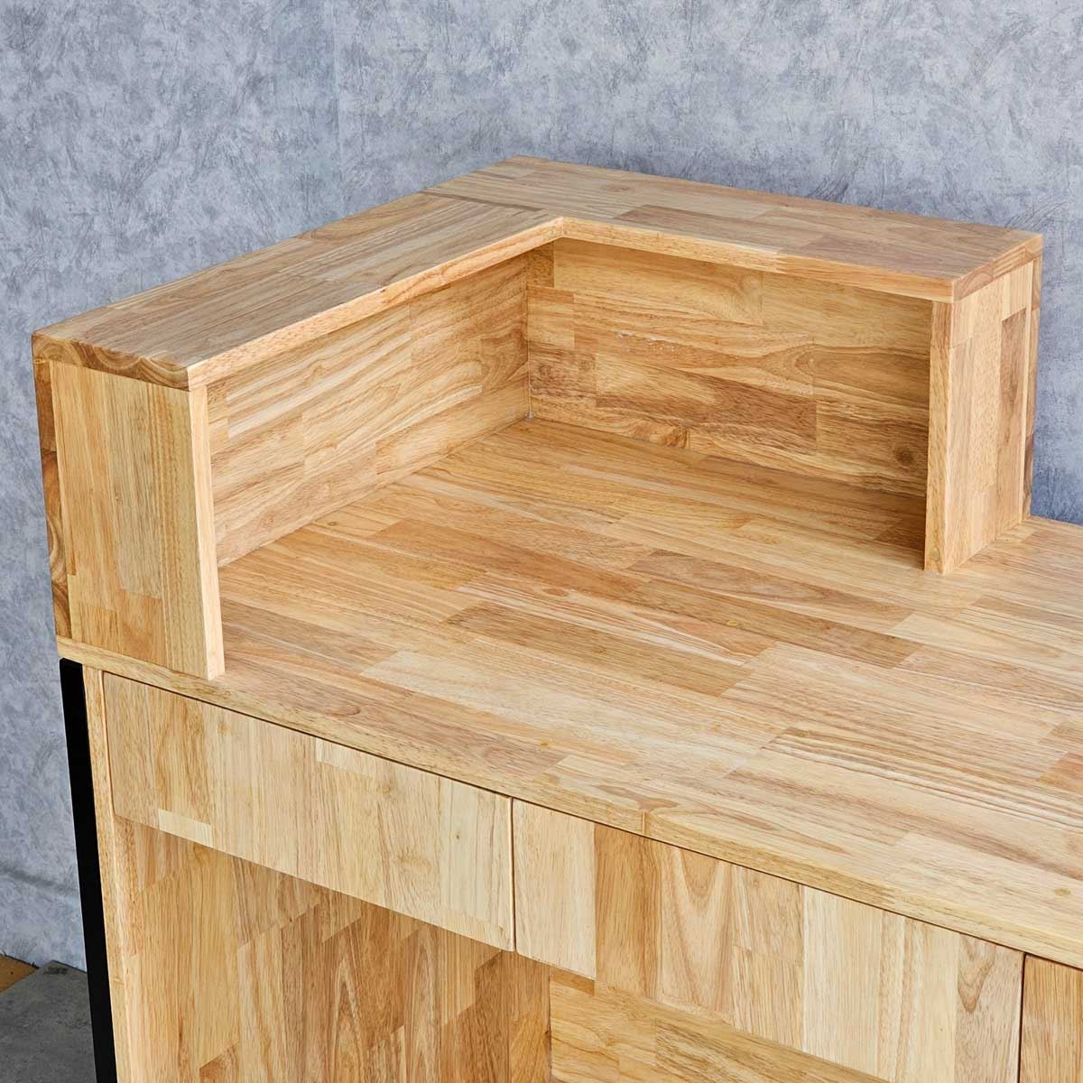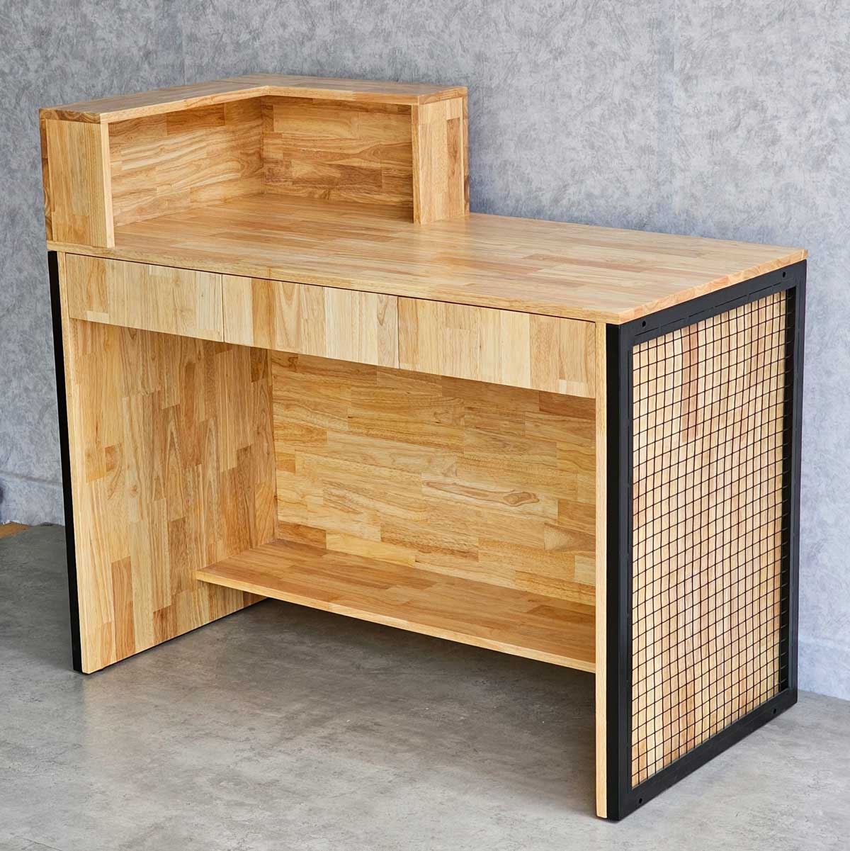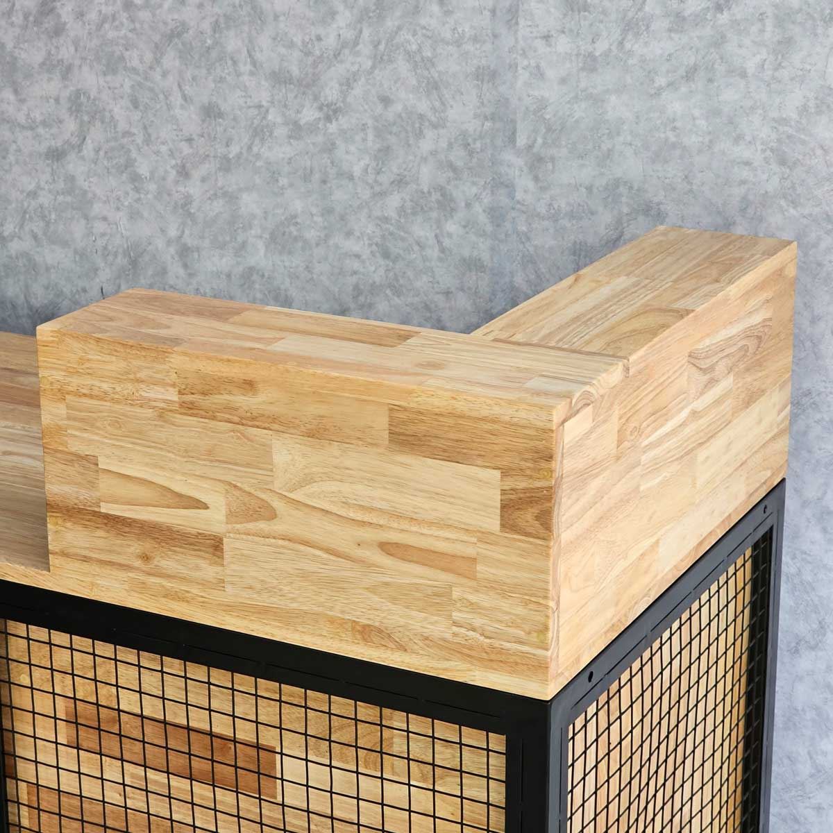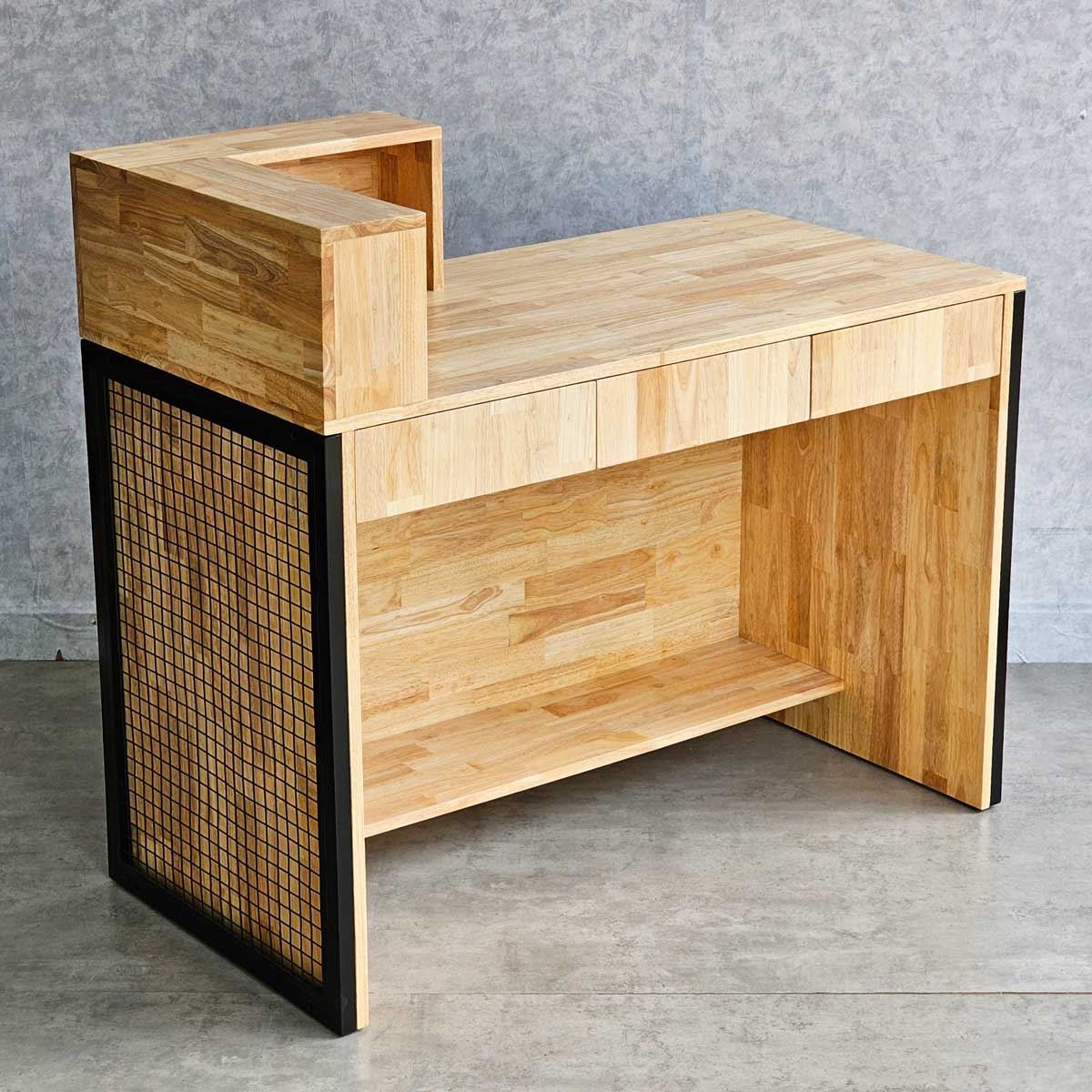 Quầy lễ tân được làm hoàn toàn bằng gỗ cao su AA, chuẩn xuất khẩu, được xử lý chàm nhám mịn màng và phủ lớp chống thấm nước giúp tăng độ bền và đảm bảo tính thẩm mỹ. Gỗ cao su được biết đến với độ bền cao, khả năng chống thấm nước tốt và vân gỗ đẹp mắt. Khung sắt bao quanh quầy mang lại hiệu ứng trang trí độc đáo, tạo nên phong cách riêng cho doanh nghiệp và giúp ghi dấu ấn tượng trong tâm trí khách hàng.