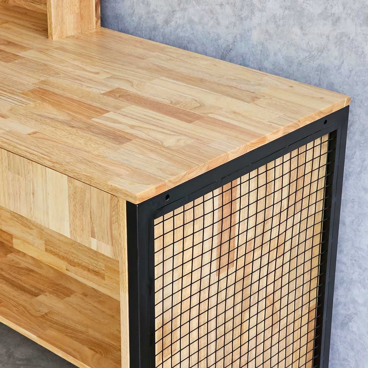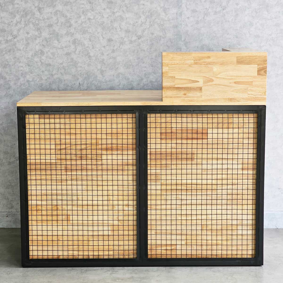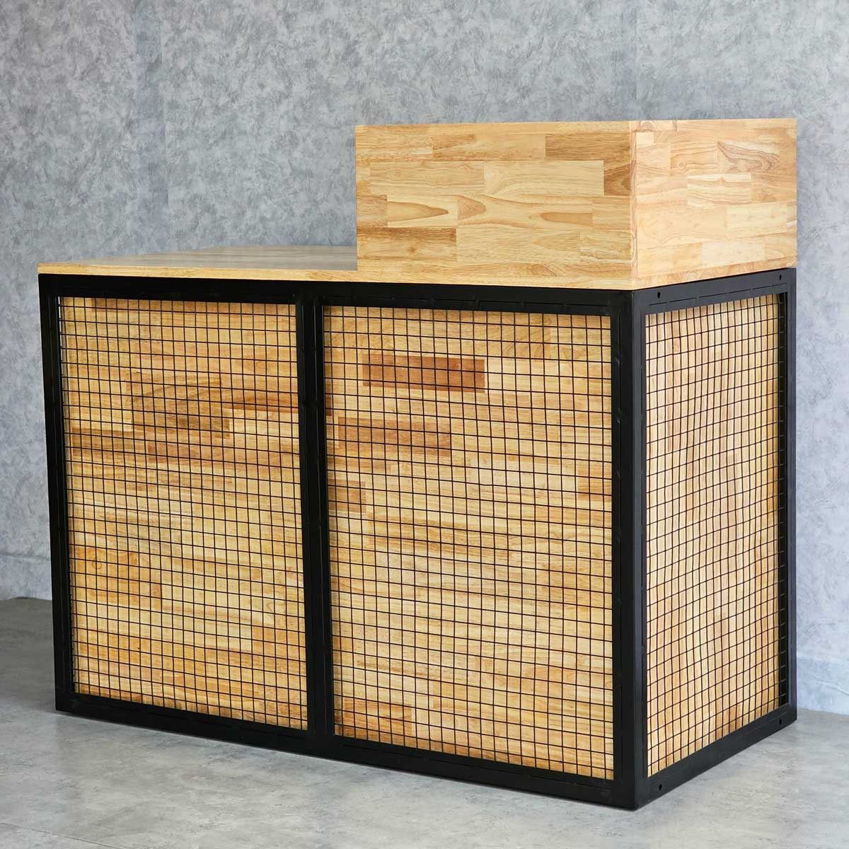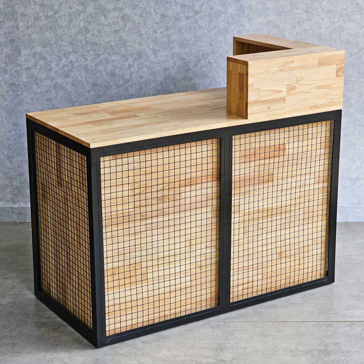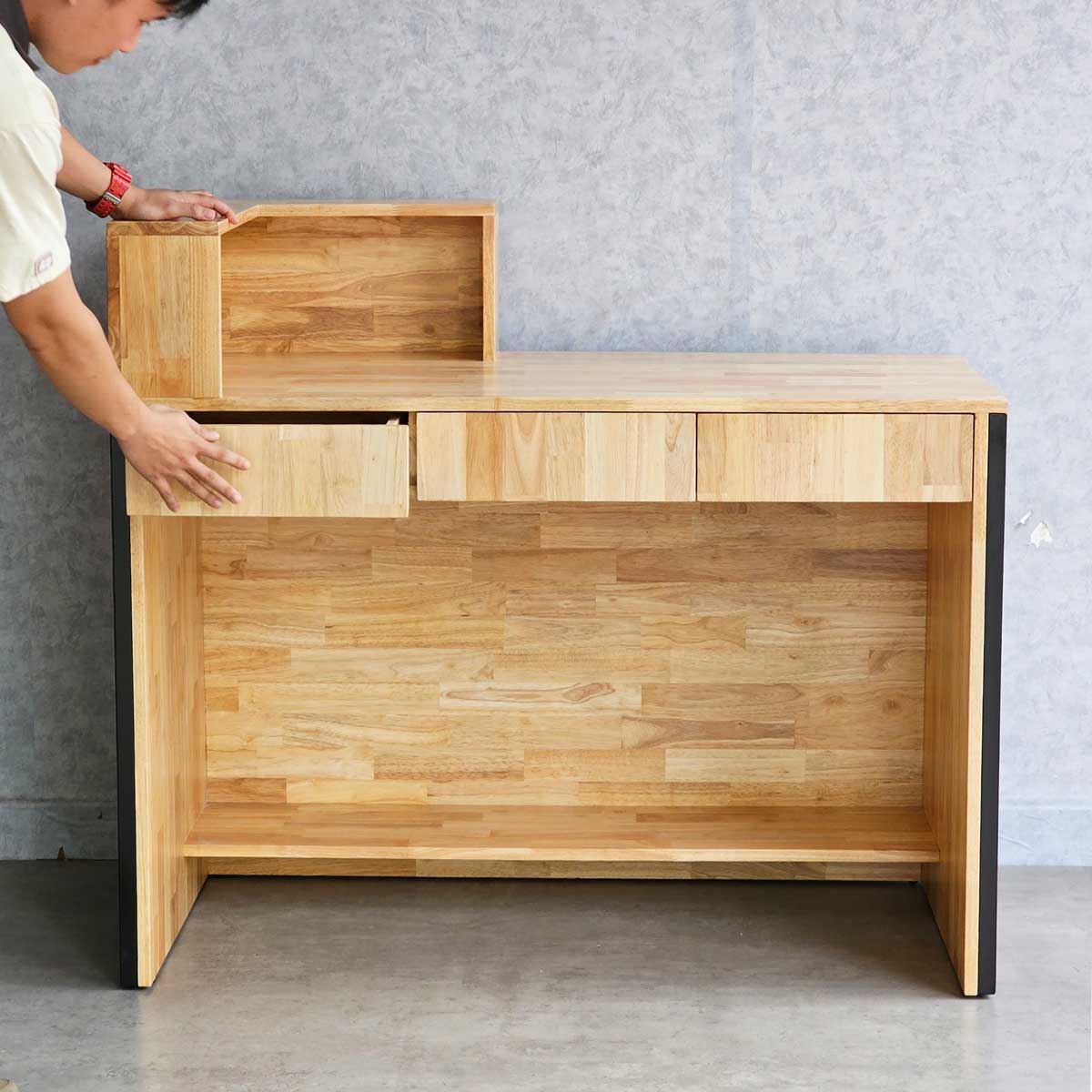 Quầy lễ tân được làm hoàn toàn bằng gỗ cao su AA, chuẩn xuất khẩu, được xử lý chàm nhám mịn màng và phủ lớp chống thấm nước giúp tăng độ bền và đảm bảo tính thẩm mỹ. Gỗ cao su được biết đến với độ bền cao, khả năng chống thấm nước tốt và vân gỗ đẹp mắt. Khung sắt bao quanh quầy mang lại hiệu ứng trang trí độc đáo, tạo nên phong cách riêng cho doanh nghiệp và giúp ghi dấu ấn tượng trong tâm trí khách hàng.