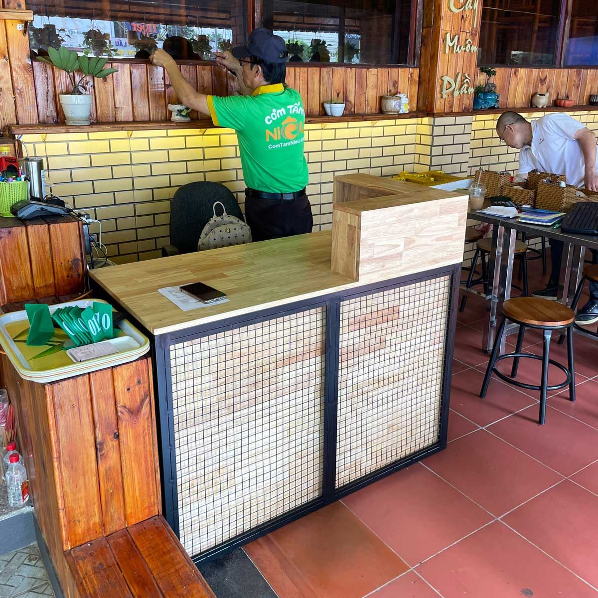 Khung sắt bao quanh quầy tạo điểm nhấn và tăng độ bền cho sản phẩm, đồng thời góp phần tạo nên phong cách riêng cho doanh nghiệp
