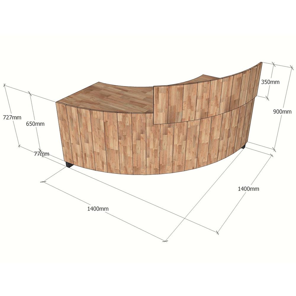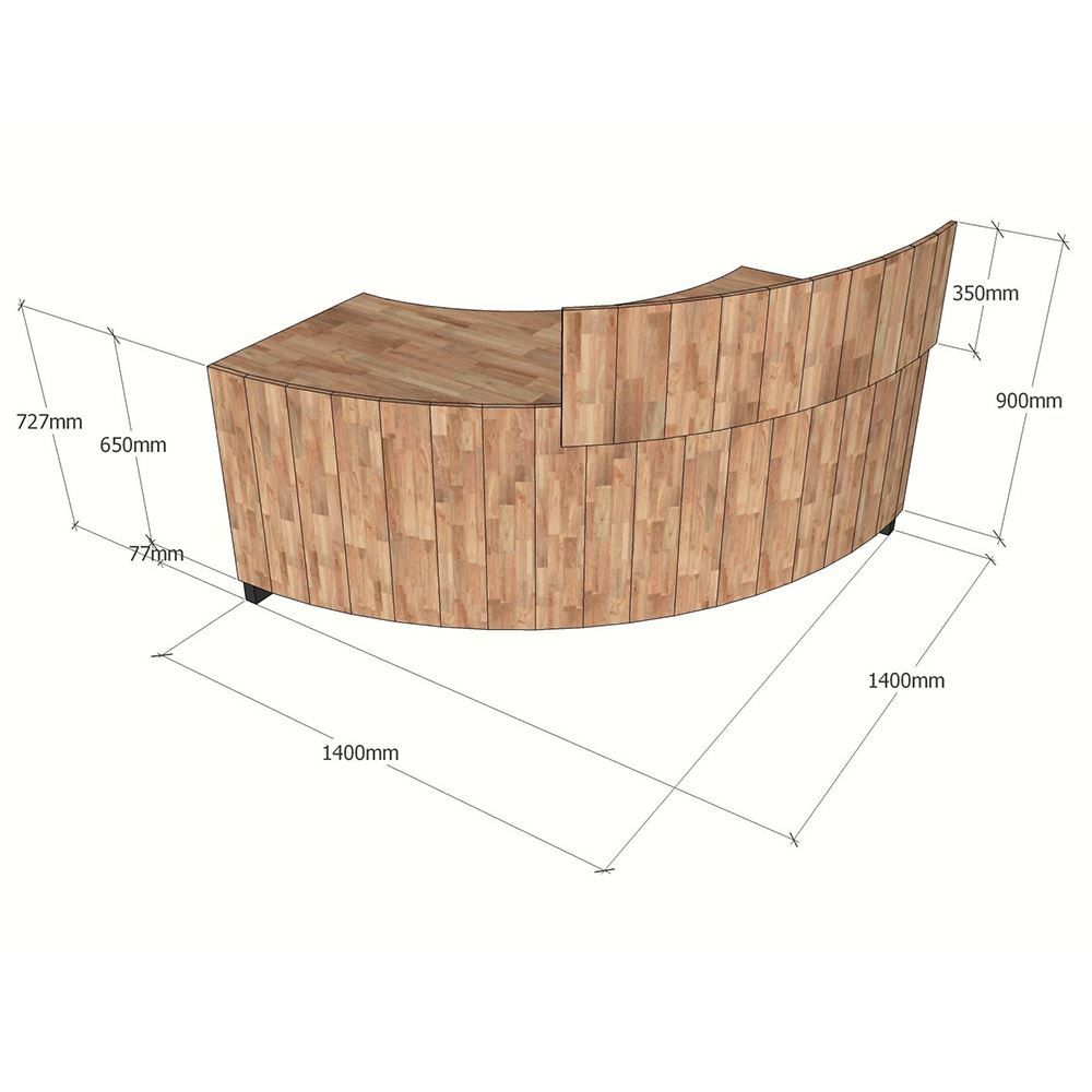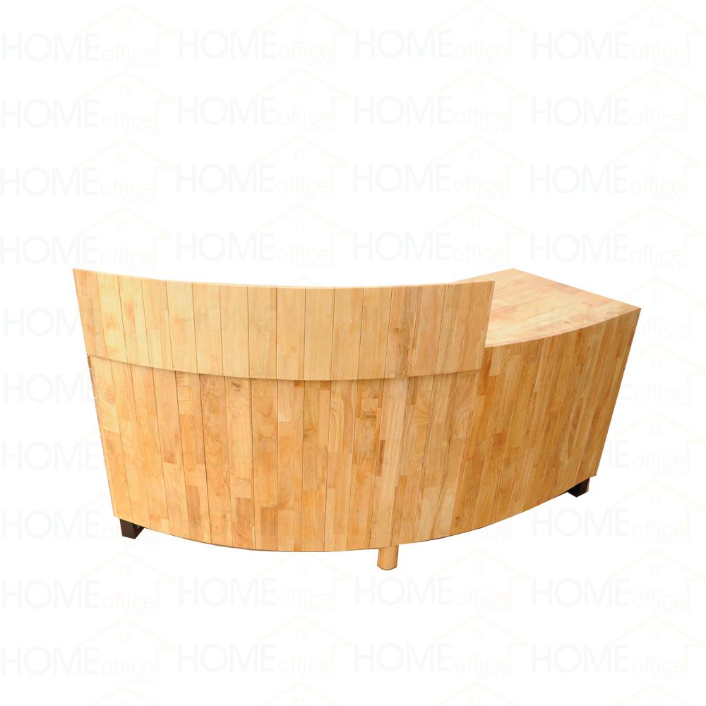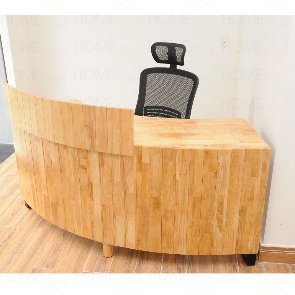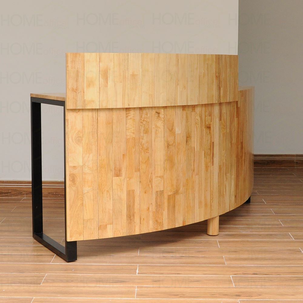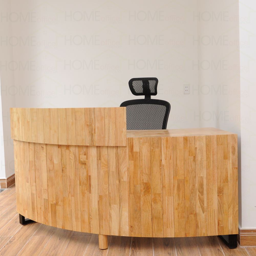 Quầy lễ tân được làm bằng gỗ cao su AA ghép, đã xử lý chống cong vênh chống mói mọt, trên bề mặt gỗ được phủ một lớp PU chống ẩm ướt, chống thấm nước làm cho bàn luôn bền đẹp với thời gian. Với thiết kế bàn được làm hoàn toàn bằng gỗ, luôn mang lại sự sang trọng bên cạnh đó là một cái nhìn rất thiện cảm tử những người khác. Với kích thước rộng và cong viền Oval, bàn vẫn có đủ dư khoảng không rộng rãi để làm việc cho hai người.