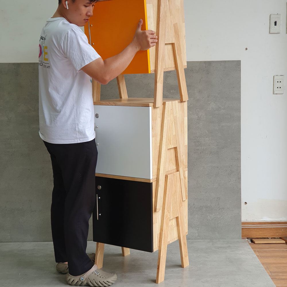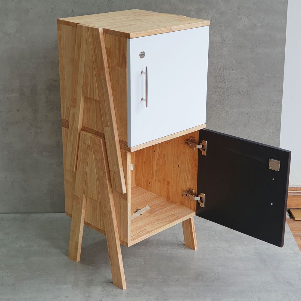 TCN68006 - Tủ cá nhân mini một chân gỗ chữ A là món nội thất có thiết kế hình học ô vuông giúp mang lại cảm hứng hình học cho không gian của bạn. Với kiểu dáng hình ô vuông giúp tạo một cảm giác thoải mãi, an toàn và cân bằng trong tâm trí của bạn. Nếu bạn đã quá nhàm chán với những mấu thiết kế rập khuyên và đang tìm một mẫu tủ cá nhân có thiết kế độc đáo, mới mẻ thì mẫu tủ này là một sự lựa chọn phù hợp cho bạn. Với thiết kế khối ô vuông bạn vừa có thể sử dụng làm tủ cá nhân mini đặt riêng lẻ, vừa có thể kết hợp nhiều chiếc tủ lại tạo thành chiếc tủ có kích thước lớn hơn, cụ thể là kiểu đứng hoặc là kiểu hình thang, tùy vào sự sáng tạo của bạn.