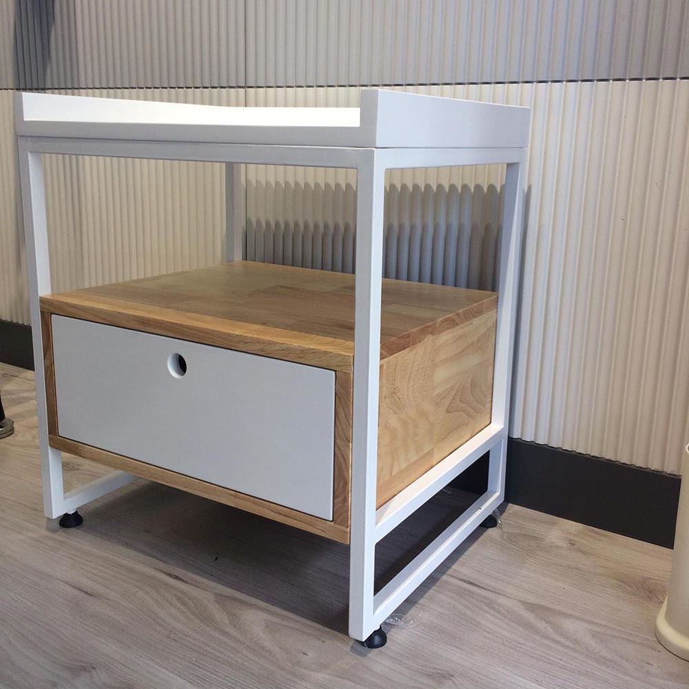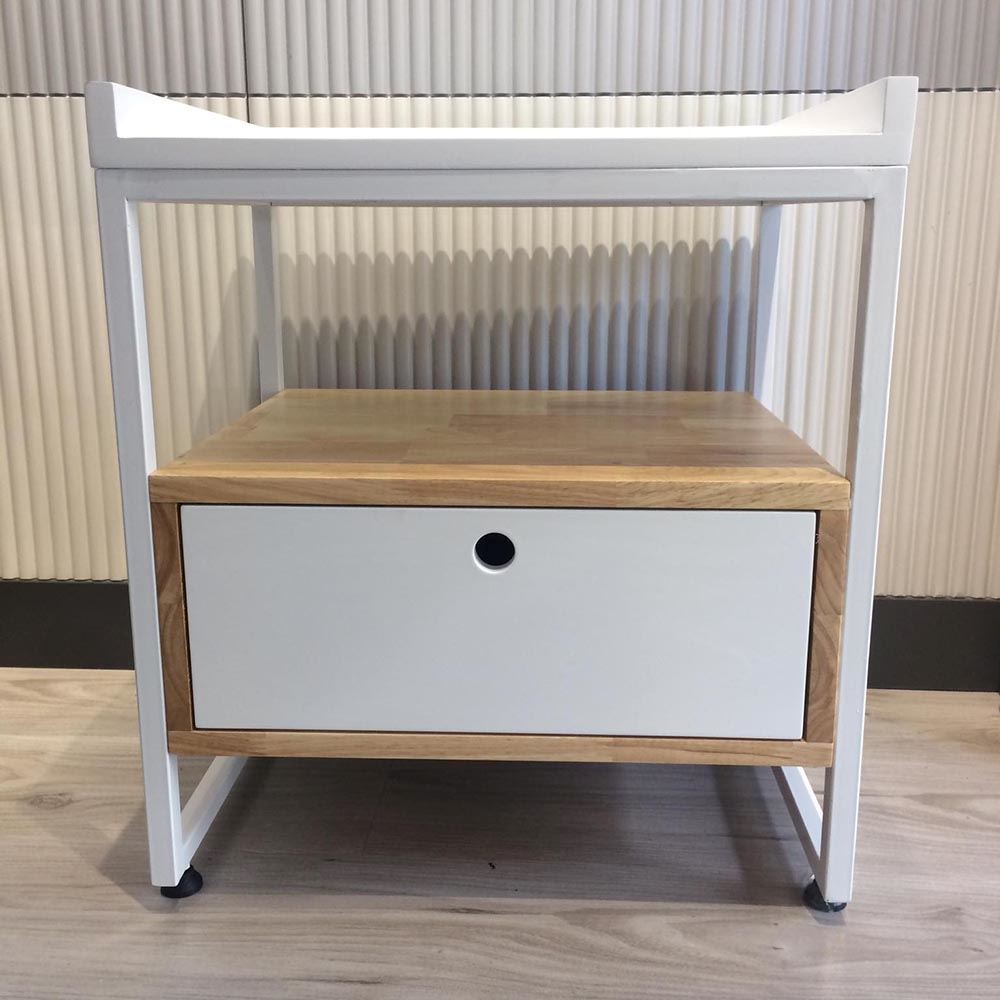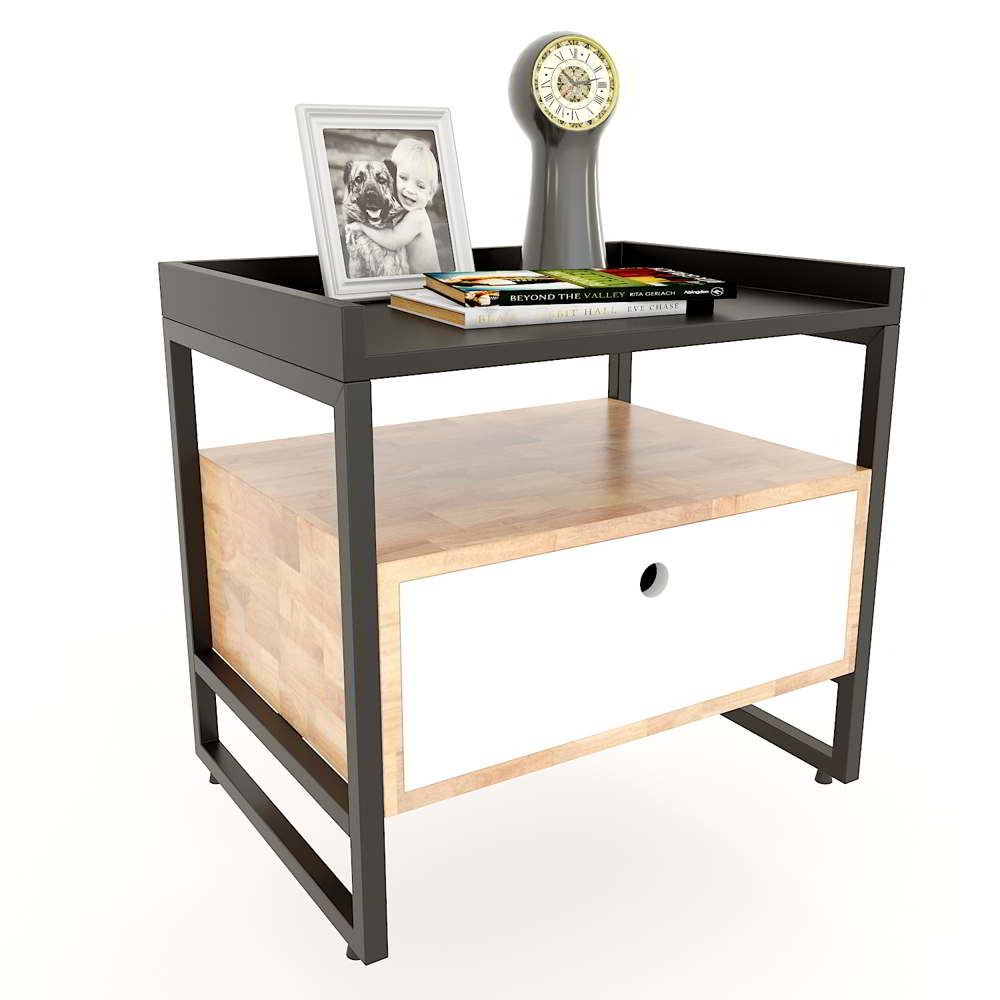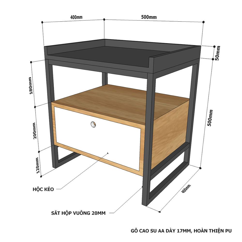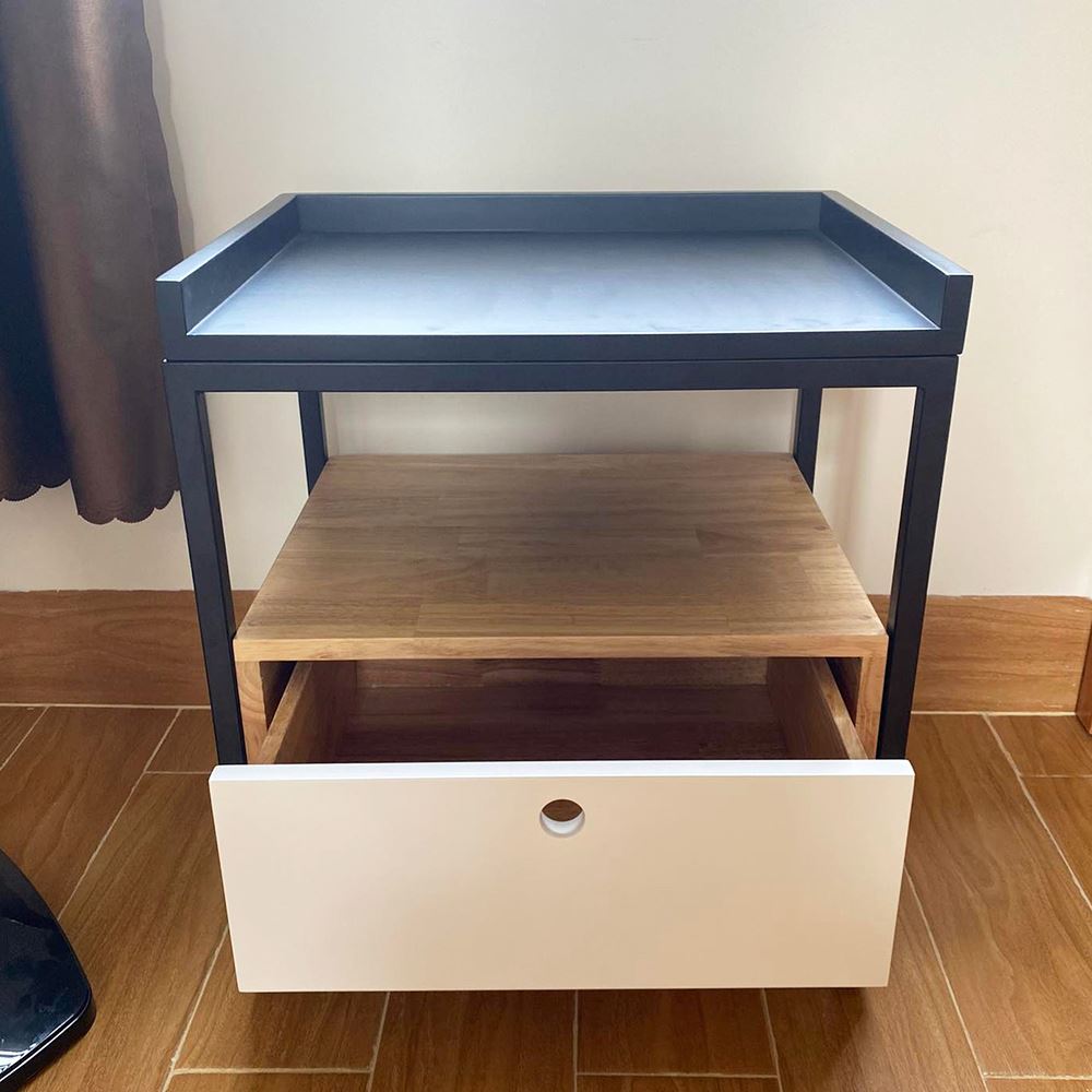 Tủ đầu giường khung sắt gỗ cao su TDG68030 với chất liệu khung sắt hộp 20x20mm hàn chắc chắn sơn tĩnh điện màu đen hoặc trắng chất lượng cao và gỗ cao su tiêu chuẩn AA, kiểu dáng độc đáo kết hợp giữa gỗ và sắt với 1 tầng kệ và một tầng hộc kéo tiện lợi.
