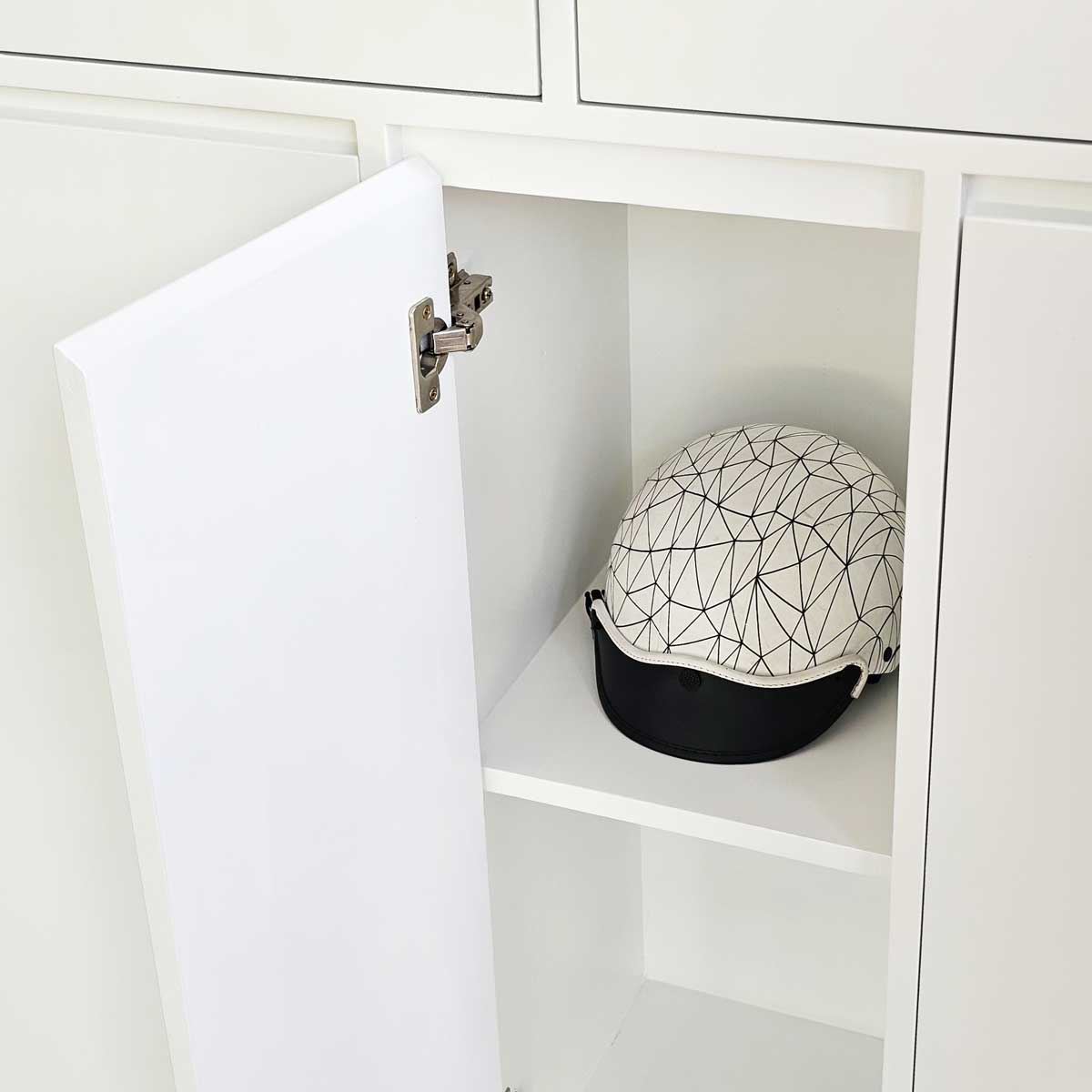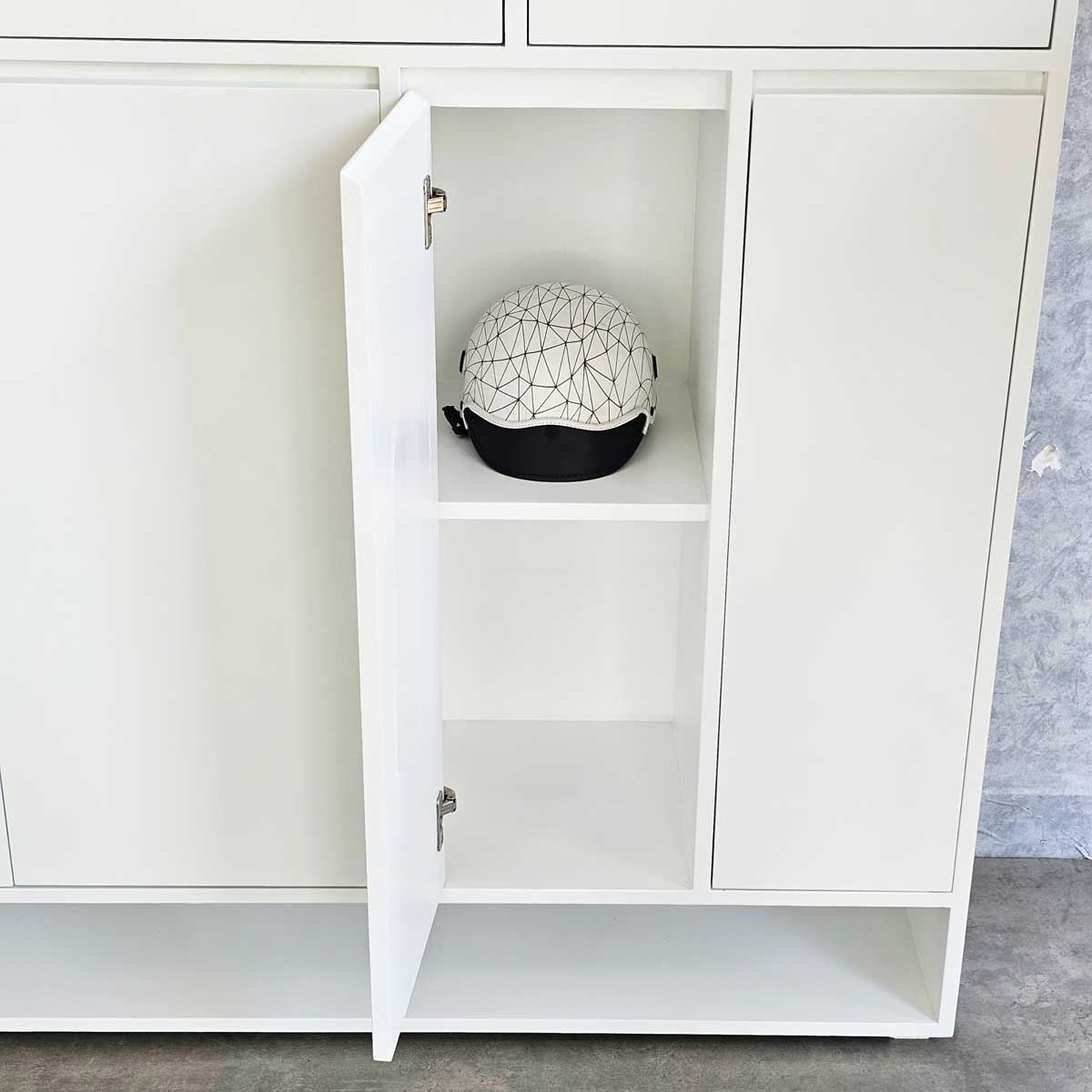 Hộc chính rộng rãi với 4 tầng được thiết kế riêng biệt để cất giữ giày dép một cách gọn gàng, ngăn nắp. Ngăn phụ 2 tầng bên cạnh dành cho mũ bảo hiểm, giúp bạn dễ dàng cất giữ và lấy ra khi cần thiết. Tủ còn tích hợp thêm ngăn treo áo khoác tiện lợi, cùng ngăn dưới cùng để dép đi trong nhà, giúp bạn sắp xếp mọi vật dụng một cách khoa học. Bốn ngăn kéo nhỏ nhắn phía dưới sẽ là nơi lý tưởng để cất giữ những vật dụng linh tinh như dụng cụ đánh giày, móc khóa hay các phụ kiện khác.