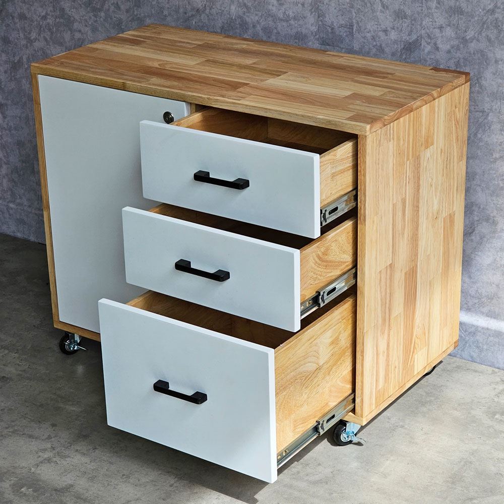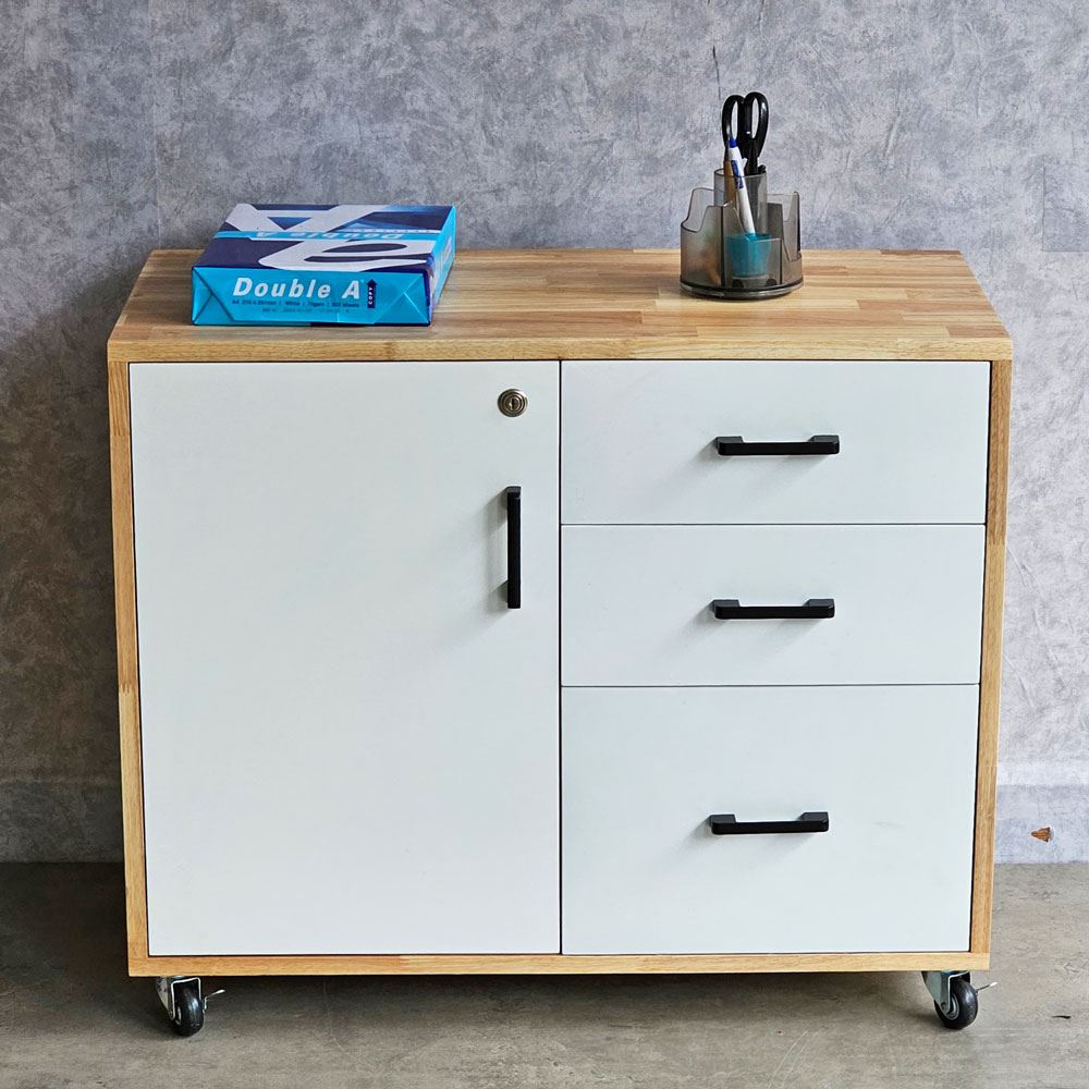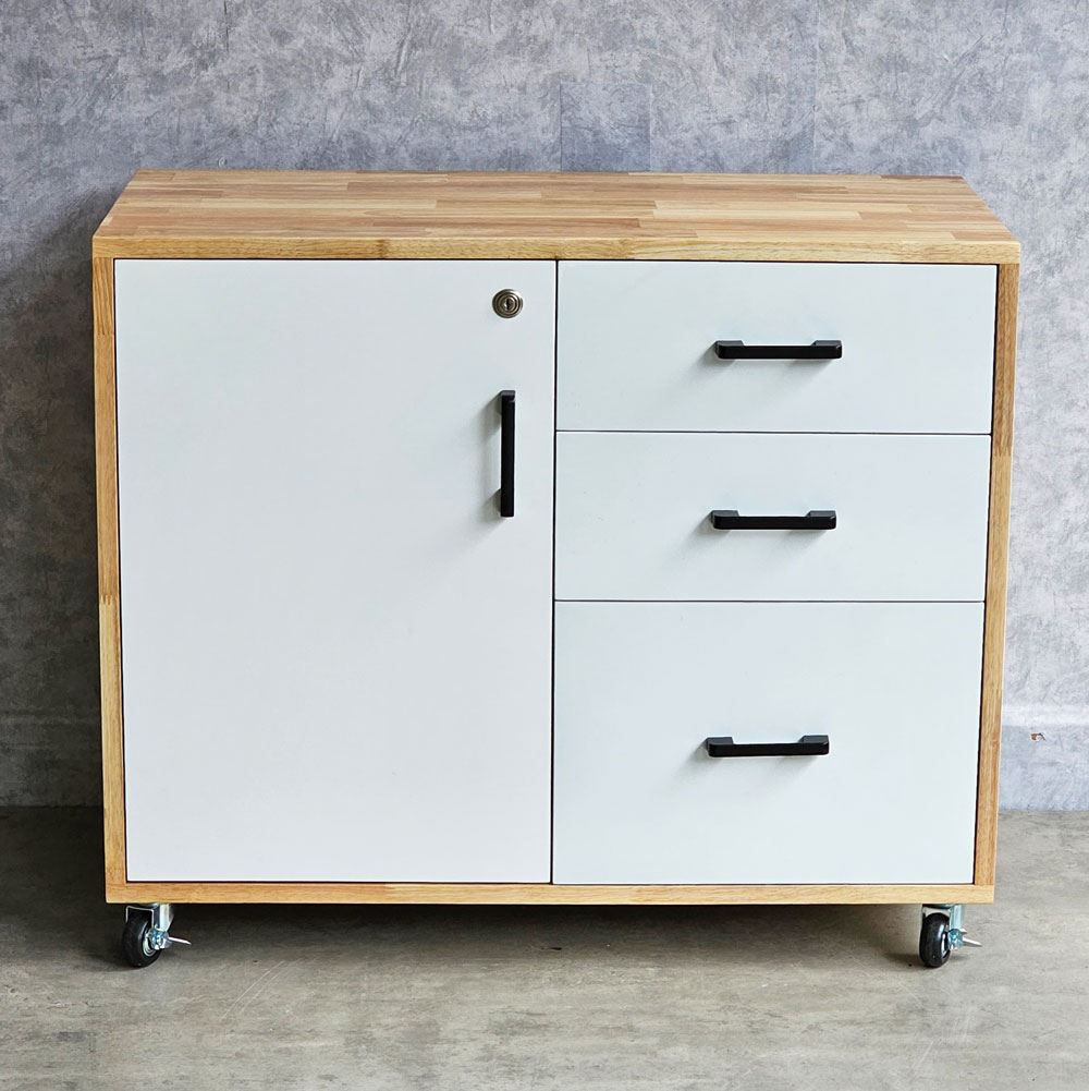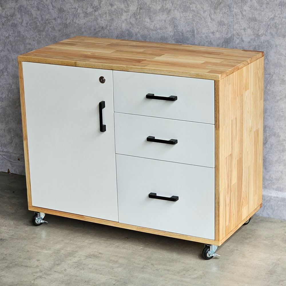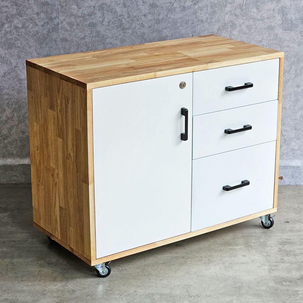 Tủ hồ sơ di động gỗ tự nhiên TCN68029 với chất liệu chính được sử dụng là gỗ cao su AA chuẩn xuất khẩu, đã được xử lý chống cong vênh, bề mặt được sơn phủ PU chống thấm nước rất dễ làu chùi dọn dẹp, có màu sắc tự nhiên đẹp mắt. Thiết kế chia thành 2 phần ( 3 ngăn kéo và hộc tủ chia 2 tầng ) tăng không gian lưu trữ tối đa giúp bạn sắp xếp lại khu vực làm việc một cách tốt hơn, dẽ dàng tìm được mọi thứ mà không sợ bị thất lạc. Bên cạnh đó, tủ trang bị bánh xe có khoá dễ dàng di chuyển khi cần rất tiện lợi.