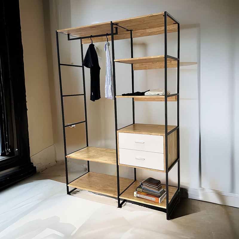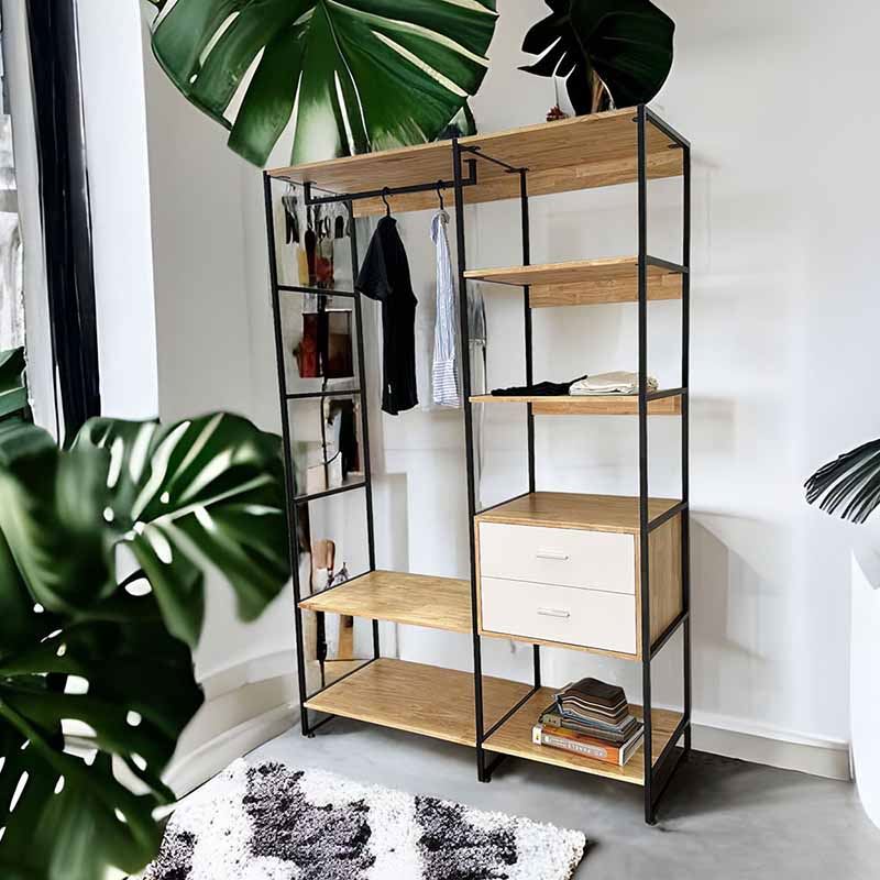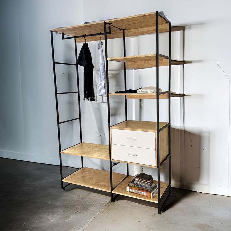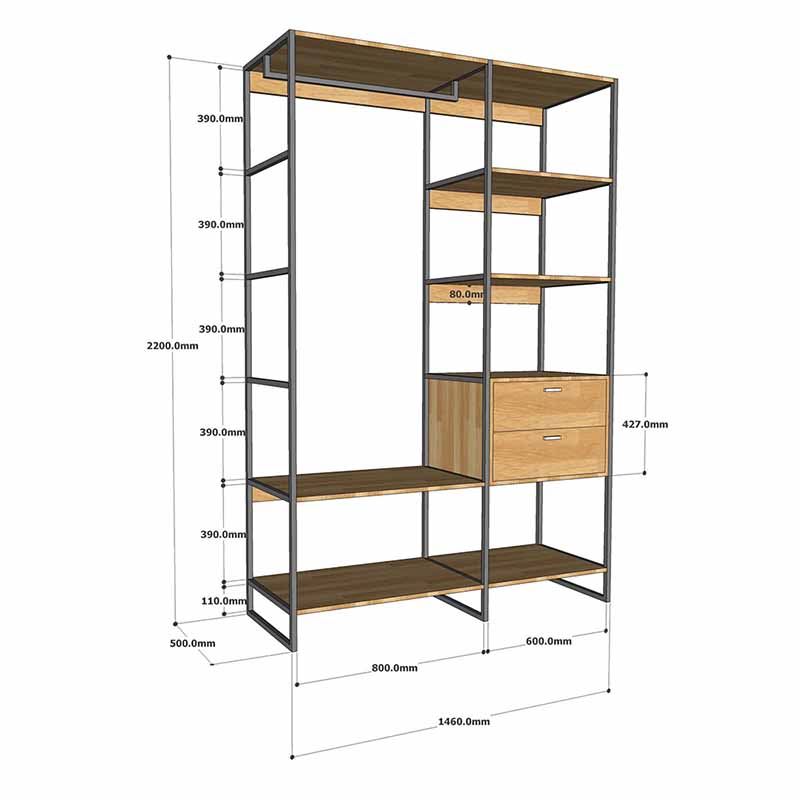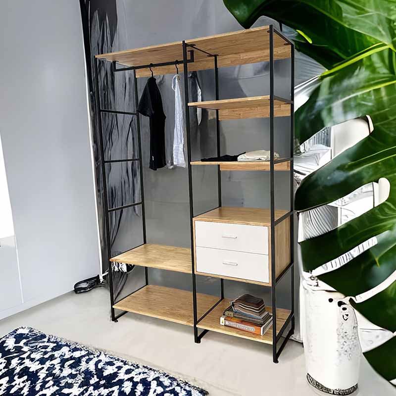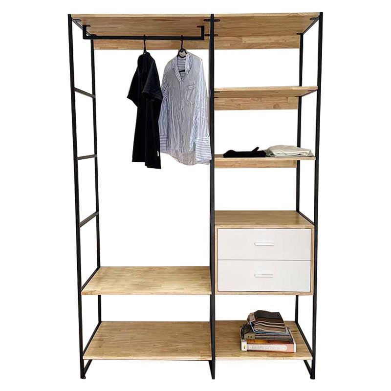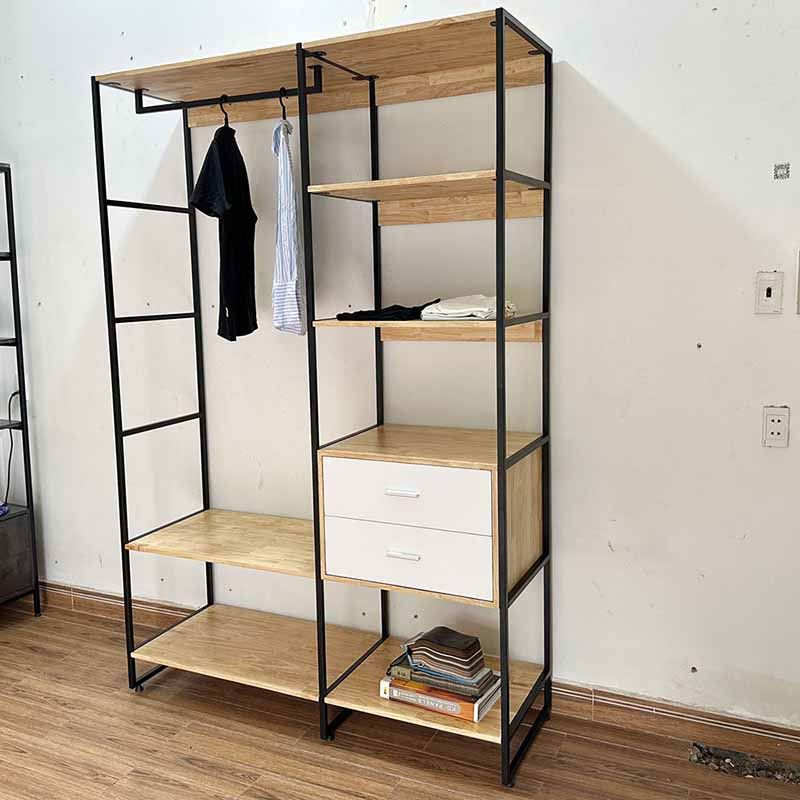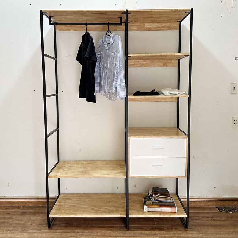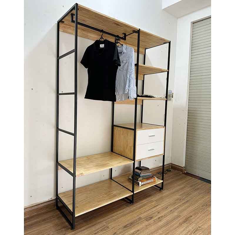 Tủ Kệ quần áo có hộc tủ gỗ cao su khung sắt KQA68058 được thiết kế đơn giản không cửa mở theo phong cách tối giản với chất liệu gỗ cao su tiêu chuẩn AA ưu việt dày 17mm sơn Pu hoàn thiện kết hợp khung sắt hộp gia công sơn tĩnh điện. Thiết kế gồm khung treo đồ đơn giản kết hợp các tầng cùng hộc kéo được phân chia hợp lý, thông minh giúp không gian điện tích được sử dụng tối đa.