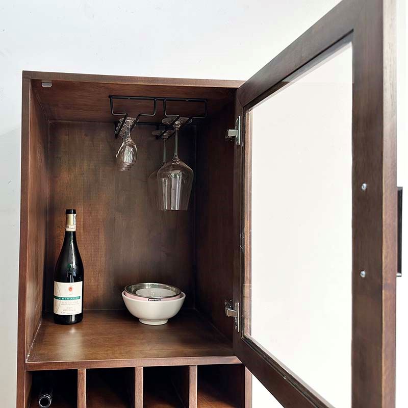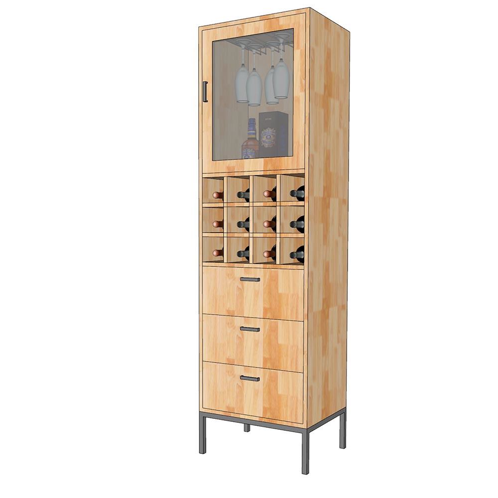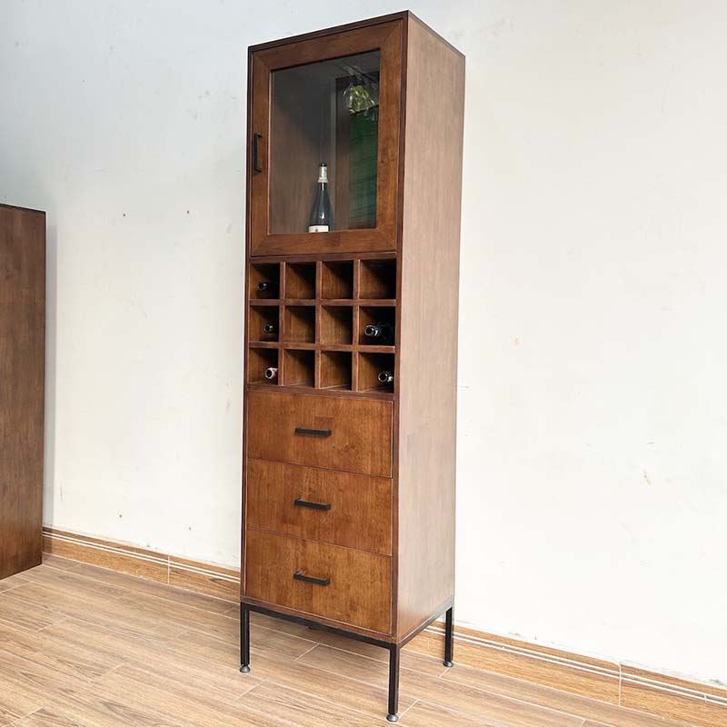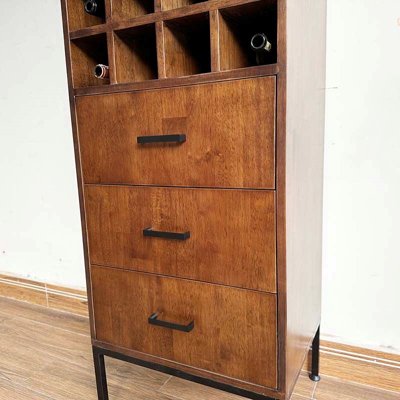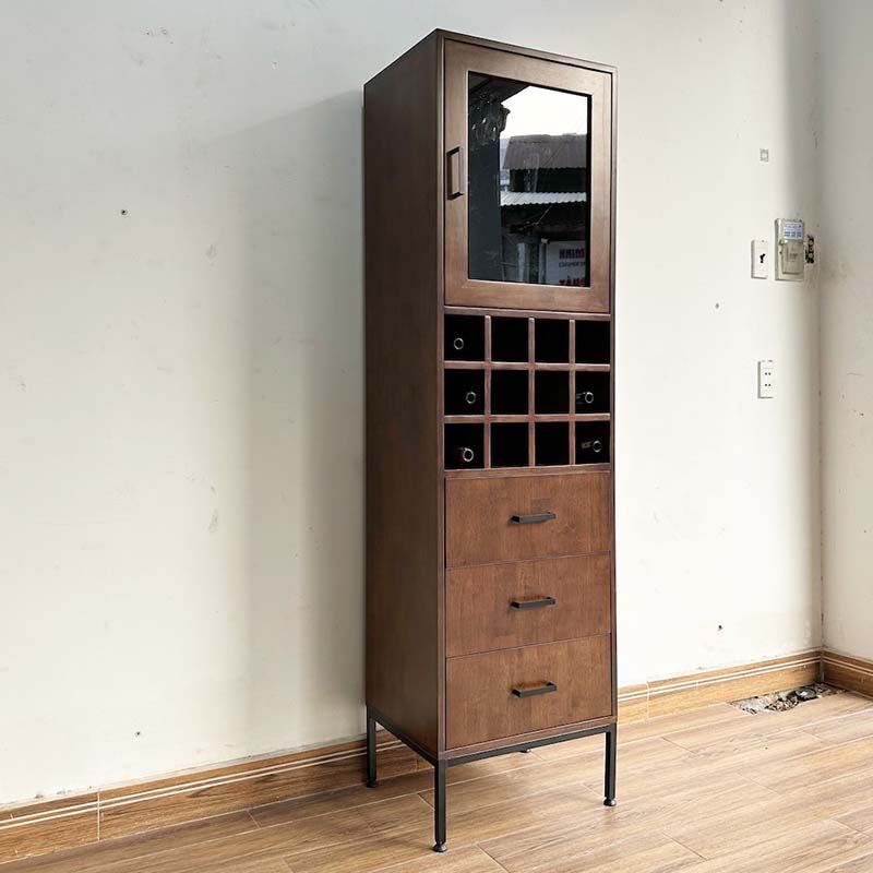 Tủ rượu gỗ cao su chân sắt TAP014 với thiết kế thông minh với hộc tủ phía trên chia 2 tầng và 3 hộc tủ phía dưới kết hợp các ngăn đựng rượu ở giữa giúp bạn lưu trữ hay trưng bày các món đồ của mình một cách dễ dàng hơn, sự kết hợp hài hoà của chất liệu sắt và gỗ toát lên vẻ đẹp hiện đại phù hợp với không gian phòng ăn hay nhà bếp nhà ở hay các căn hộ cư hiện nay.