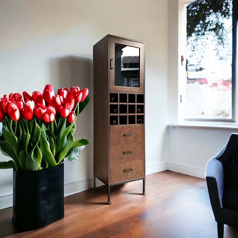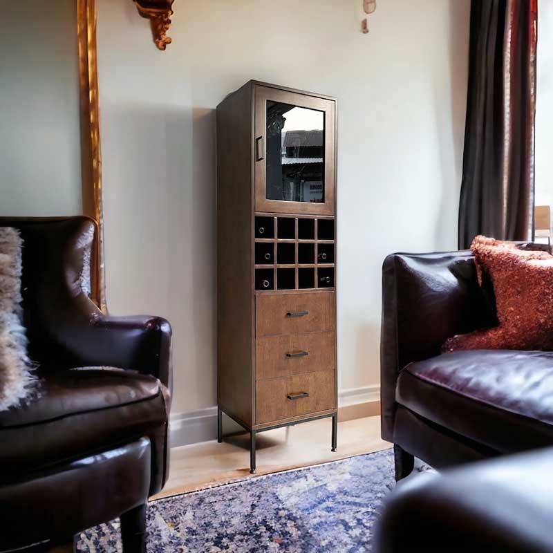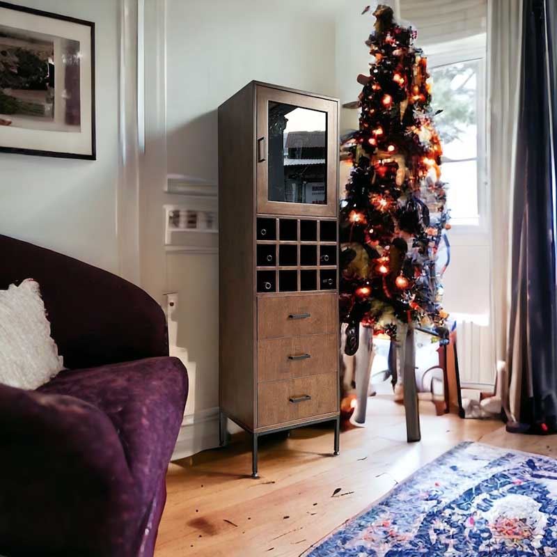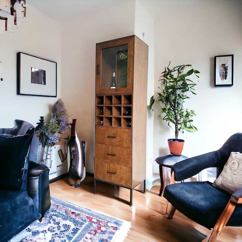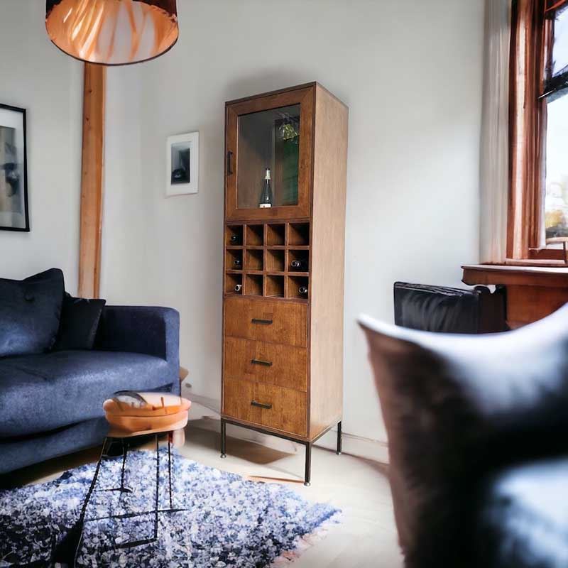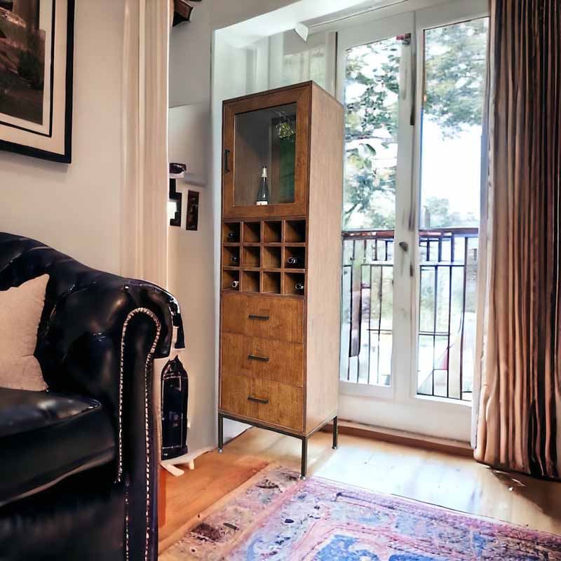 Tủ rượu gỗ cao su chân sắt TAP014 với thiết kế thông minh với hộc tủ phía trên chia 2 tầng và 3 hộc tủ phía dưới kết hợp các ngăn đựng rượu ở giữa giúp bạn lưu trữ hay trưng bày các món đồ của mình một cách dễ dàng hơn, sự kết hợp hài hoà của chất liệu sắt và gỗ toát lên vẻ đẹp hiện đại phù hợp với không gian phòng ăn hay nhà bếp nhà ở hay các căn hộ cư hiện nay.